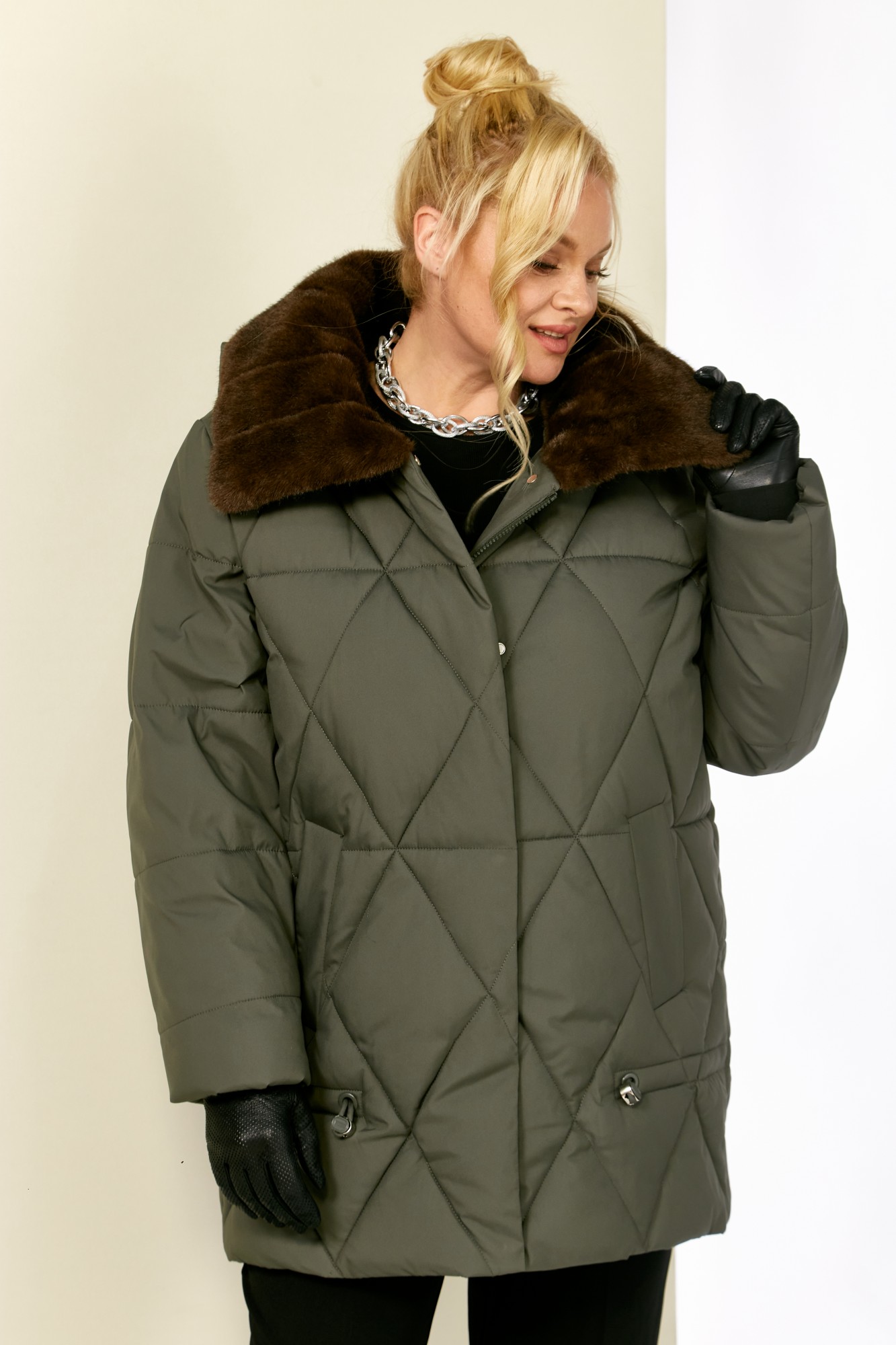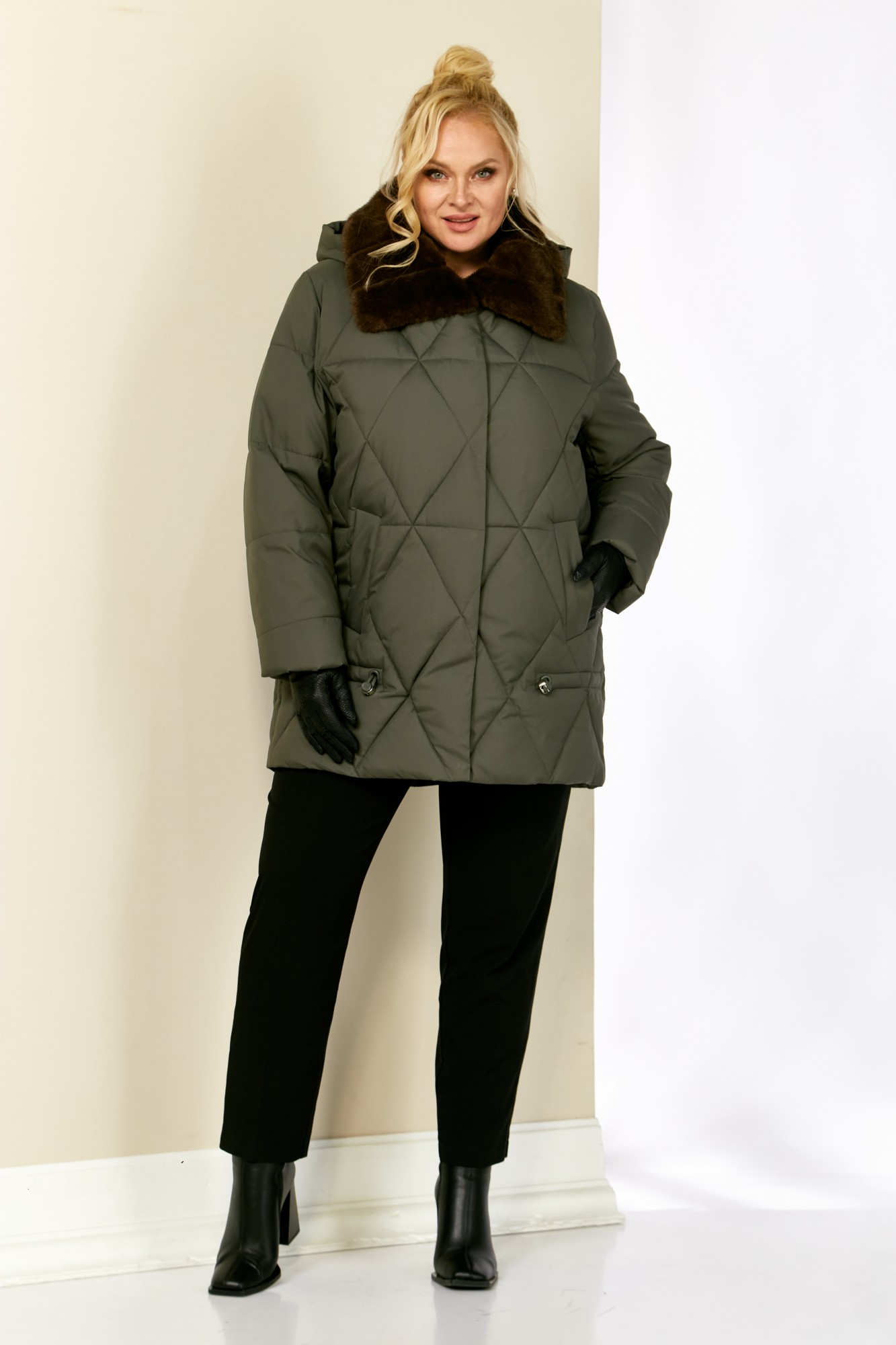 Зимняя, модная женская куртка, которая идеально подойдет для холодных дней, обеспечивая комфорт и защиту от ветра. Изделие прямого, классического стиля, выполнена из курточной матовой ткани высокого качества, непромокаемая. Утеплитель «Холлофайбер» хорошо держит форму и не сбивается. По переду центральная застежка на молнии и металлические кнопки. Карманы прорезного типа на магнитах. Нижняя часть изделия регулируется декоративным шнуром. Рукав втачной. Для защиты от ветра и мороза, рукава по низу дополнены внутренними трикотажными манжетами. Воротник отделан мехом, максимально по внешнему виду приближенный к натуральному «Норка». Капюшон съемный, регулируется декоративным шнуром.  Спинка цельная.
