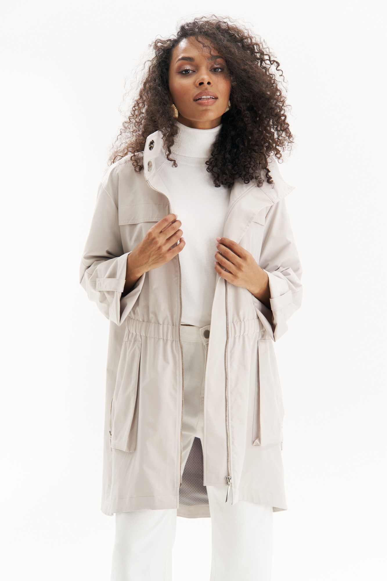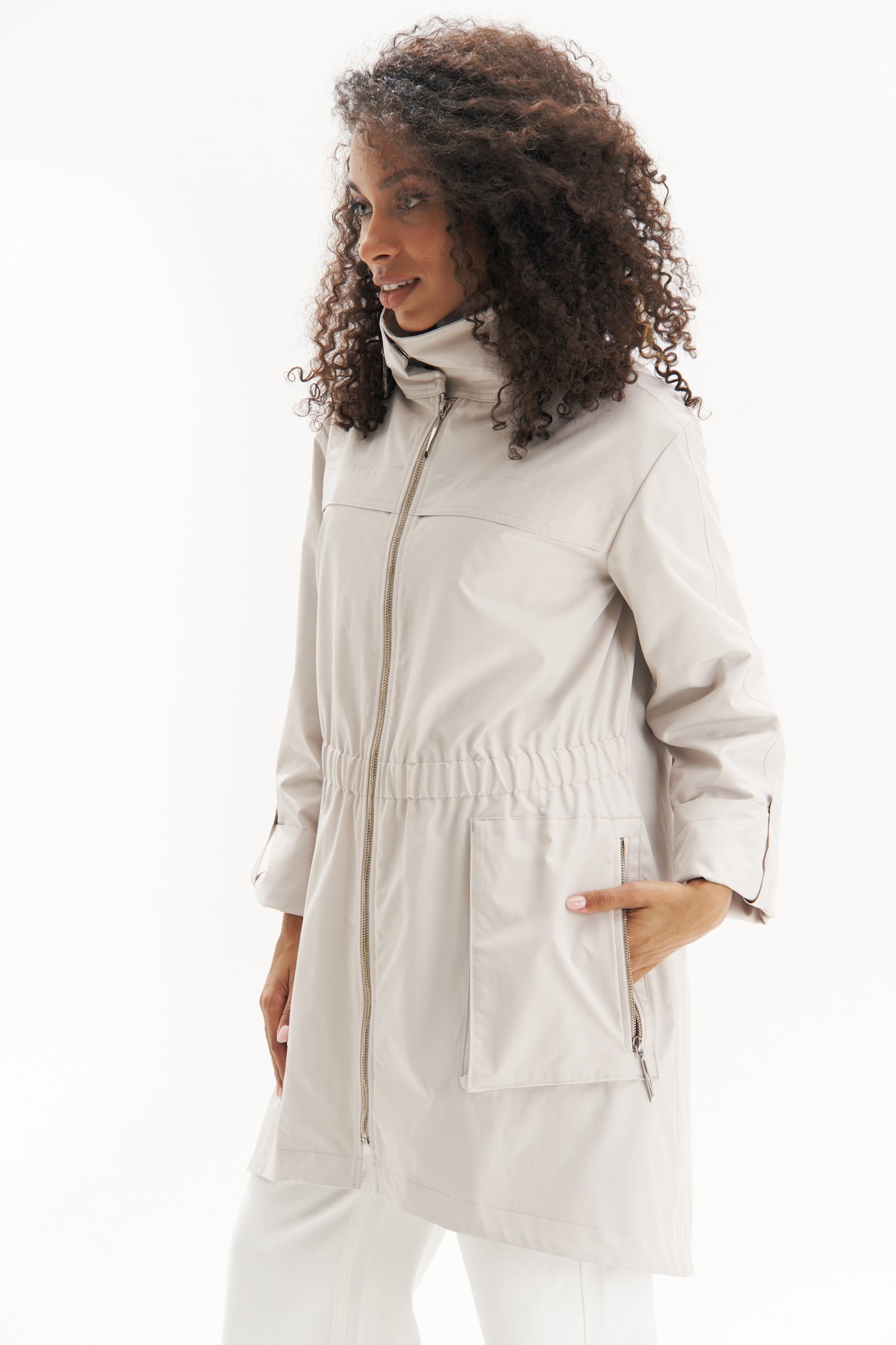Эта легкая куртка – идеальный баланс между стилем и комфортом. Выполненная в универсальном светлом оттенке, она придает образу свежесть и элегантность, а свободный силуэт с утяжкой на талии подчеркивает фигуру, создавая женственный силуэт. Эта куртка станет стильной основой для любого весенне-осеннего гардероба! Куртка женская прямого силуэта, из плащевой ткани, на подкладке, с центральной бортовой застежкой на металлическую тесьму - «молнию» (размер и цвет фурнитуры может незначительно отличаться от фото), для повседневной носки. Перед с надстрочной с изнанки кулисой с резинкой на уровне талии. На нижней части переда настрочены накладные объёмные карманы, застегивающиеся на металлическую тесьму - «молнию». На верхней части переда и спинки обработаны отлетные горизонтальные отлетные планки шириной 4,0 см. Левая часть переда с внутренней ветрозащитной планкой. Рукава втачные, двухшовные, длинные. Верхний шов рукава с пришивной кнопкой. Низ рукава может застёгиваться на хлястик с пришивной потайной кнопкой, тем самым укорачивается длина рукава до 7/8. Горловина обработана широким воротником стойкой, со смещённой относительно центра переда застёжкой на 2 потайные пришивные кнопки. Так же на верхнем воротнике обработан карман, застёгивающийся на металлическую тесьму - «молнию», в котором прячется капюшон. Низ куртки обтачной, перед незначительно короче спинки. По низу куртки прострочена отделочная строчка шириной 3,5см.