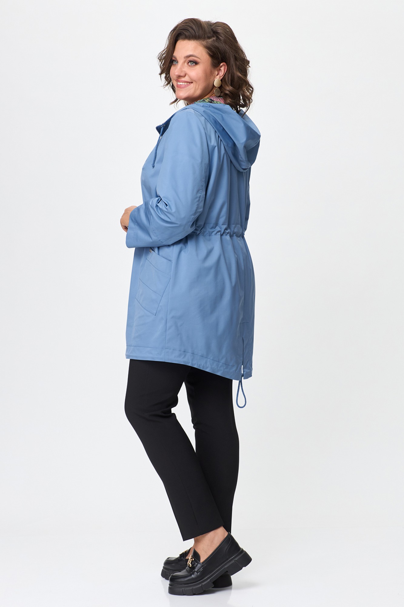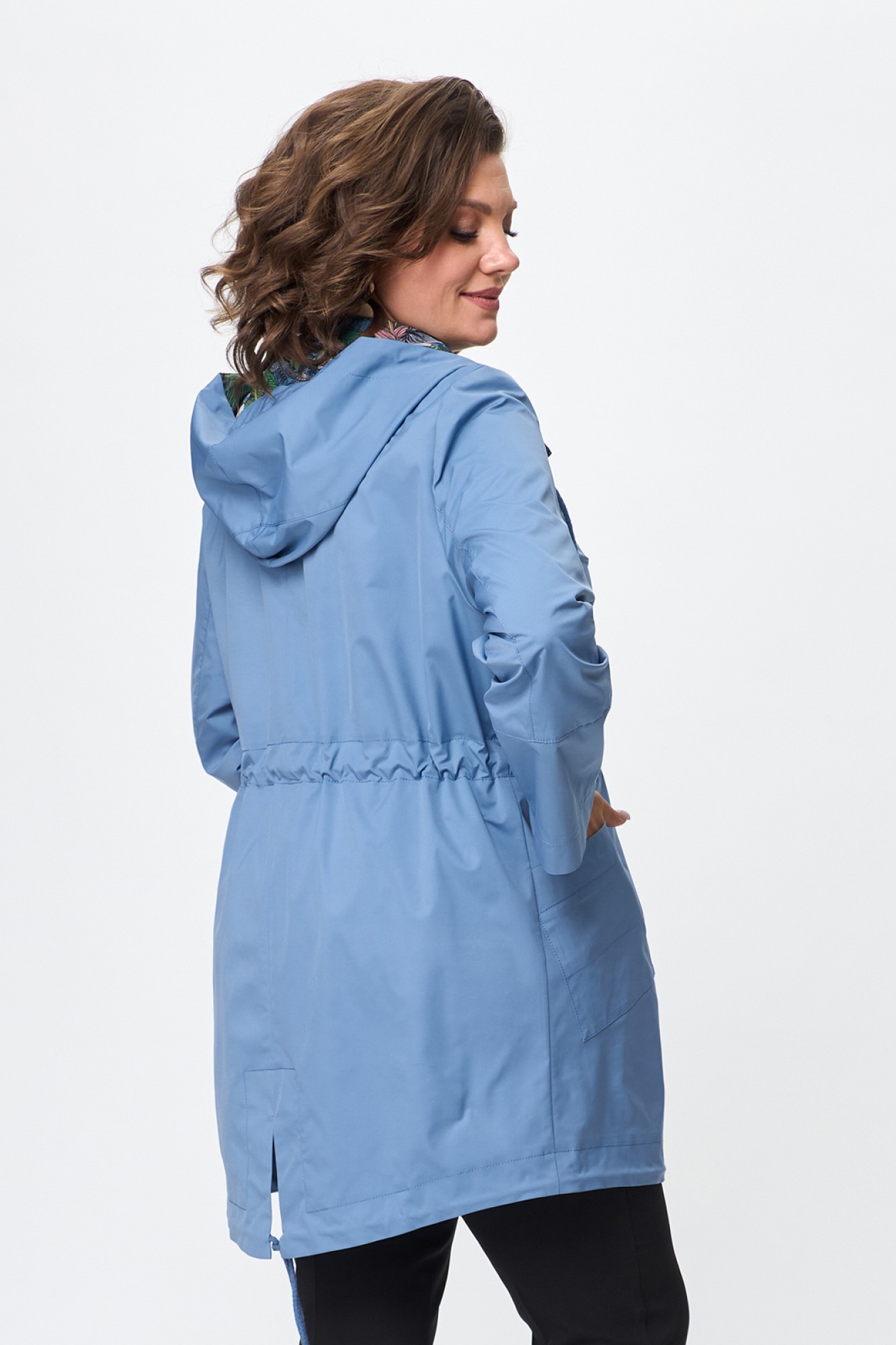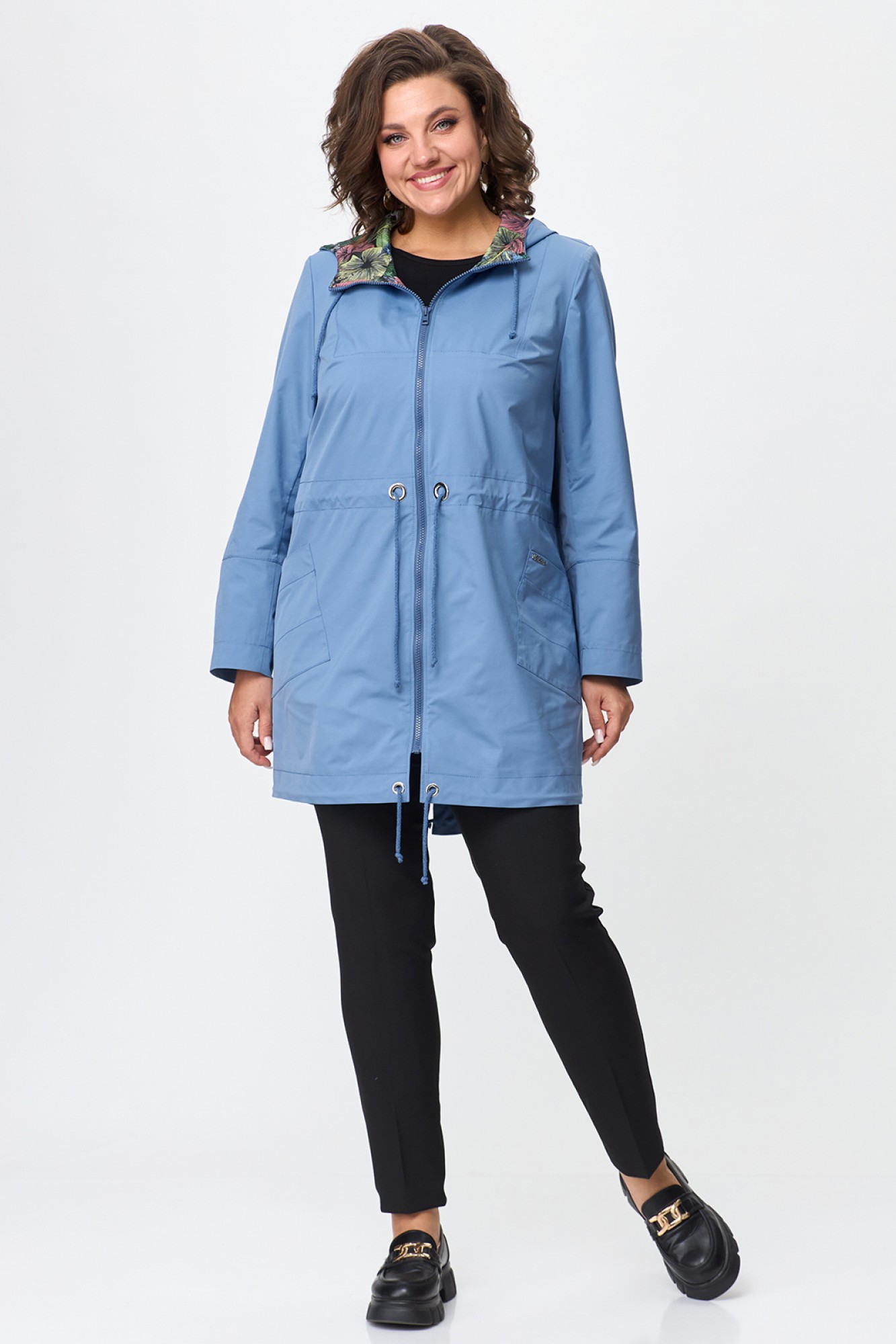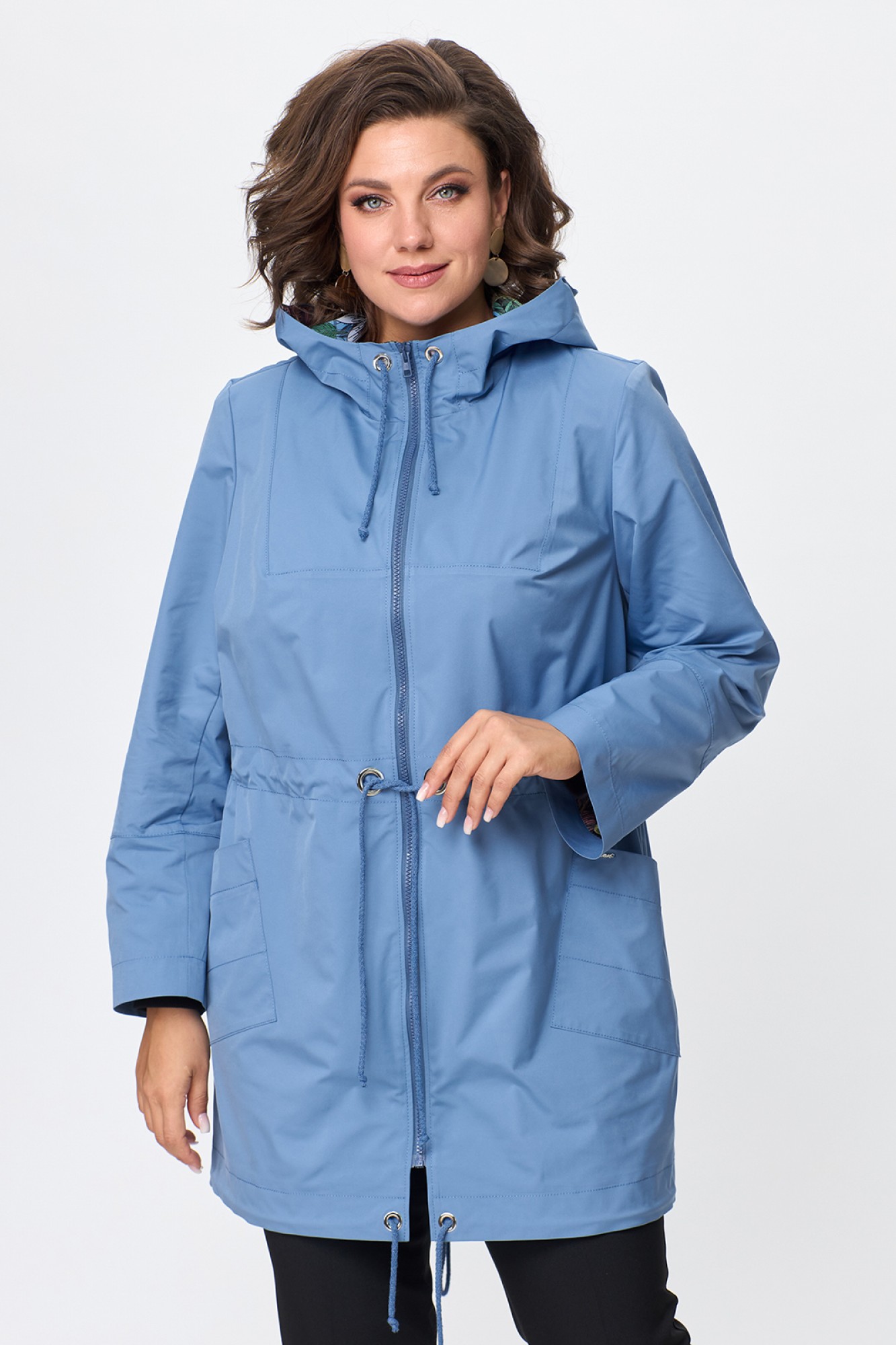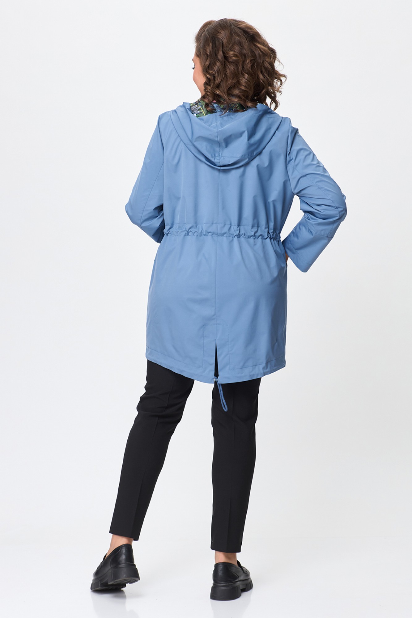 Женская куртка-парка с капюшоном. Капюшон не съемный. Силуэт куртки прямой, по талии - кулиска со шнуром. Застежка центральная на тракторную молнию. Спереди накладные карманы. Низ фигурный, также с кулиской. Спинка изделия со средним швом, заканчивающимся разрезом. Длину рукава можно регулировать манжетой. Без подкладки, без утеплителя. Продуманный и лаконичный дизайн куртки сделает ее любимой вещью в вашем гардеробе.