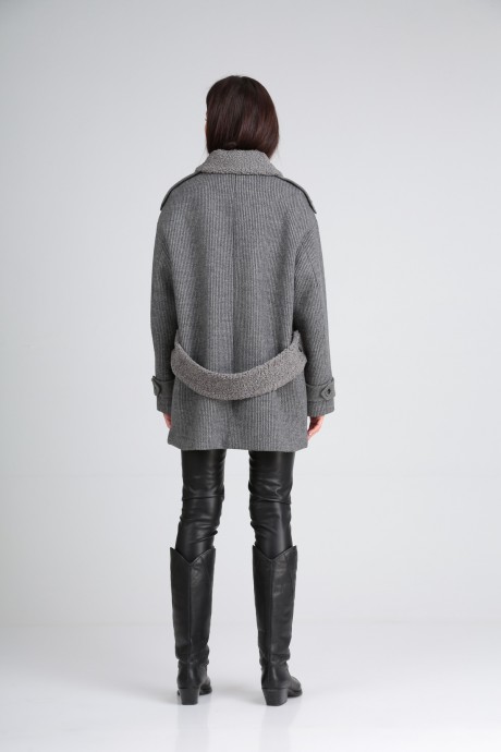 Полупальто женское полуприлегающего силуэта, с центральной застёжкой на пришивные кнопки. Линия плеча спущена, рукав втачной 2-шовный с отделочным хлястиком по низу(фиксируется петлёй и пуговицей). По переду накладные карманы с клапаном , по спинке средний шов;на плечевых - погоны(фиксируются петлёй и пуговицей). По спинке съёмный отделочный пояс(фиксируется петлёй и пуговицей). Используется три вида ткани. Пальто на подкладке.