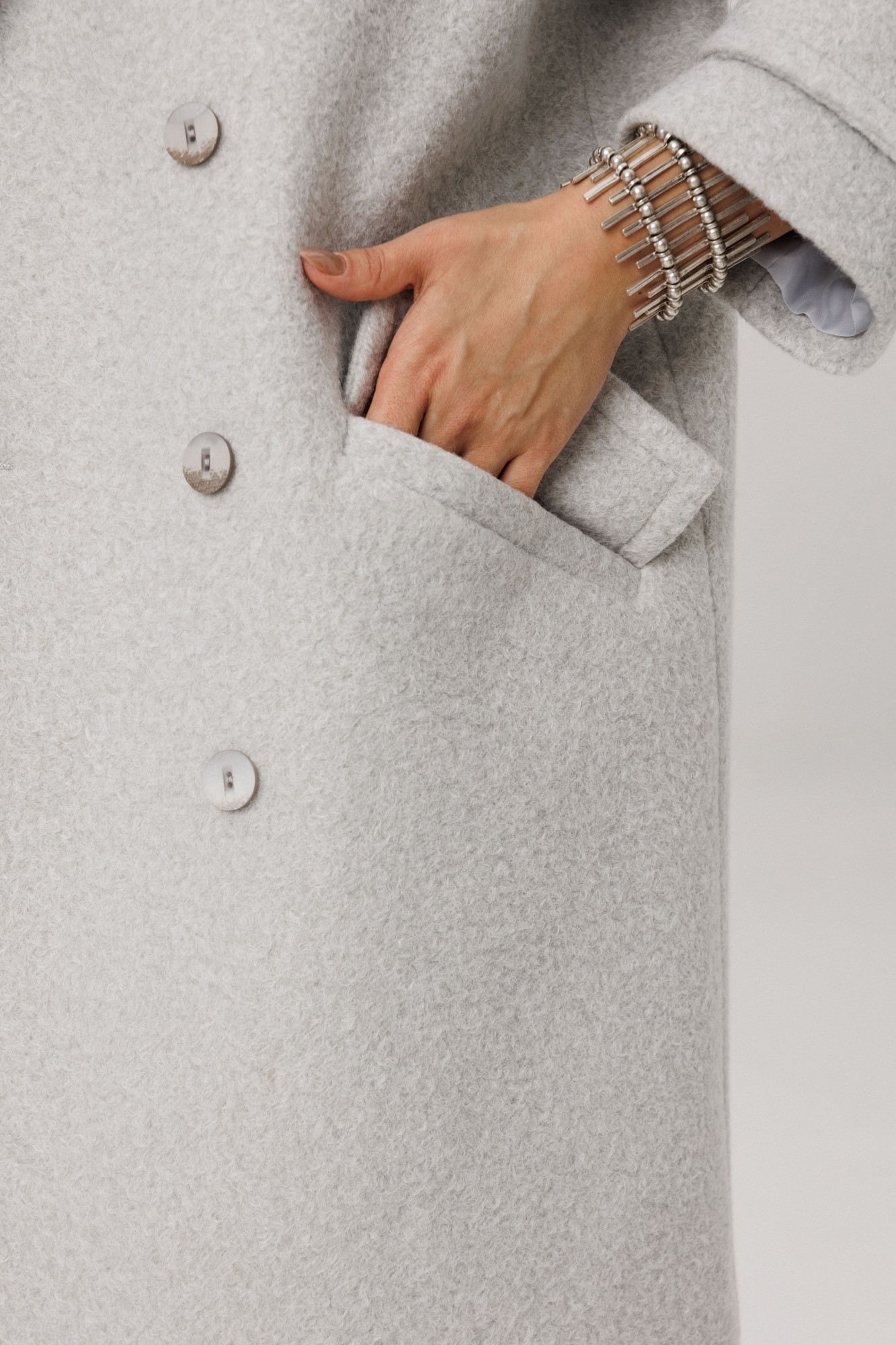 Модель оверсайз со спущенным плечом создана для тех, кто ценит свободу движений и непринужденную элегантность. Двубортный крой придает жакету особый шарм, а паты на рукавах со скосом — изысканную деталь, которая привлекает внимание. Карманы с клапанами добавляют функциональности, сохраняя при этом общий утончённый образ.