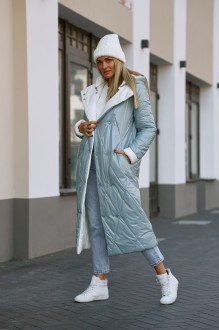 Пальто женское зимнее двухстороннее, двухцветное из плащевой ткани с лаковым покрытием, на утеплителе нового поколения "изософт". Прямого силуэта, слегка заужено к низу, двубортное, застегивается спереди на кнопки. Воротник - стойка, рукав втачной с отложной манжетой по низу, по переду в швах - карманы, пальто с капюшоном на молнии. Рекомендуется носить при температуре -10 и до -20 градусов.