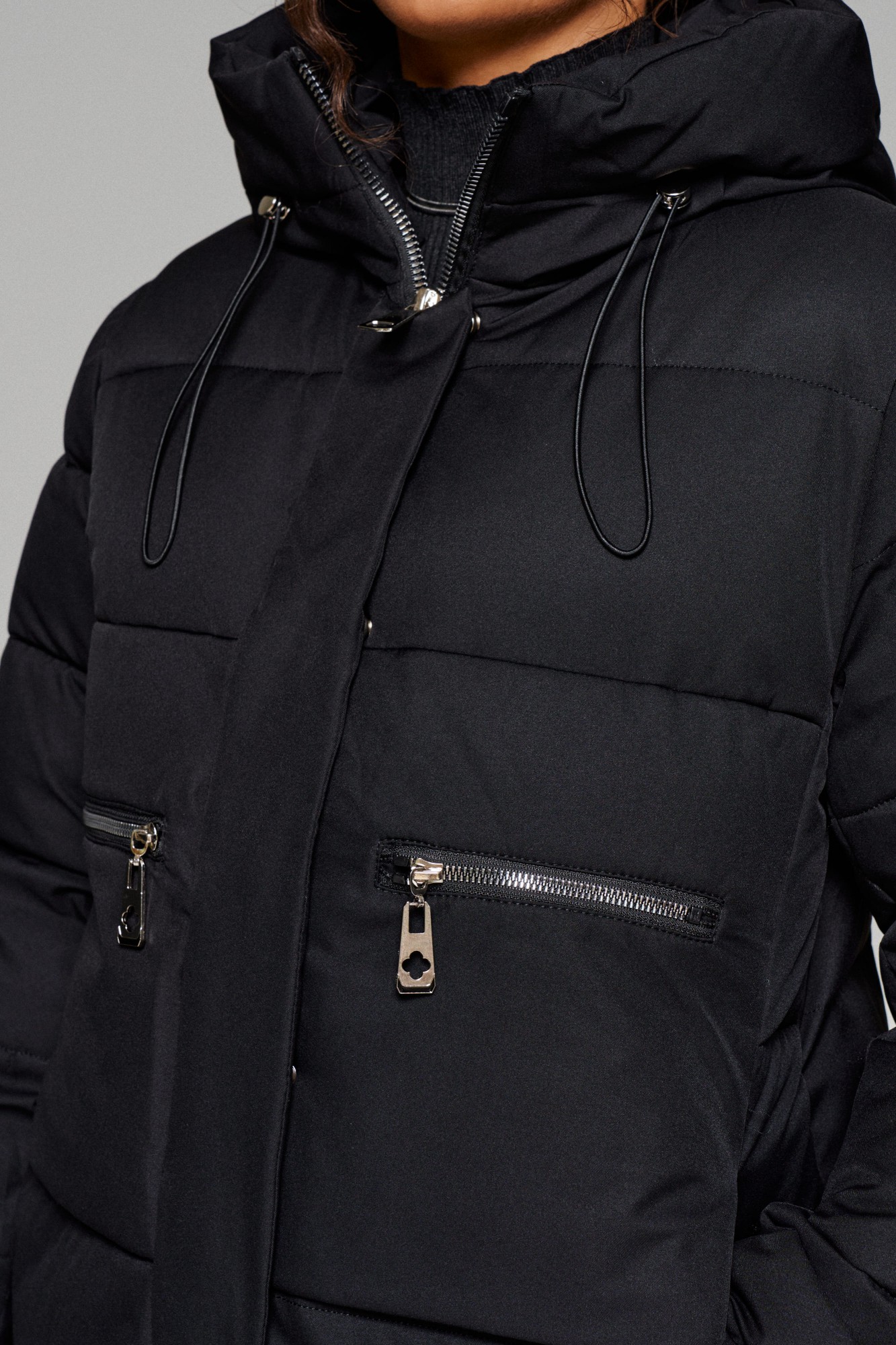 Пальто выполнено из стёганной, достаточно прочной и приятной на ощупь влагостойкой, полиэфирной ткани; на синтетической подкладке. Утеплитель из холлофайбера 250 г/м.кв., подходит для холодной осени и зимы. Изделие рассчитано на температурный режим от -10 до -25 градусов.