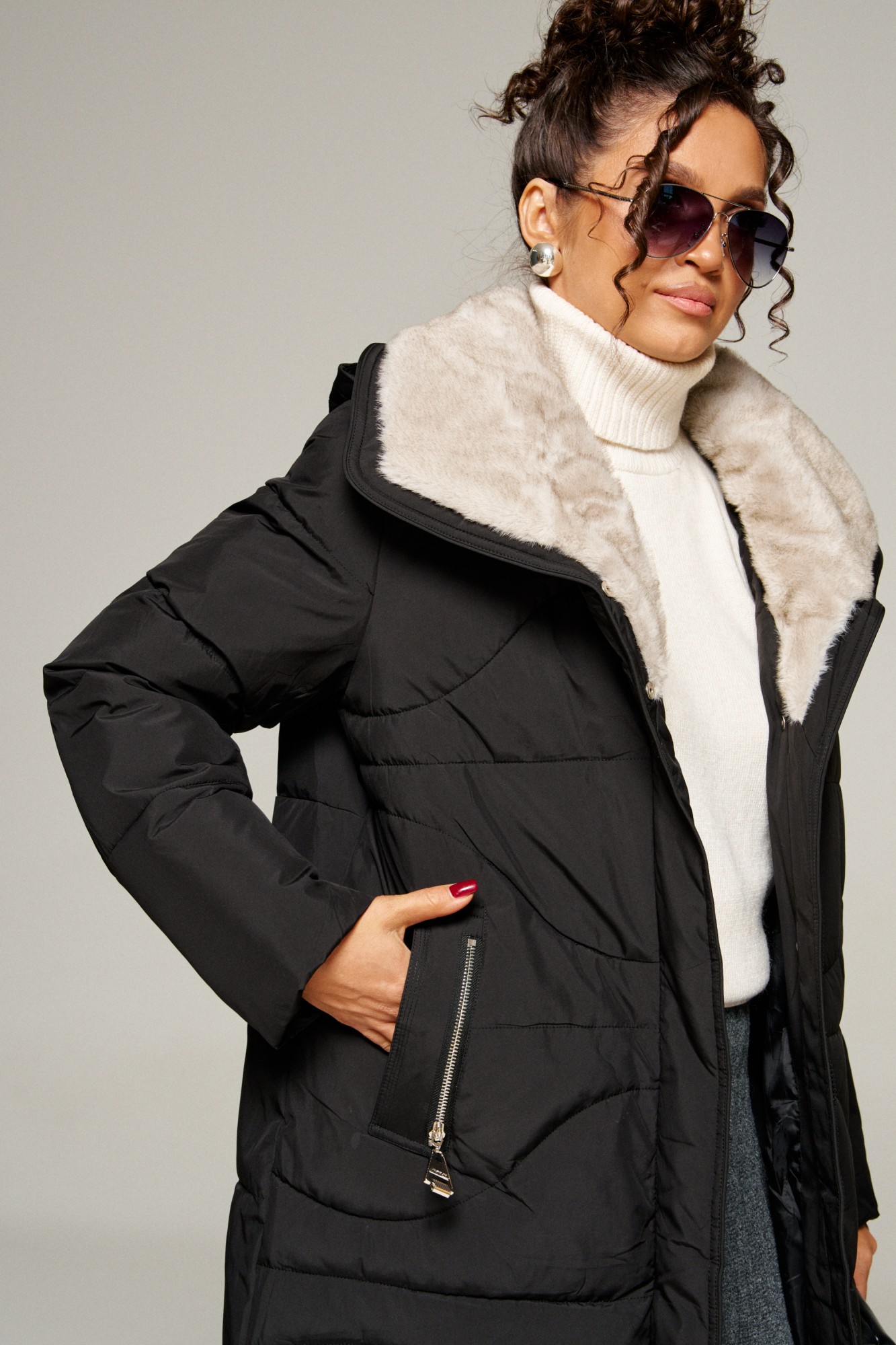 Воротник тип «апаш» с возможностью застегивания до верха. Внутренняя часть воротника обработана искусственным мехом «норка».
