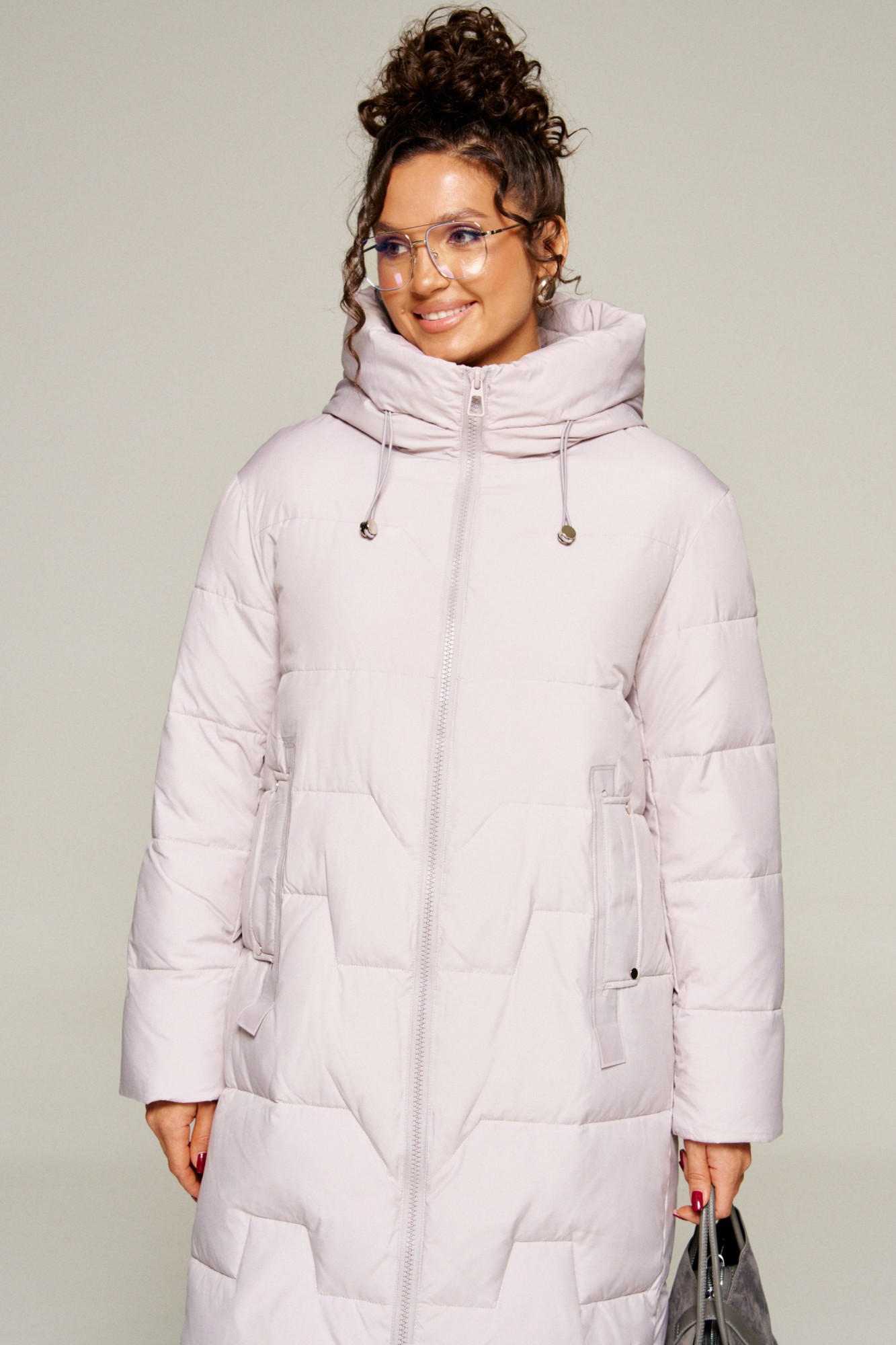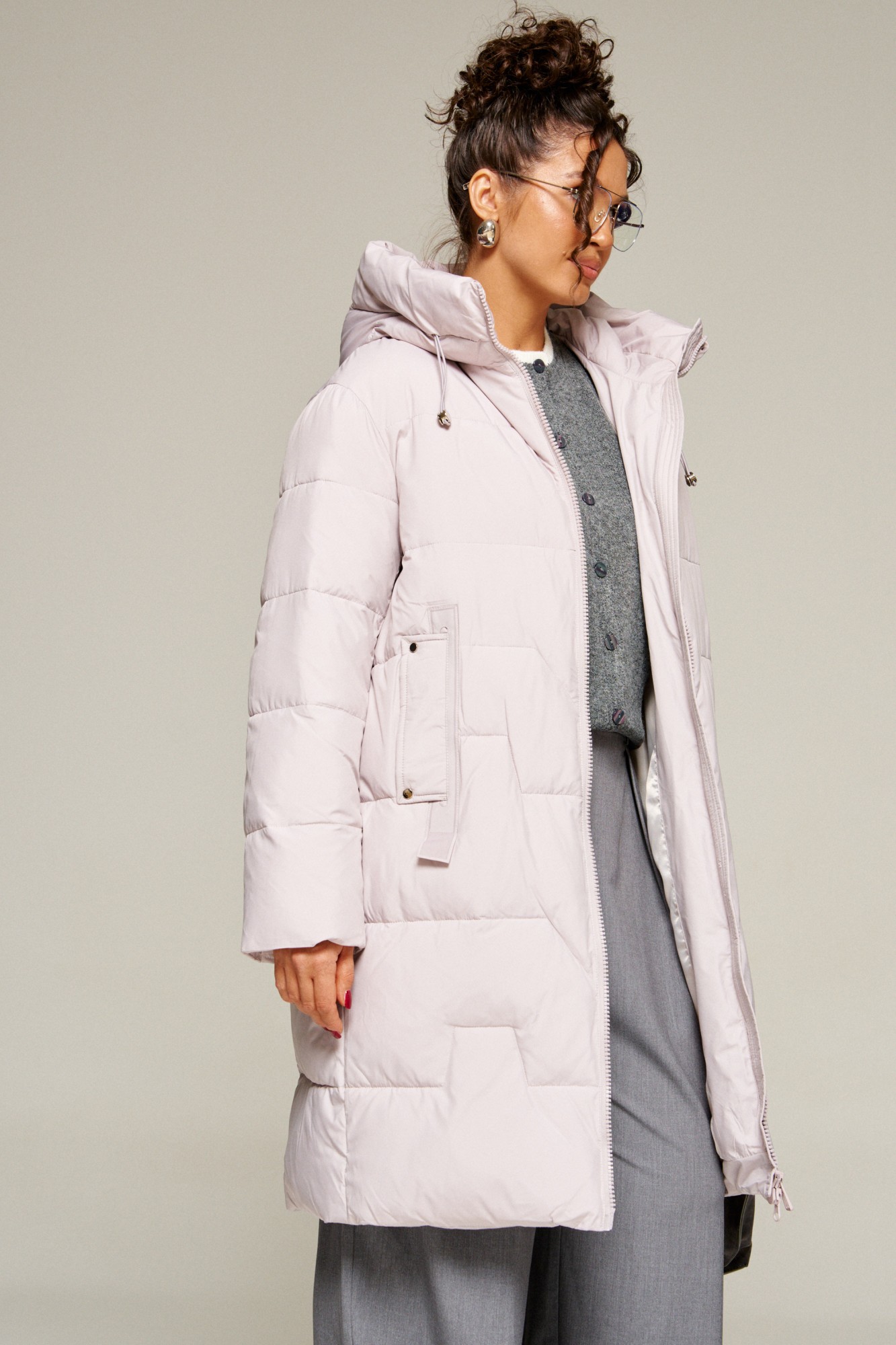 Капюшон умеренного объема, застегиваемый спереди. По периметру капюшона вставлен шнур в цвет изделия с декоративными фиксаторами.