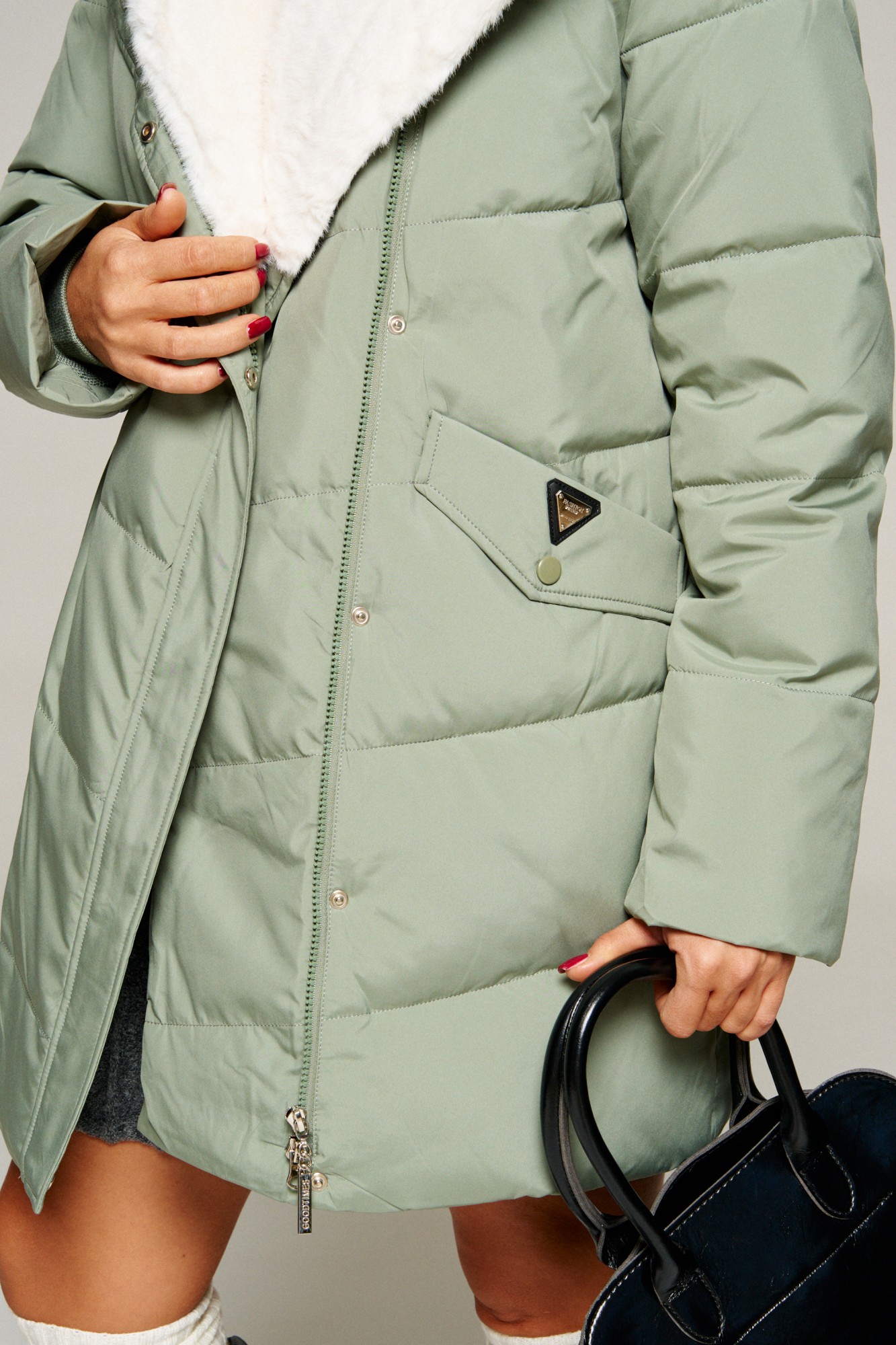 Воротник пиджачного типа с возможностью застегивания до верха. Внутренняя часть воротника и лацканы обработаны искусственным мехом.