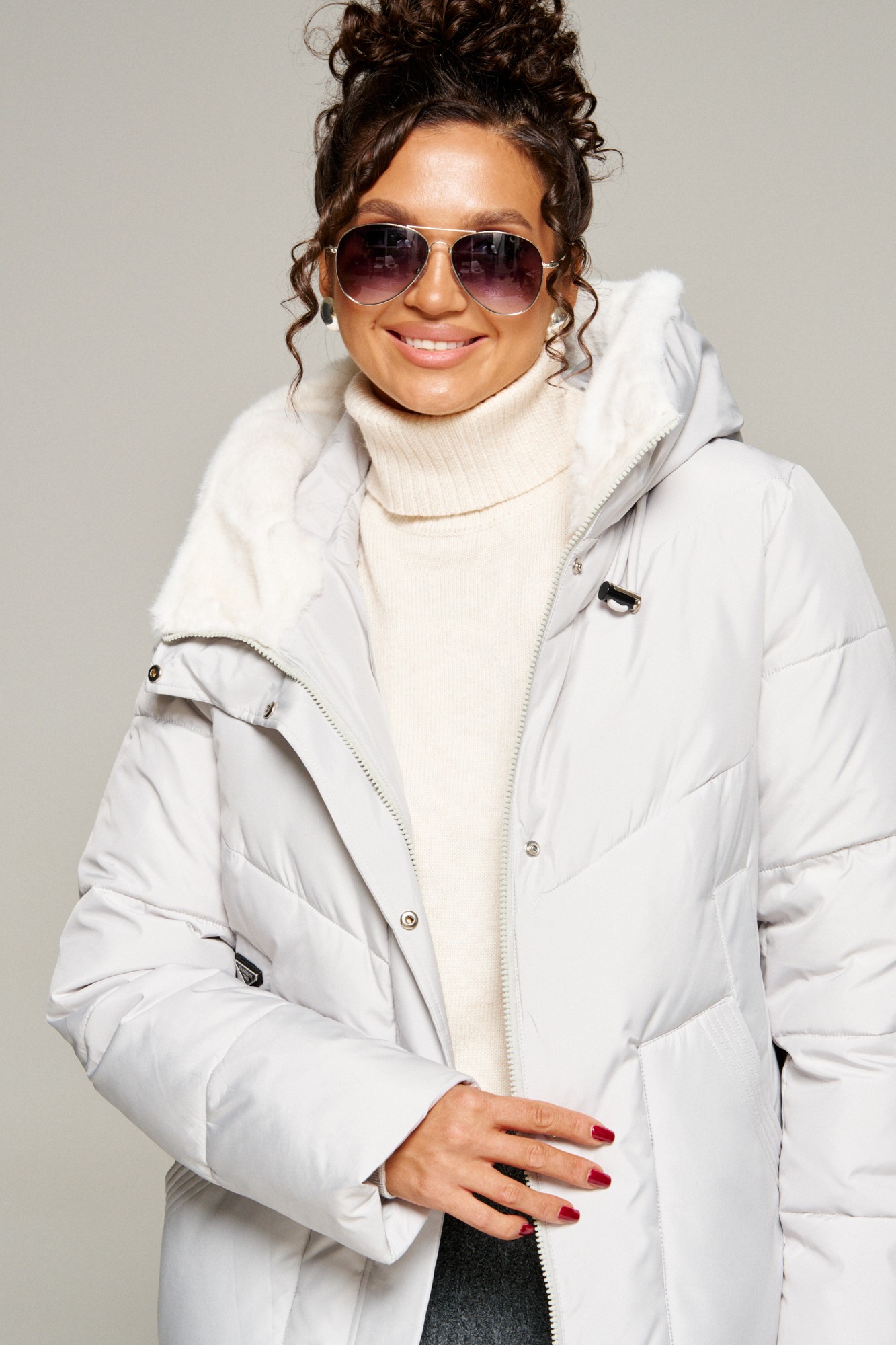 Капюшон с застежкой спереди умеренного объема. По периметру капюшона с внутренней стороны выполнена оторочка из искусственного меха, которая выполняет декоративную и защитную функции, создавая дополнительное тепло и защиту от ветра и холода.
