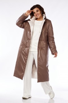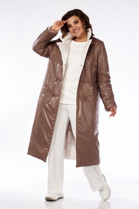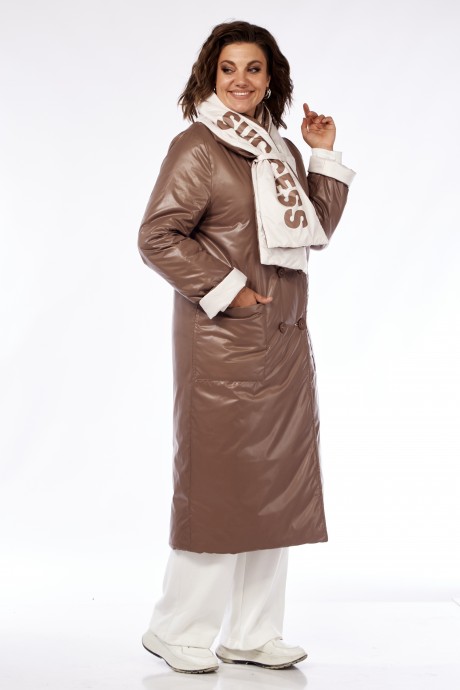 Пальто женское прямого силуэта с двубортной застежкой на 6 пуговиц. Пальто двухстороннее. Светлая сторона выстегана синтепоном, перед с боковыми прорезными карманами с листочкой. На темной-накладные карманы. Рукав втачной, двухшовный. Воротник стояче-отложной с лацканами прямой формы. Пояс двухсторонний, по светлой стороне украшен печатью. По краю борта и воротнику отделочная строчка 0,5 см. Шарф двухсторонний со шлевкой и печатью.