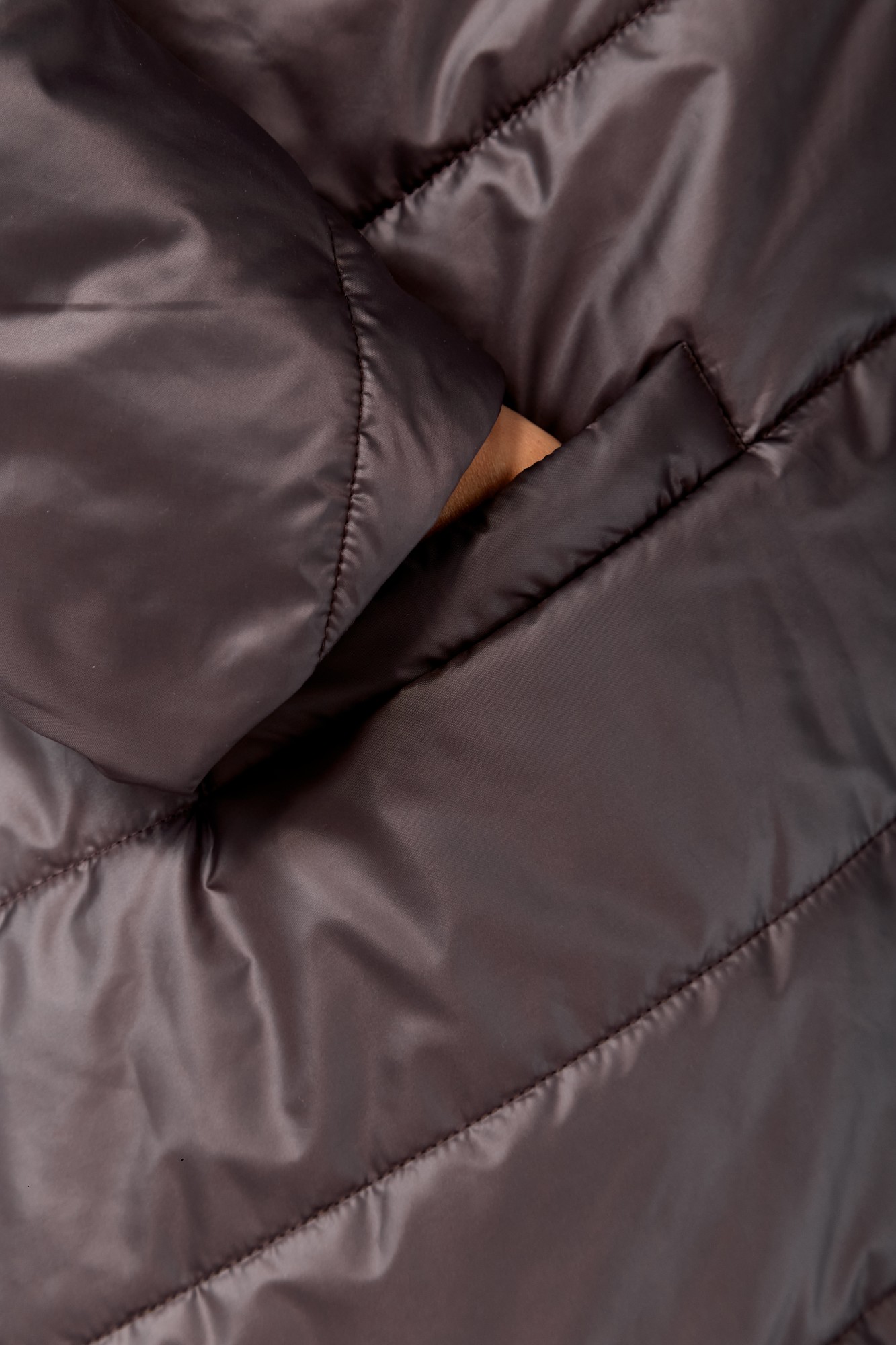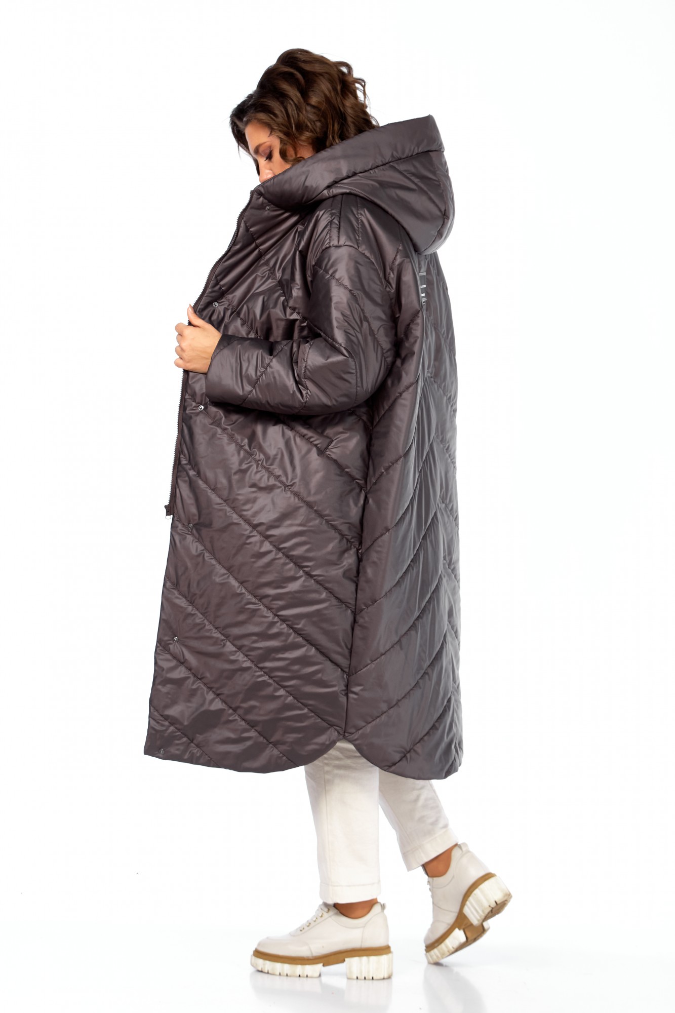 Пальто женское, прямого силуэта со смещенной застежкой на молнию (внутренняя) и кнопки. Линия плеча спущенная, рукав втачной одношовный. По переду карманы с личточкой. По спинке средний шов. Капюшон с центральной частью и отделочной деталью по отлету. В качестве отделки используется фурнитура и детали. Утеплитель- синтепон 150 гр.