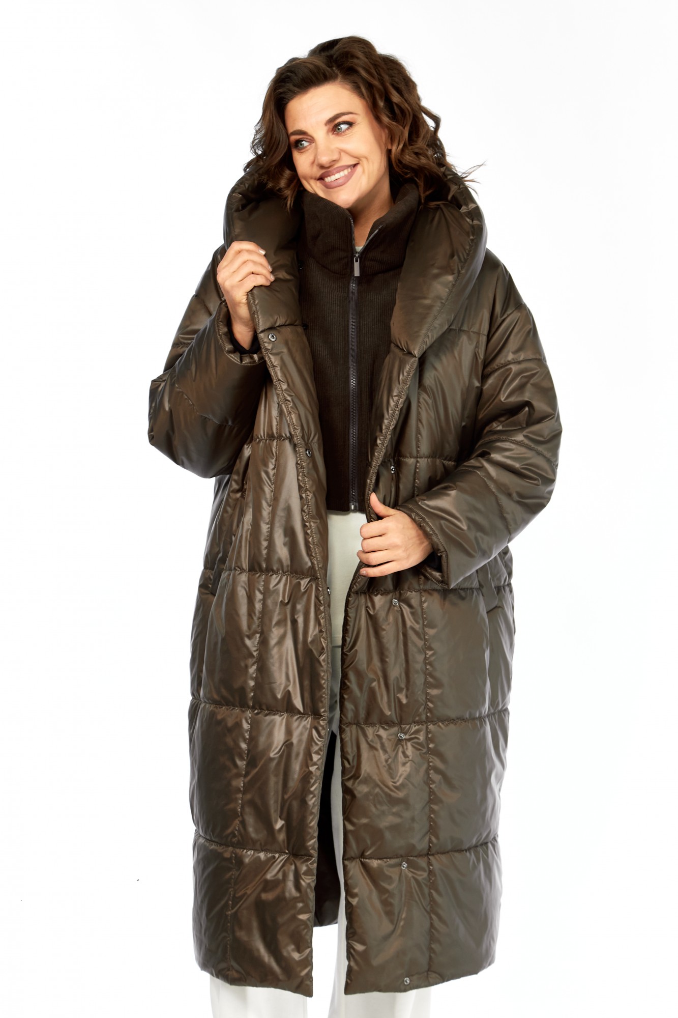 Пальто женскоеполуприлегающего силуэта со смещенной застежкой на кнопки. По переду прорезные карманы с листочкой. Рукав втачной одношовный с притачным манжетом по низу из отделочной ткани (довяз). Капюшон с объемный отделочной деталью по отлету, по горловине переда заложены складки. В качестве отделки используется манишка съемная с застежкой на тесьму-молнию (из отделочной ткани) фиксируется с помощью пуговиц и навесных петель-резинок на изделии. Используется утеплитель синтепон 200. Подходит под температурный режим до -10 градусов.