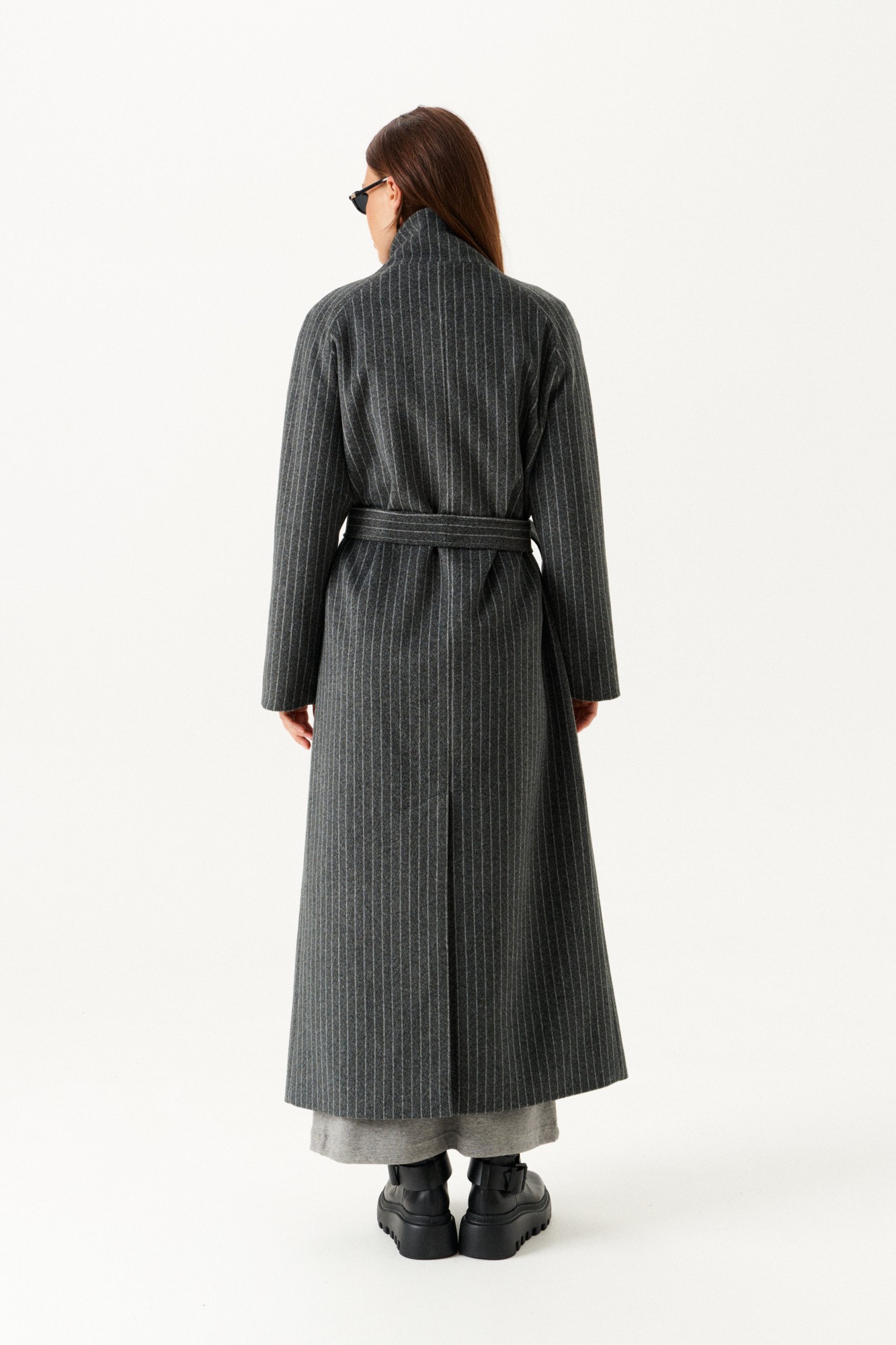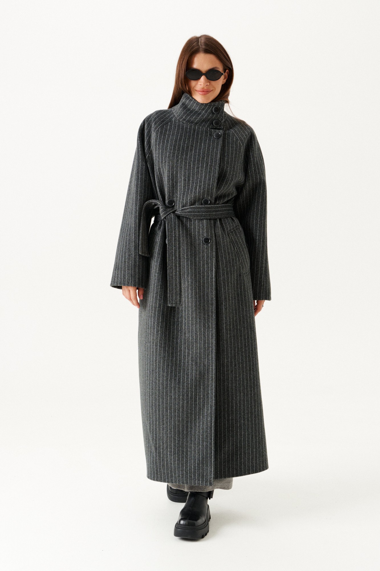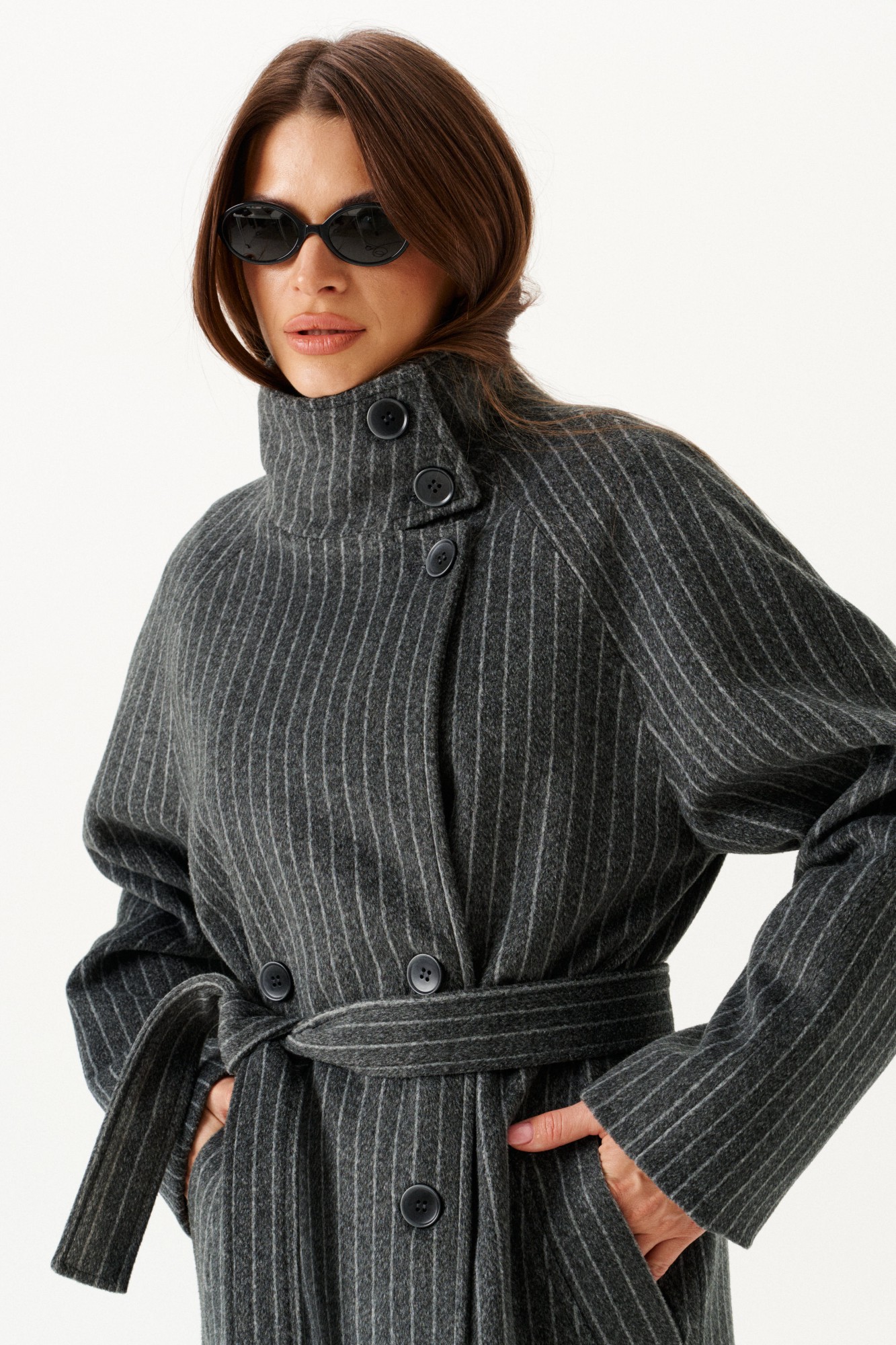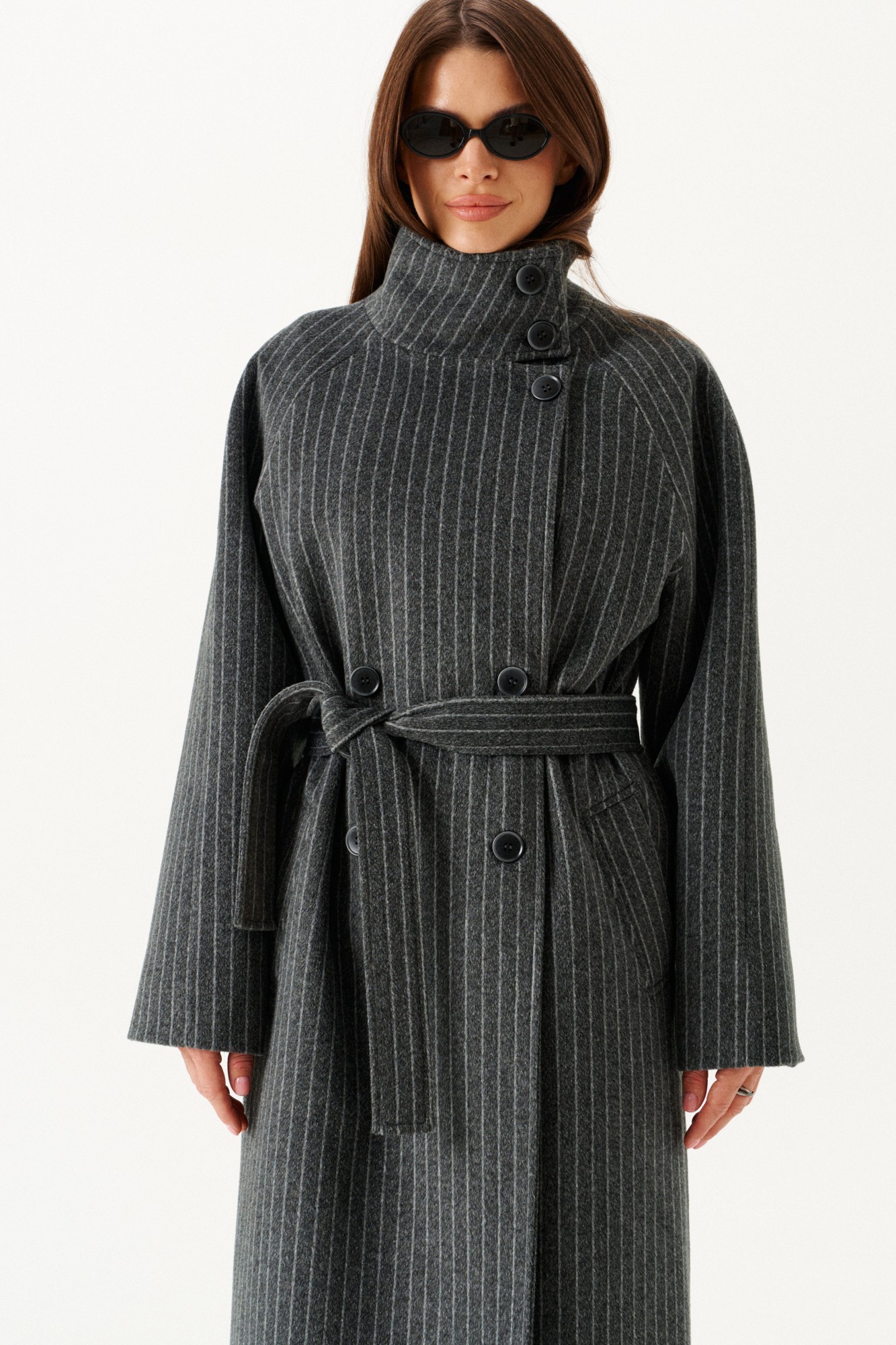 Пальто из трикотажного полотна прямого силуэта, с центральной двубортной застежкой на петли и пуговицы, на подкладке. Воротник – стойка с застежкой на петли и пуговицы. Полочки с прорезными карманами с листочкой. Спинка со средним швом и шпицей. Рукав – реглан. В комплекте пояс из основной ткани.