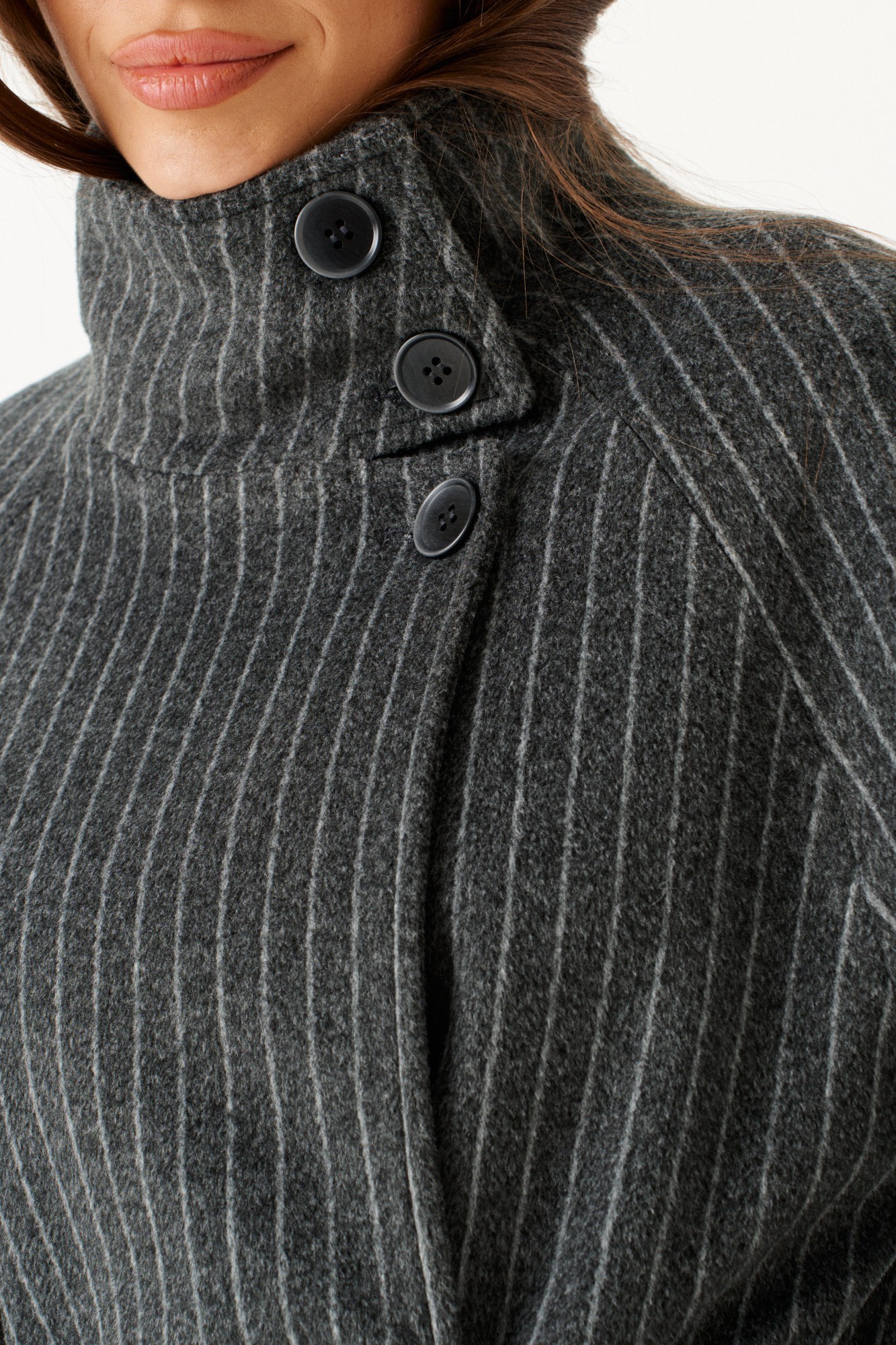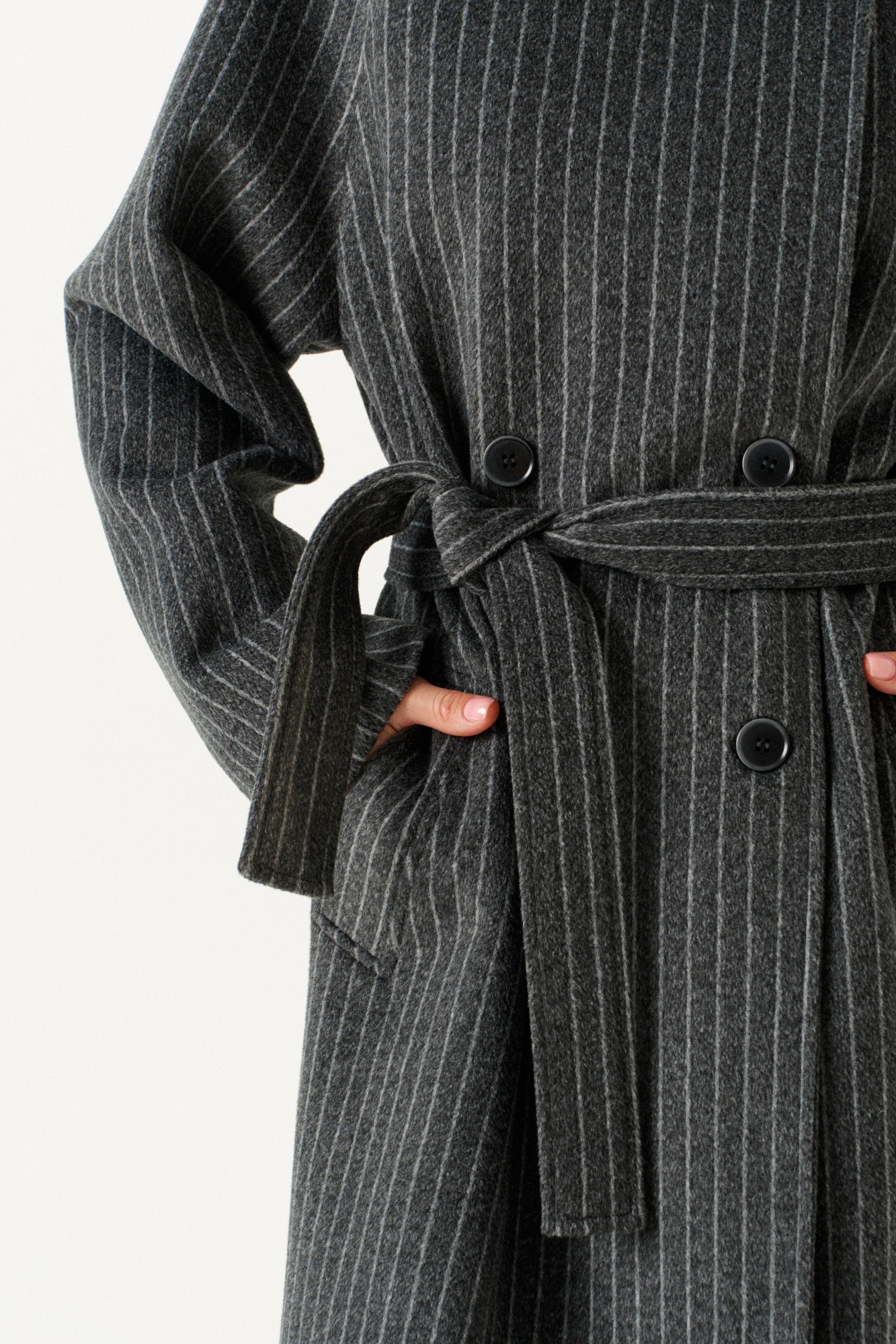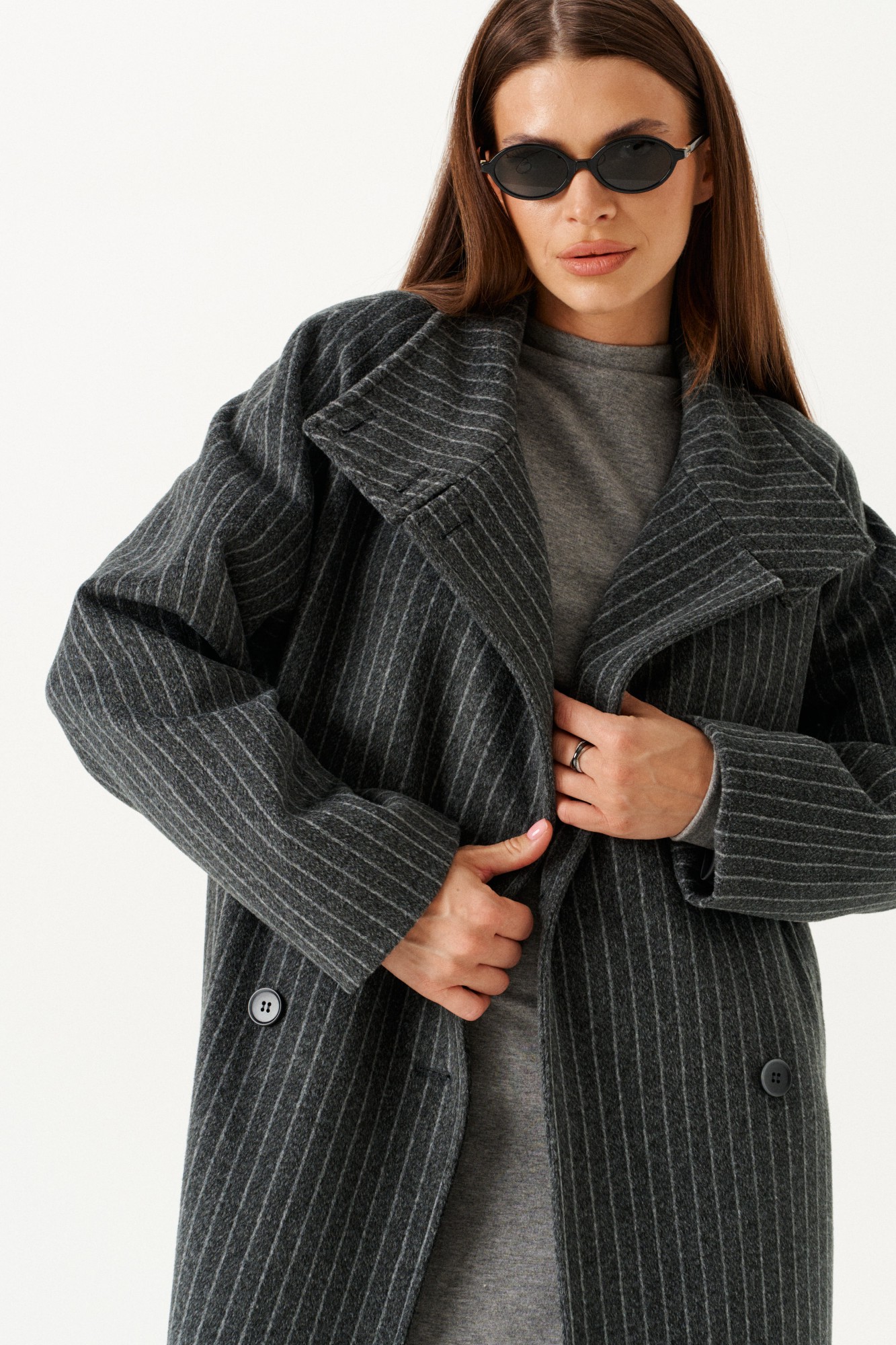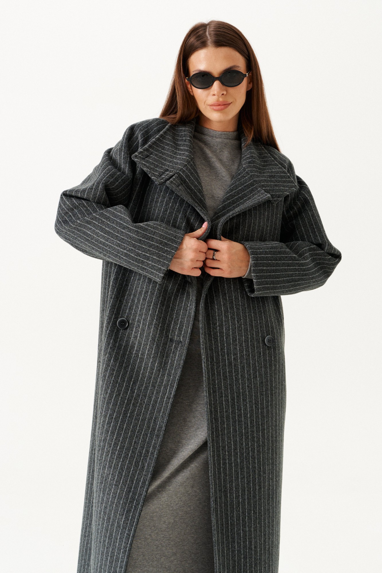 Пальто из трикотажного полотна прямого силуэта, с центральной двубортной застежкой на петли и пуговицы, на подкладке. Воротник – стойка с застежкой на петли и пуговицы. Полочки с прорезными карманами с листочкой. Спинка со средним швом и шпицей. Рукав – реглан. В комплекте пояс из основной ткани.
