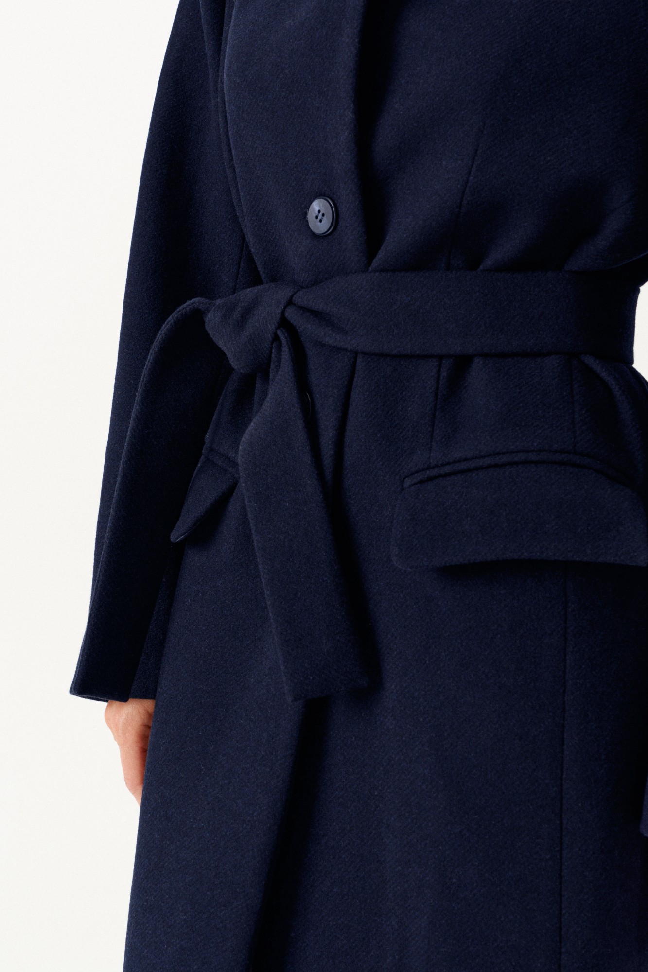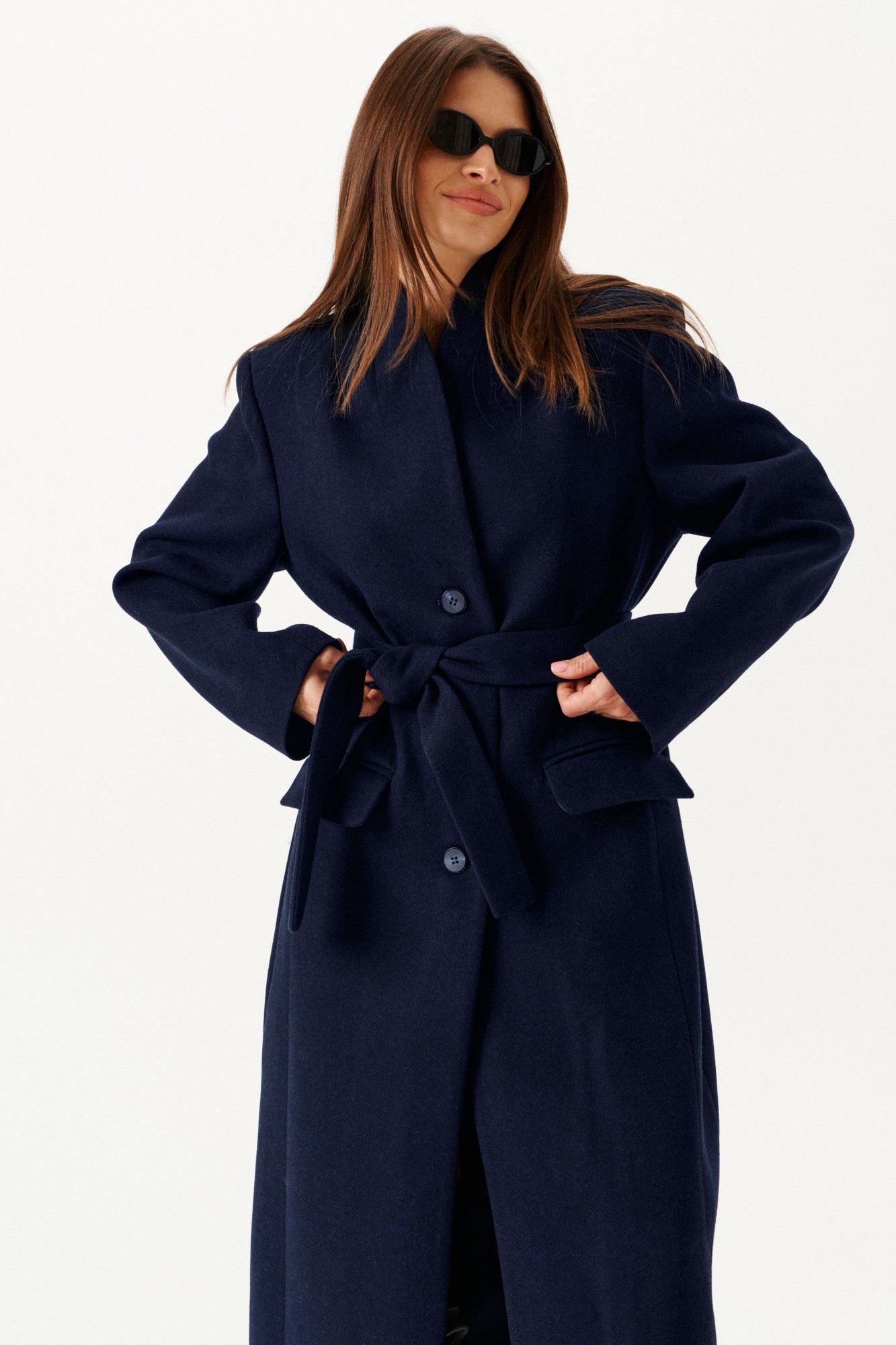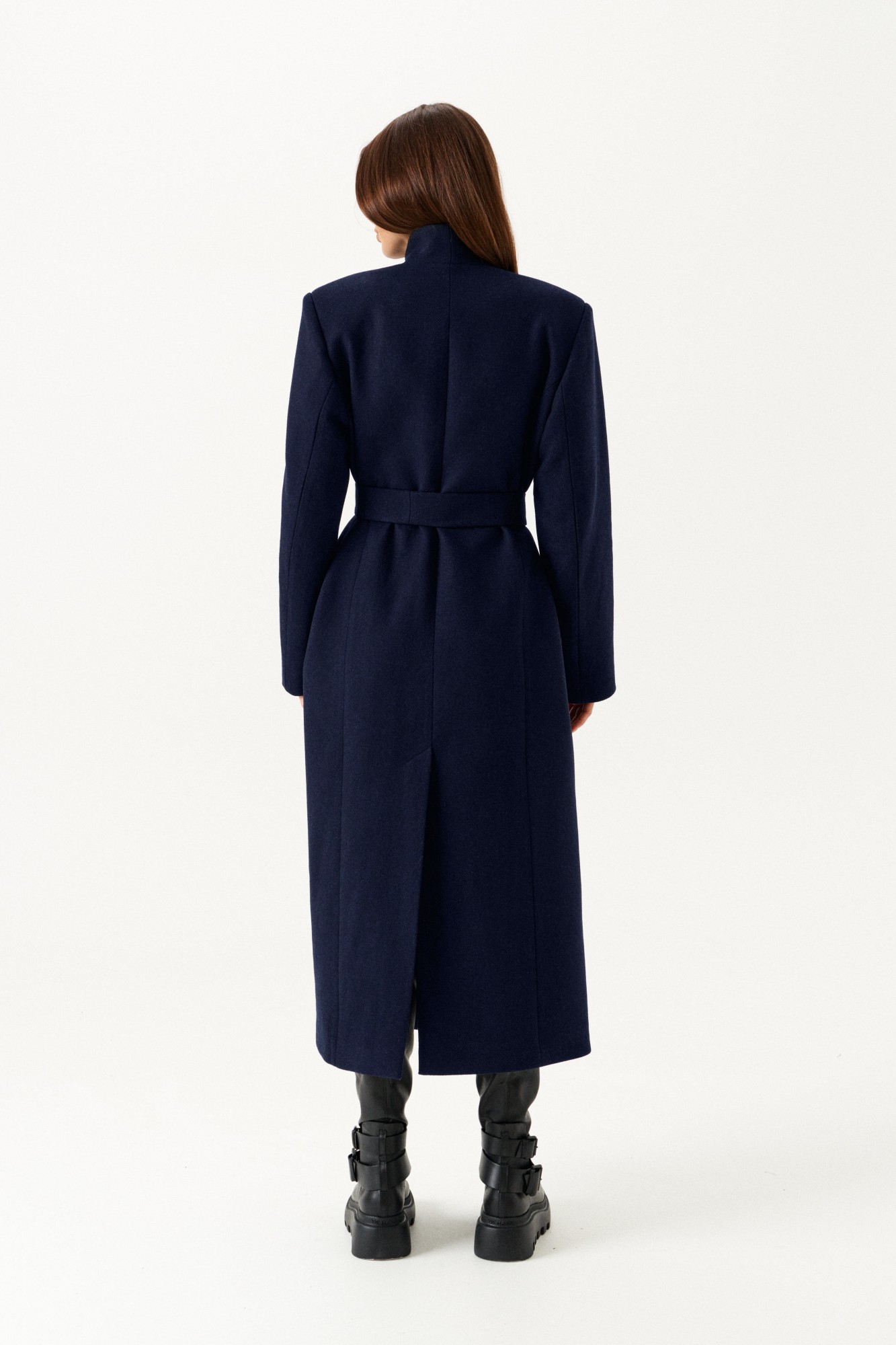 Пальто из пальтовой ткани, прямого силуэта, свободное, с центральной застежкой на петли и пуговицы, на подкладке. Воротник – цельнокроеная стойка. Полочки с отрезными бочками и прорезными карманами с клапаном и двумя обтачками. Спинка с отрезными бочками, со средним швом и шпицей. Рукав втачной, двухшовный, длинный. В комплекте пояс из основной ткани.