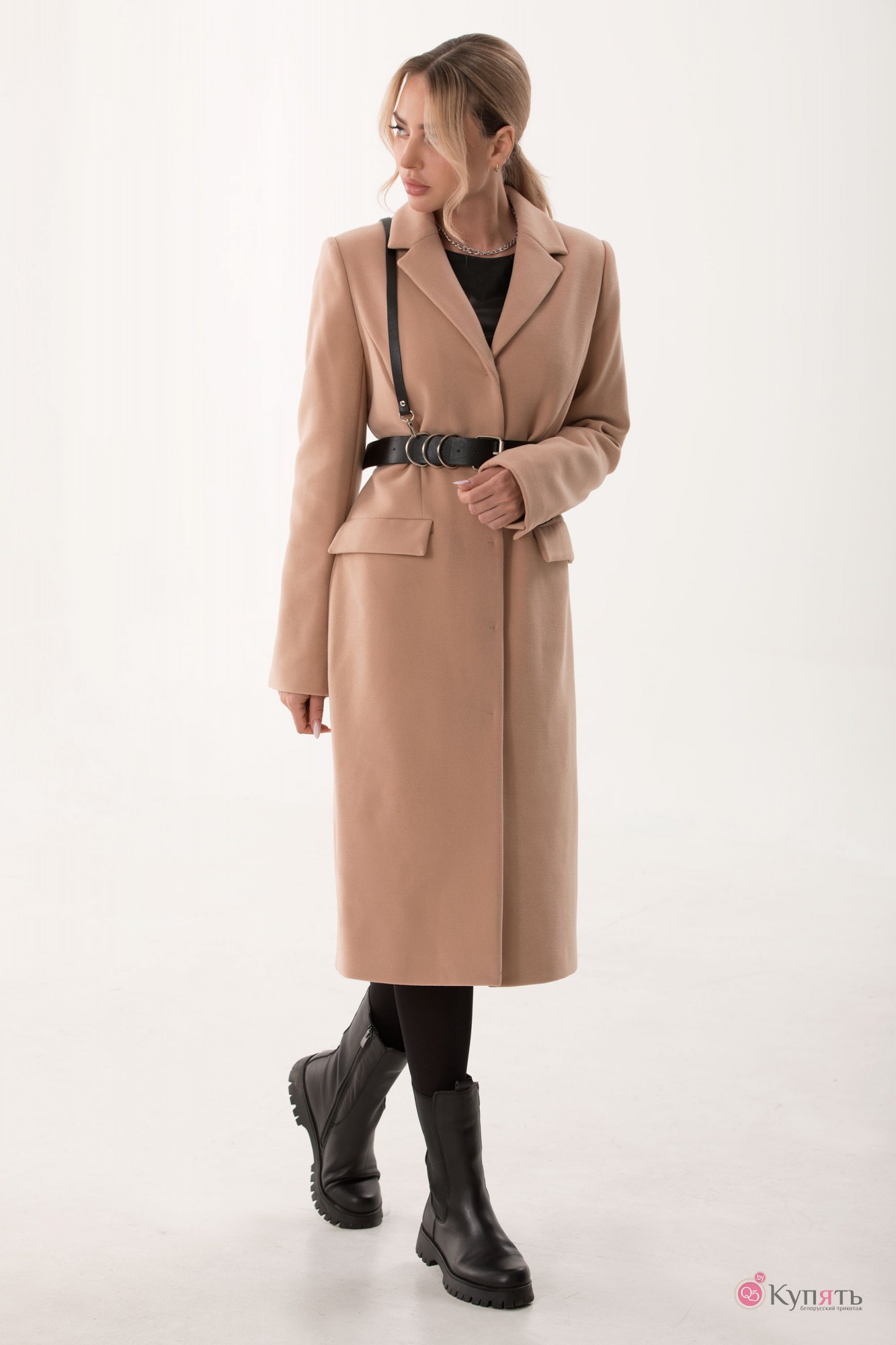 Пальто с центральной застежкой на пришивные кнопки, втачным воротником и отложным лацканом. По переду полурельефы, выходящие из проймы, прорезные карманы с листочкой и клапаном. Спинка со средним швом, заканчивающимся шлицей. В комплекте: портупея.