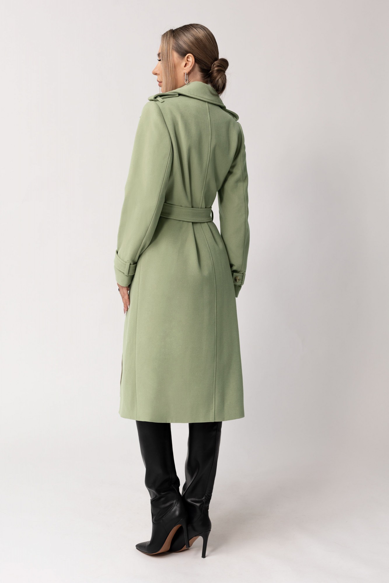 Пальто с центральной двубортной застежкой на петли и пуговицы, втачным воротником и отложным лацканом. По переду – отлетная кокетка, прорезные карманы с листочкой. Спинка со средним швом. По плечевым швам- погоны, по низу рукавов- паты, закрепленные шлевками. Пальто со съемным поясом