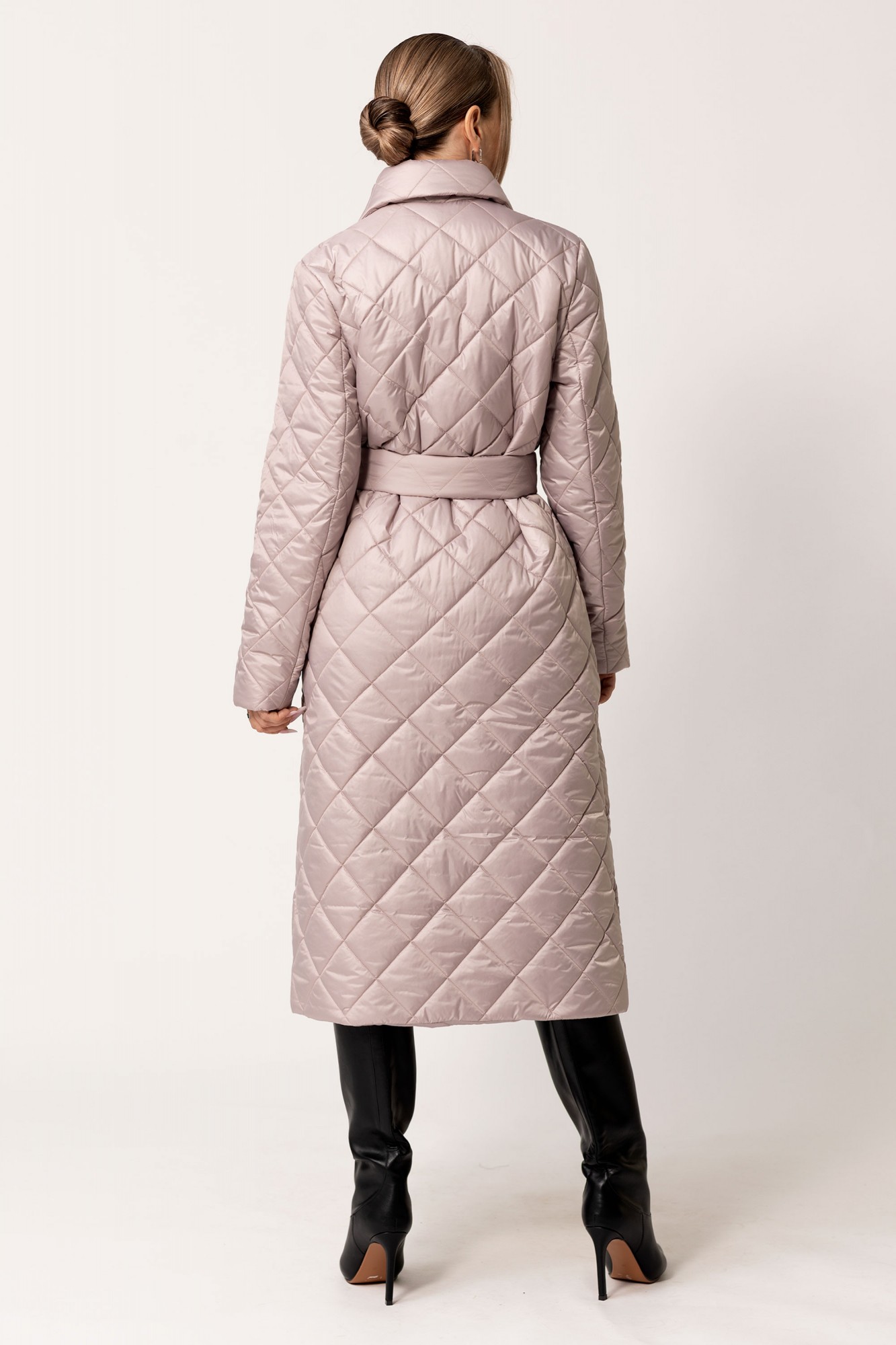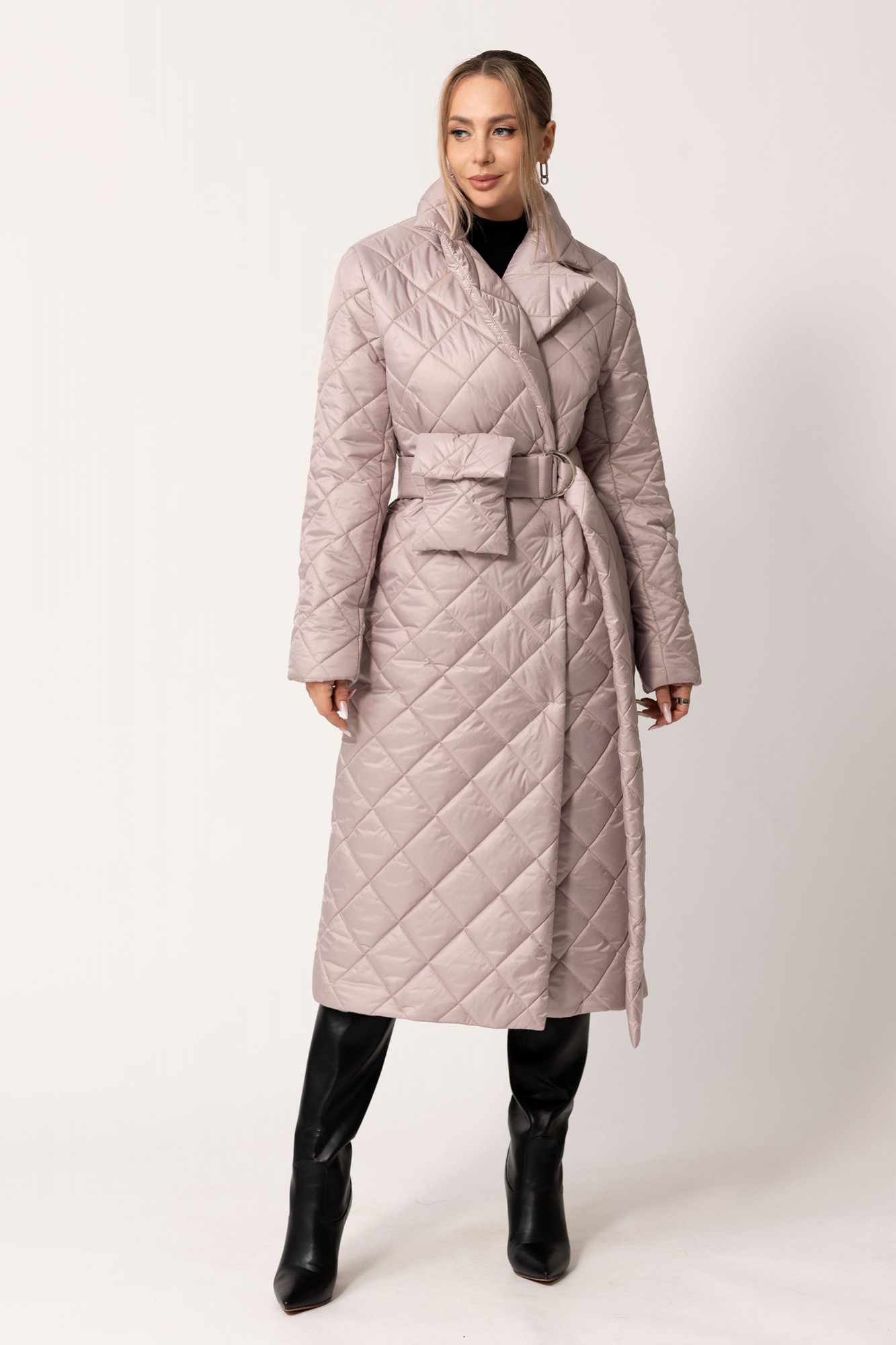 Пальто утепленное с центральной двубортной застежкой на пришивные кнопки, отложным воротником и лацканами. В боковых швах- карманы. Спинка цельная.. Рукав втачной, двухшовный. Пальто со съемным поясом и декоративной сумочкой.