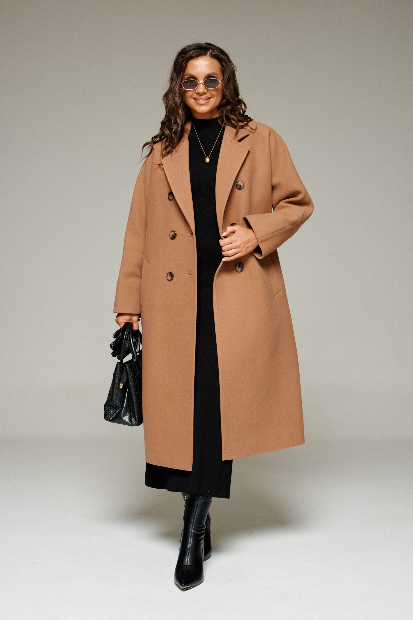 Пальто выполнено из шерстяной ткани, которая обеспечивает теплоизоляцию и защиту от ветра и влаги, подходит для межсезонья и теплой зимы. Двубортное, на подкладке. Изделие рассчитано на температурный режим от +10 до -5 градусов. Модель прямого силуэта, чуть расширенная к низу, покроя «летучая мышь»; предназначена для повседневного использования.