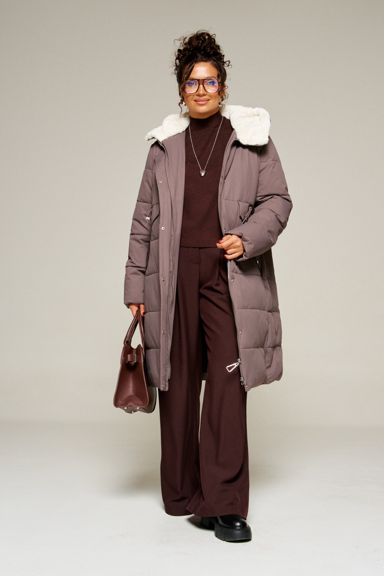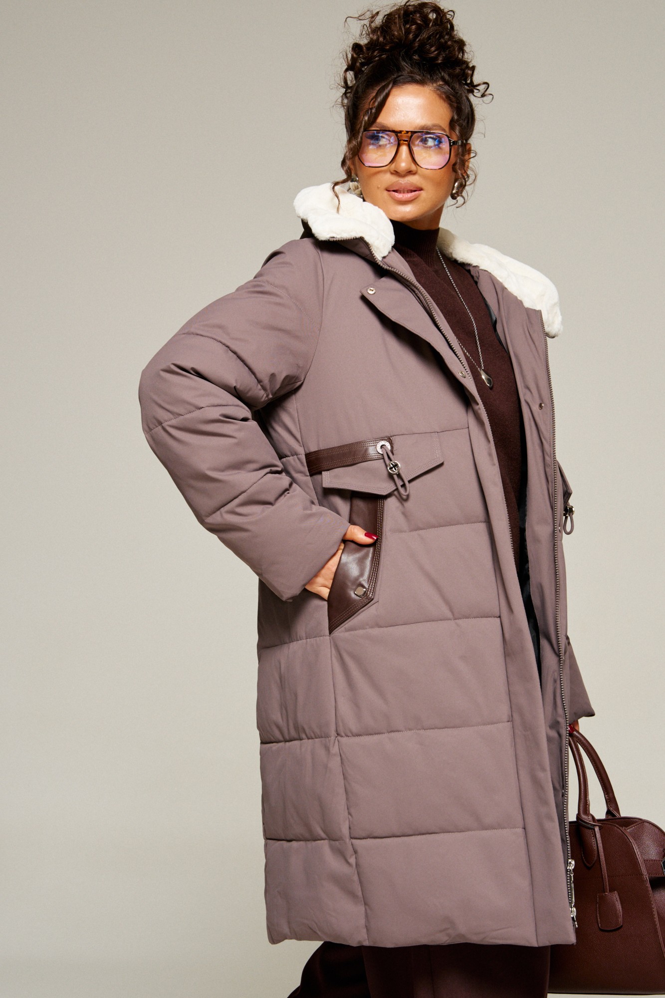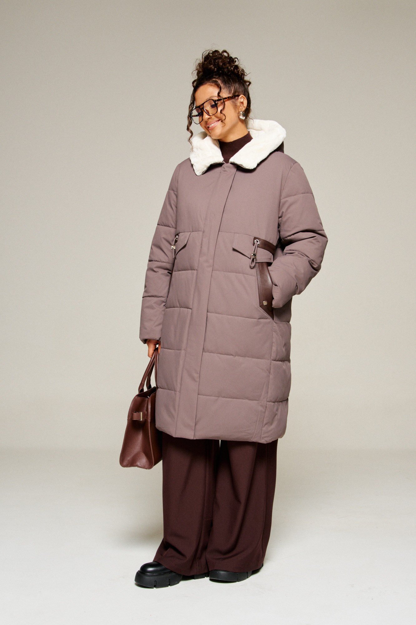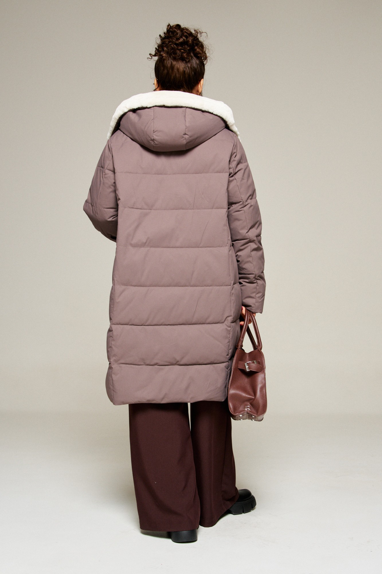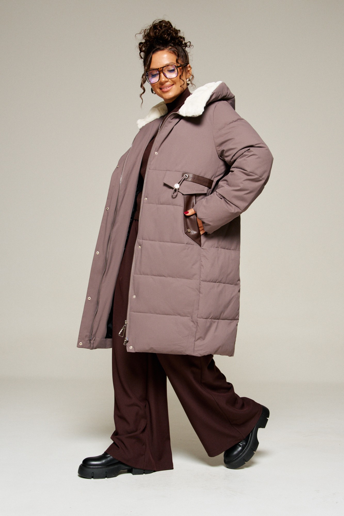 Капюшон с застежкой спереди умеренного объема. Внутренняя часть капюшона выполнена из искусственного меха, который выполняет декоративную и защитную функции, создавая дополнительное тепло и защиту от ветра и холода.