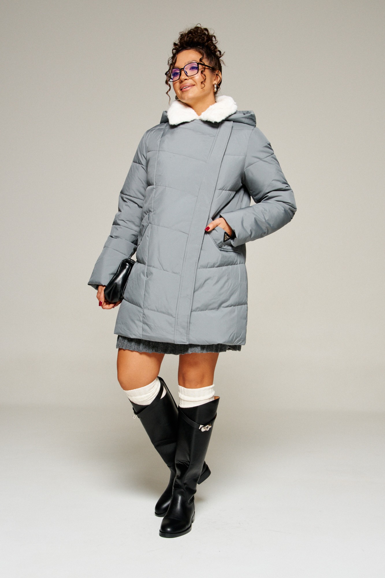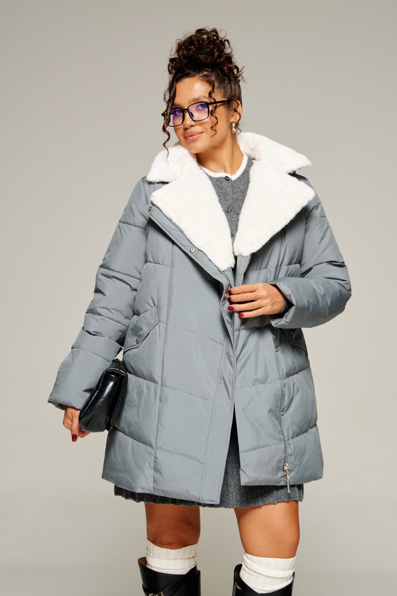 Воротник пиджачного типа с возможностью застегивания до верха. Внутренняя часть воротника и лацканы обработаны искусственным мехом.