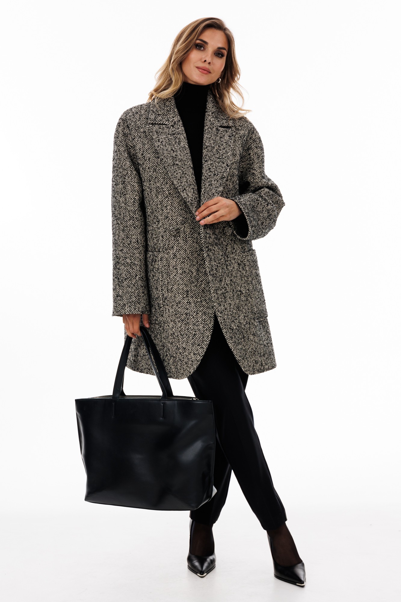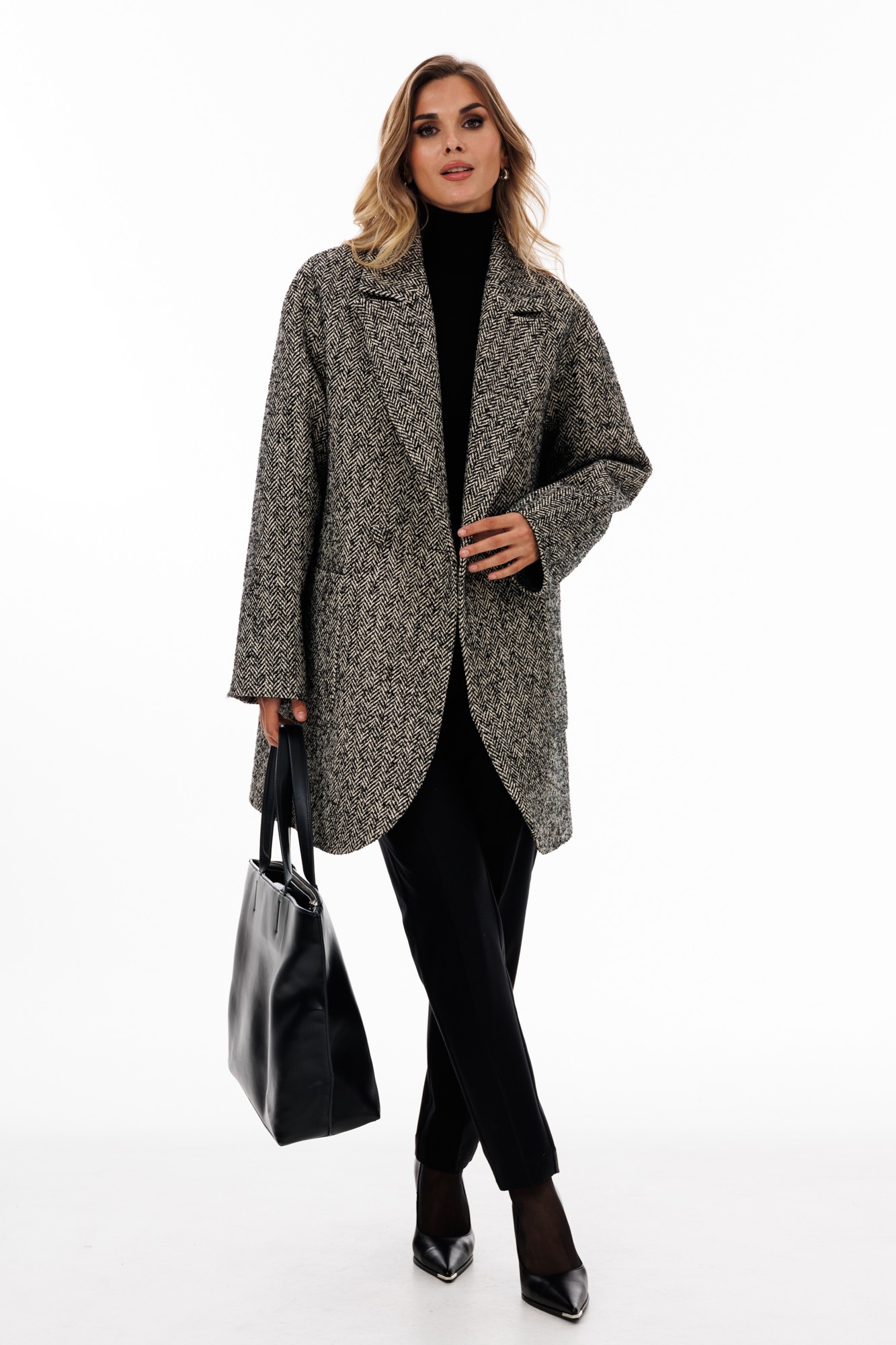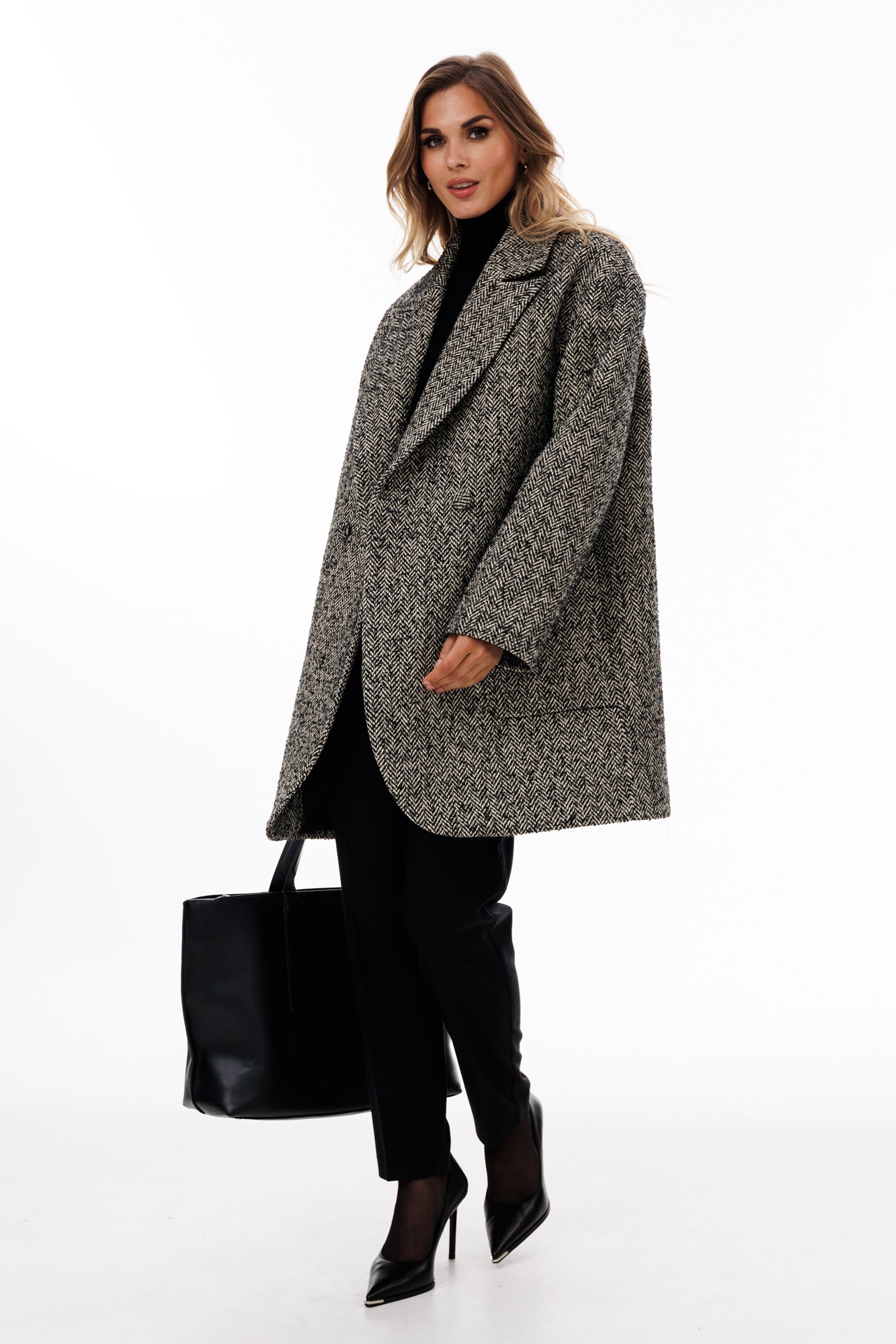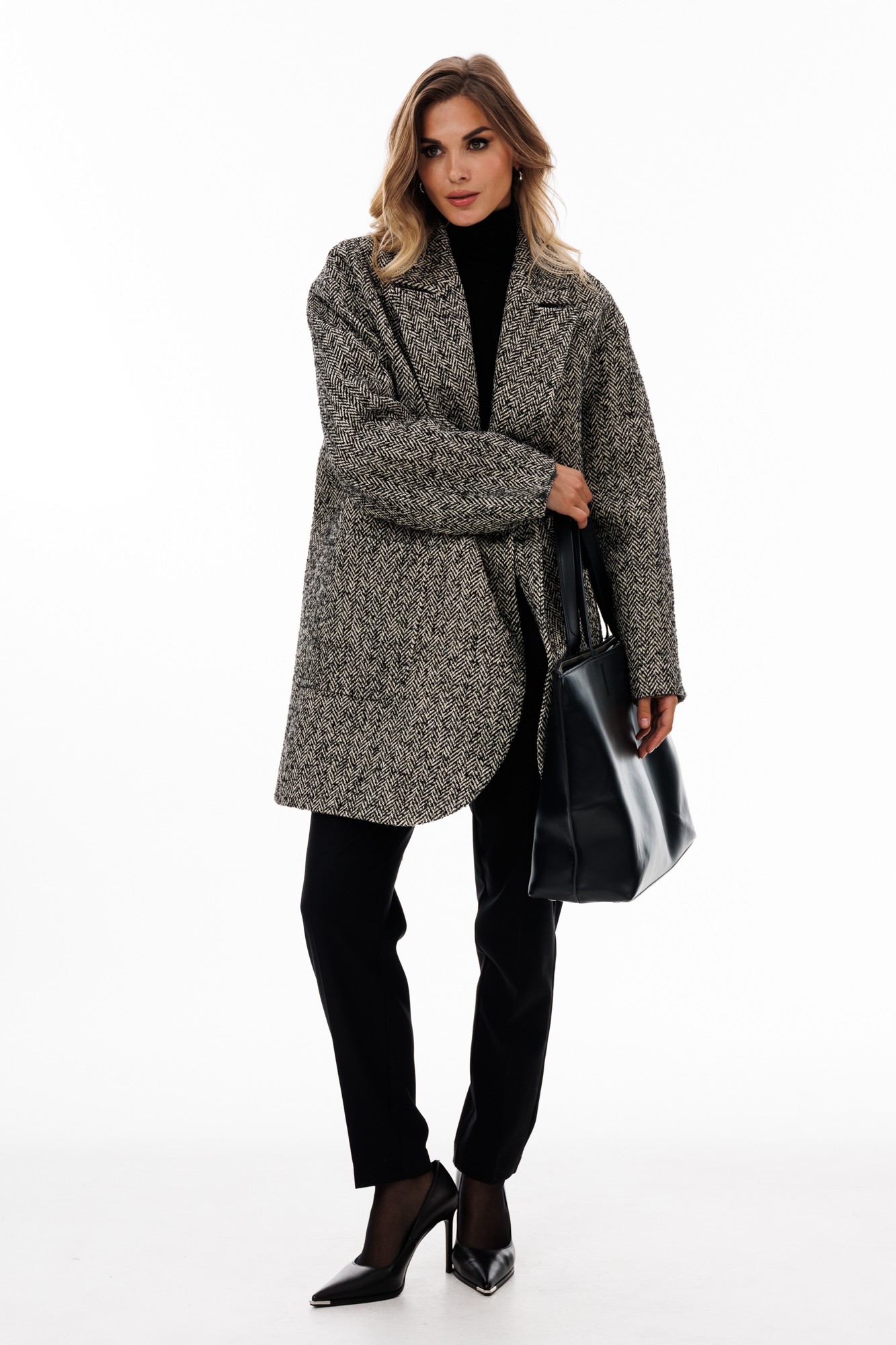 Полупальто выполнено из пальтовой ткани, меланж с рисунком елочка. Спереди накладные карманы, двубортная застежка. На спинке средний шов. Воротник пиджачного типа. Плечевой шов удлинен. Рукав рубашечного покроя, одношовный с локтевой вытачкой. Полупальто на притачной по низу подкладке.