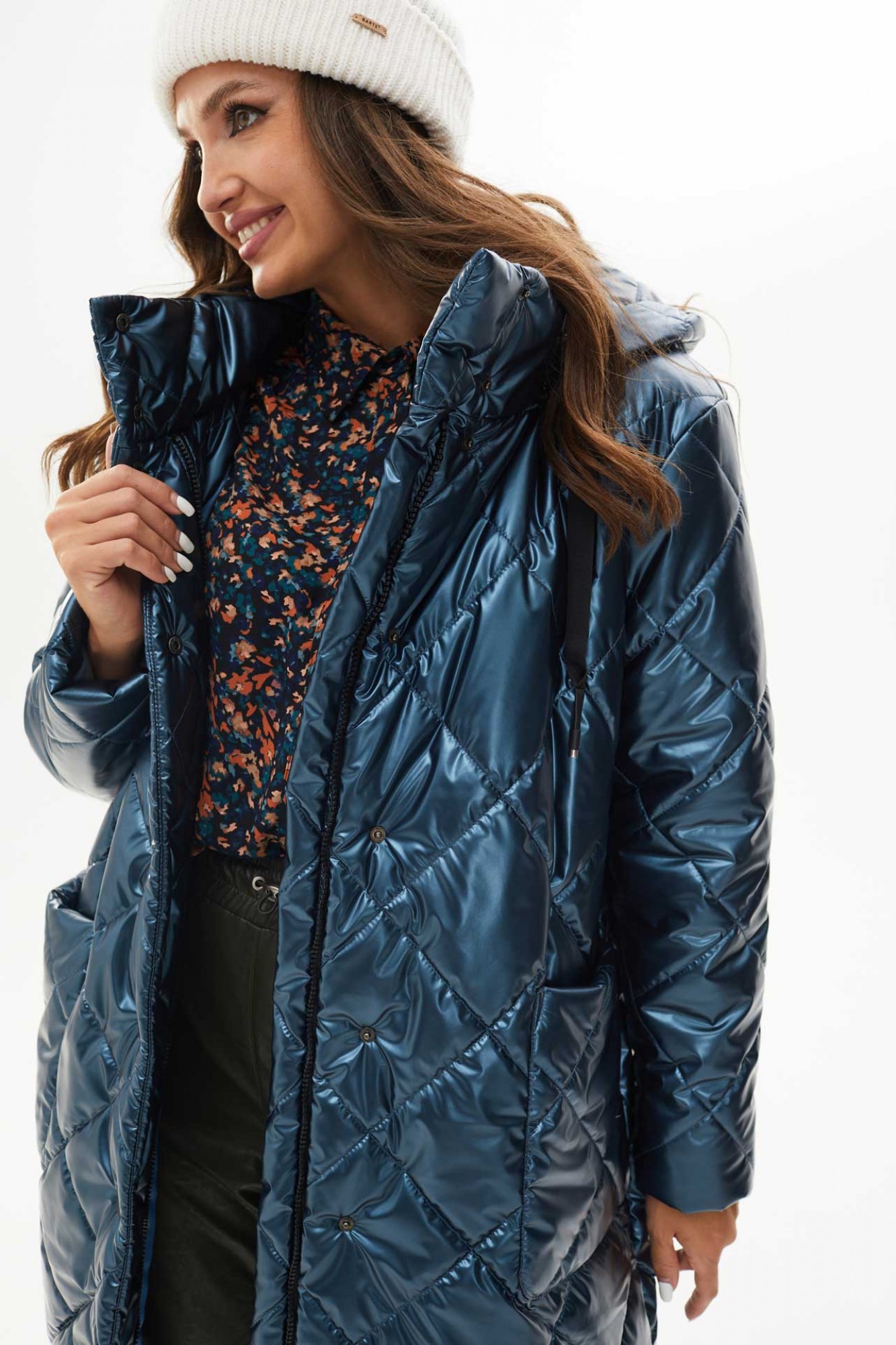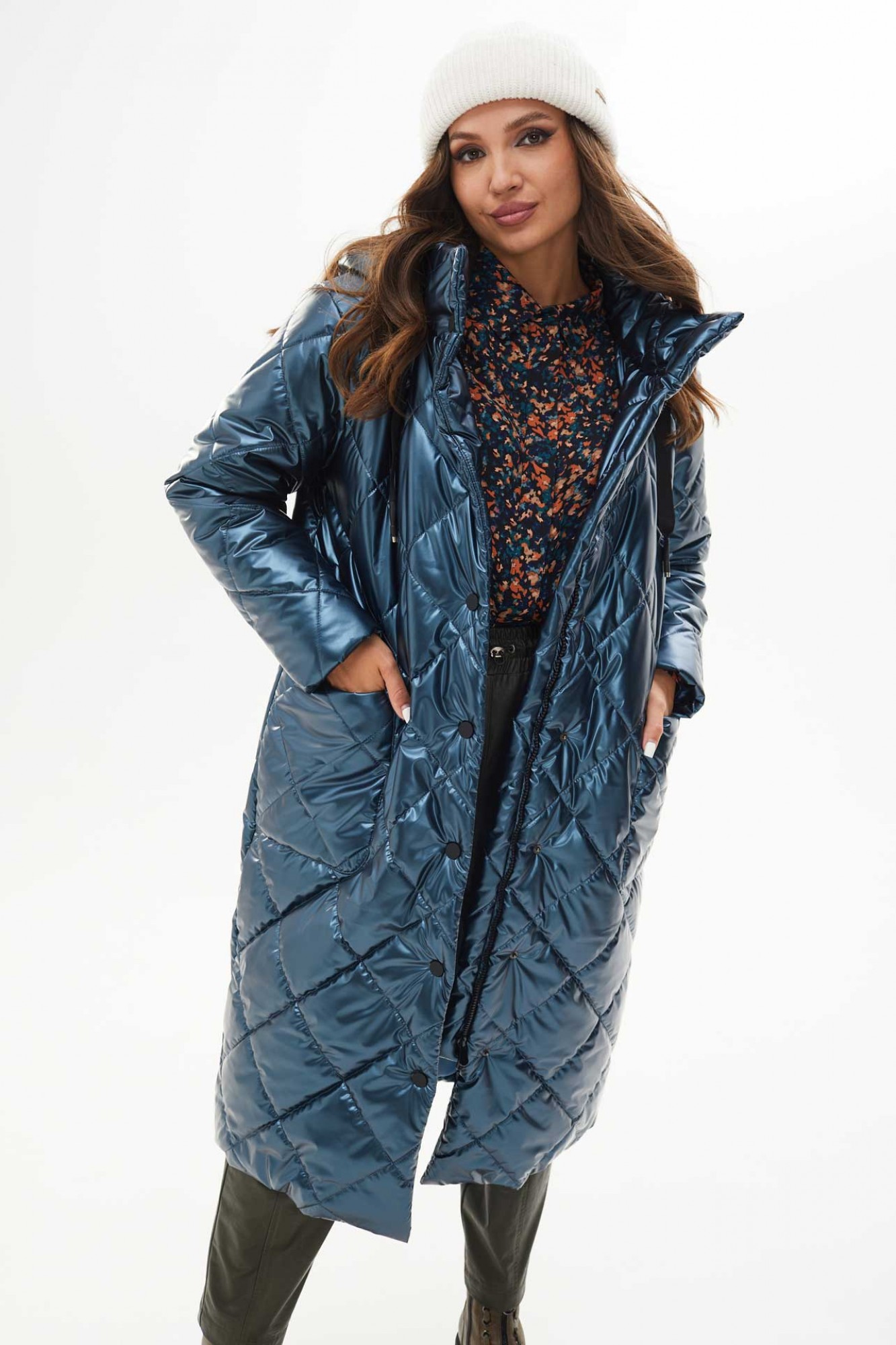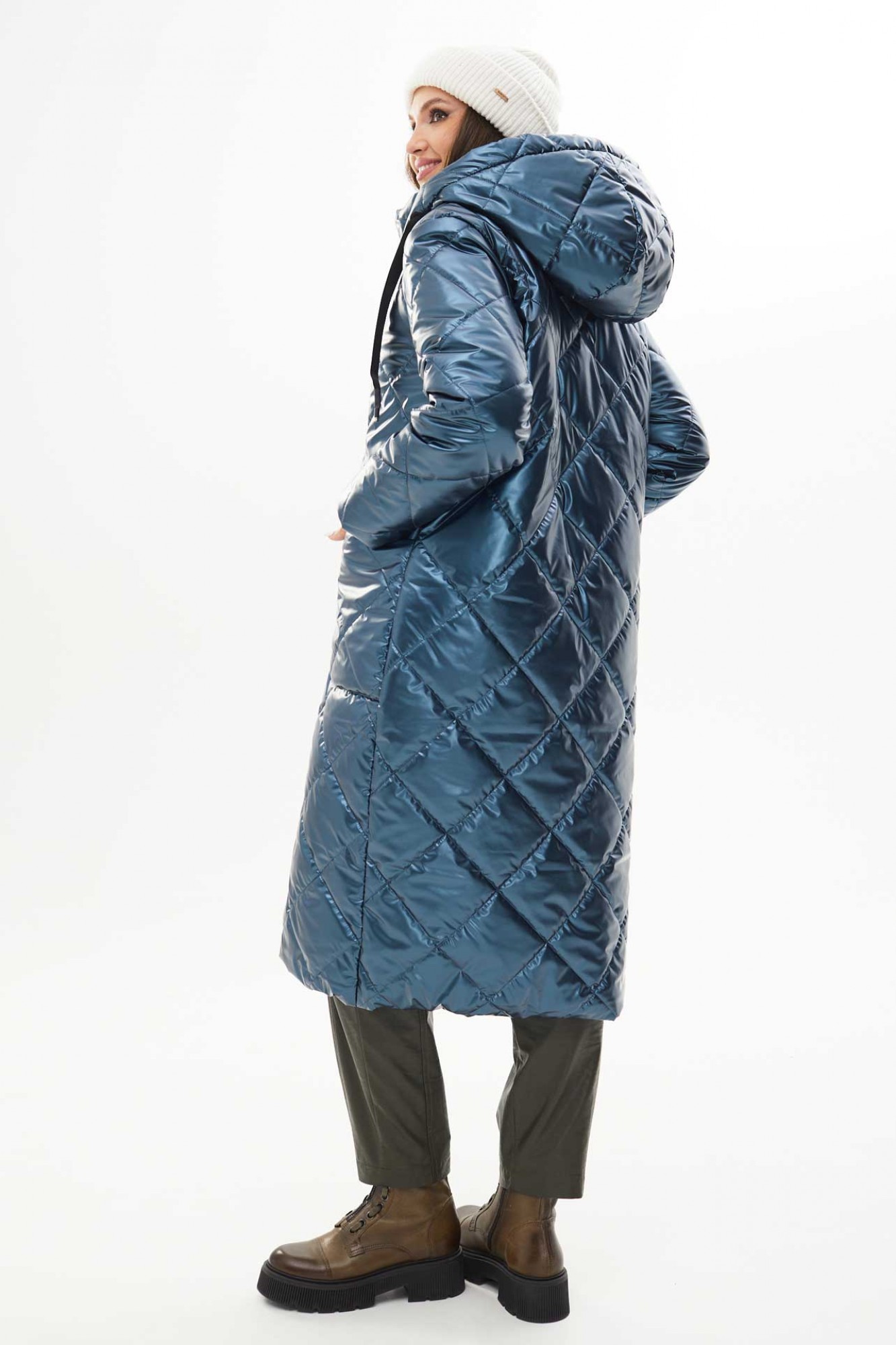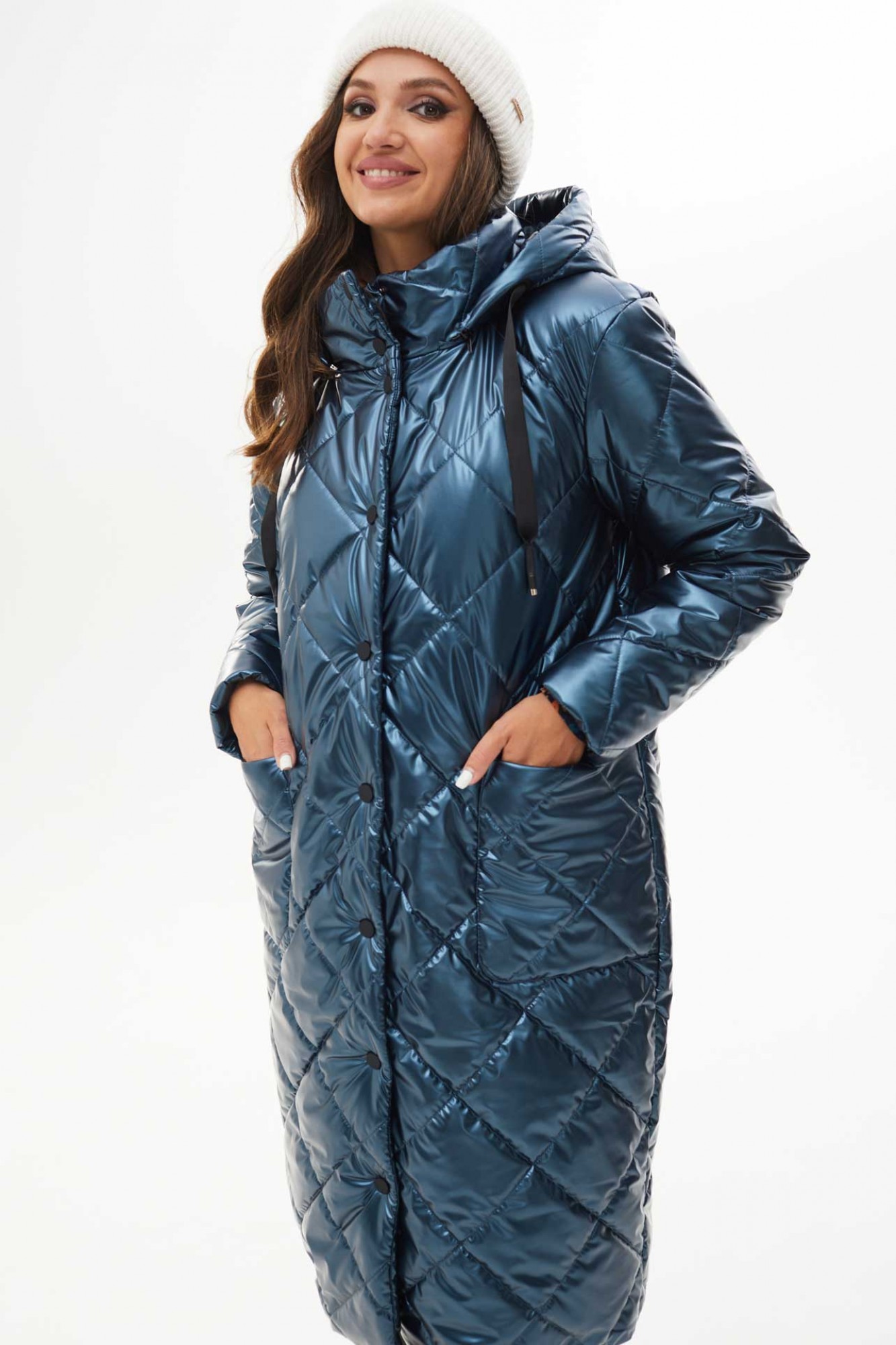 Пальто женское утеплённое осень-зима прямого силуэта с отстёгивающимся капюшоном, выполнено из ткани лаке на утеплителе изософт. По переду большие накладные карманы и застёжка на металлические кнопки. Низ пальто стягивается на шнур. Воротник стойка. Рукава одно шовные втачные. Подкладка простёгана с утеплителем изософт (250гр).