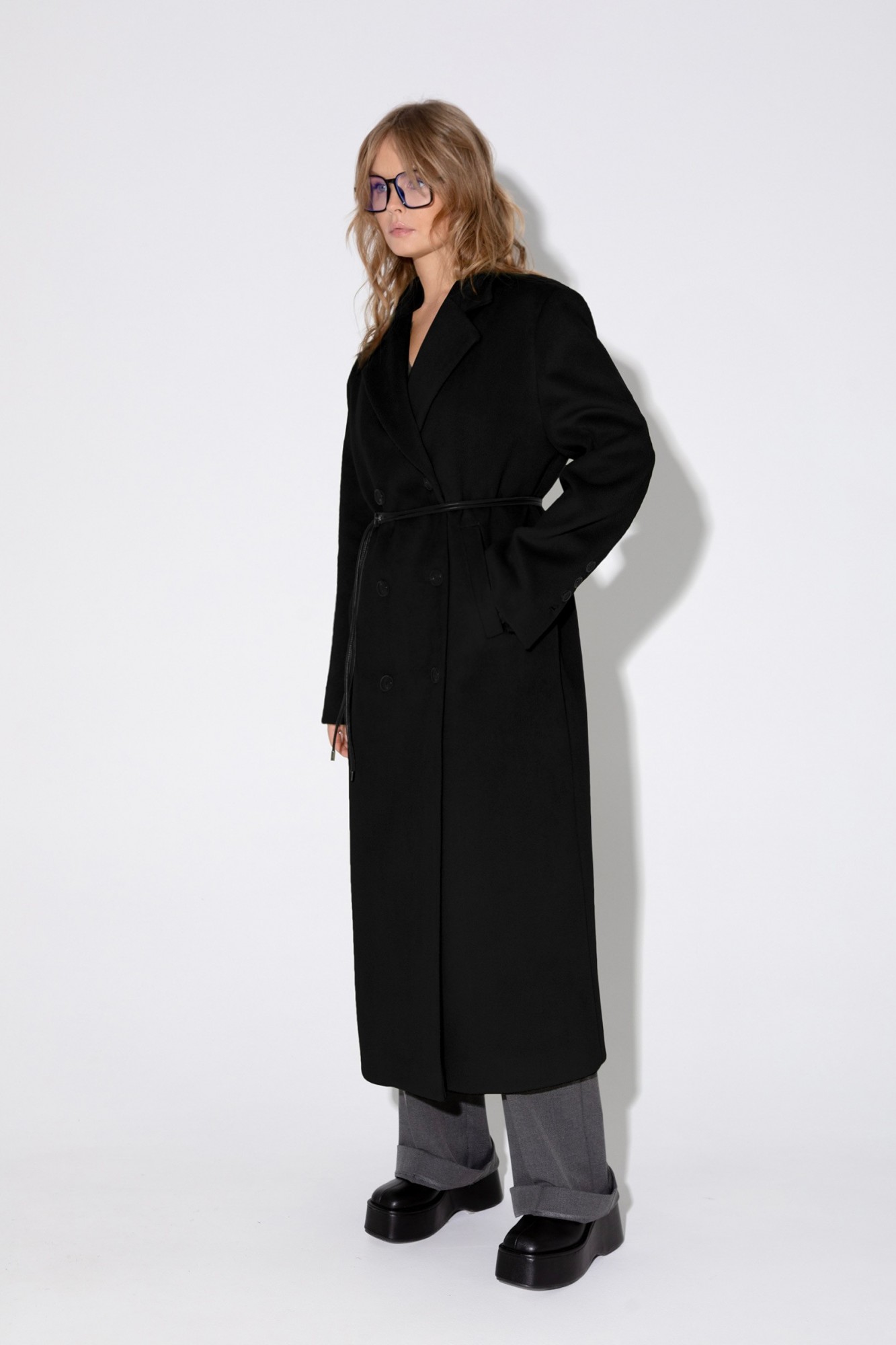 Миди-пальто покроя оверсайз и расширенными плечами.
