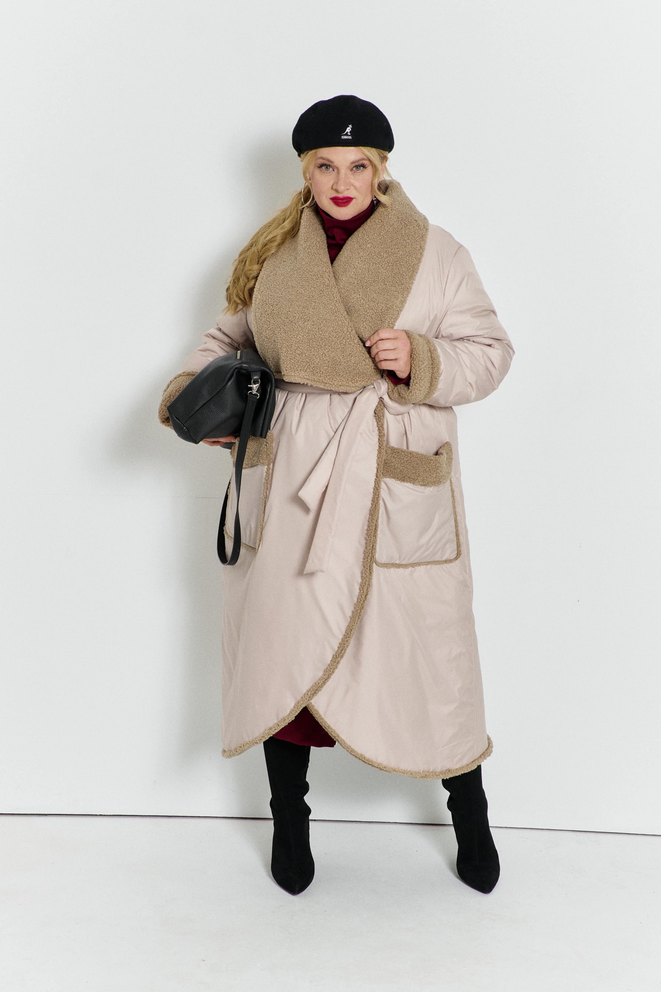 Просторное пальто на подбое из искусственного меха и с воротником апаш. Линия плеча мягкая, спереди накладные карманы. Пальто подпоясывается .