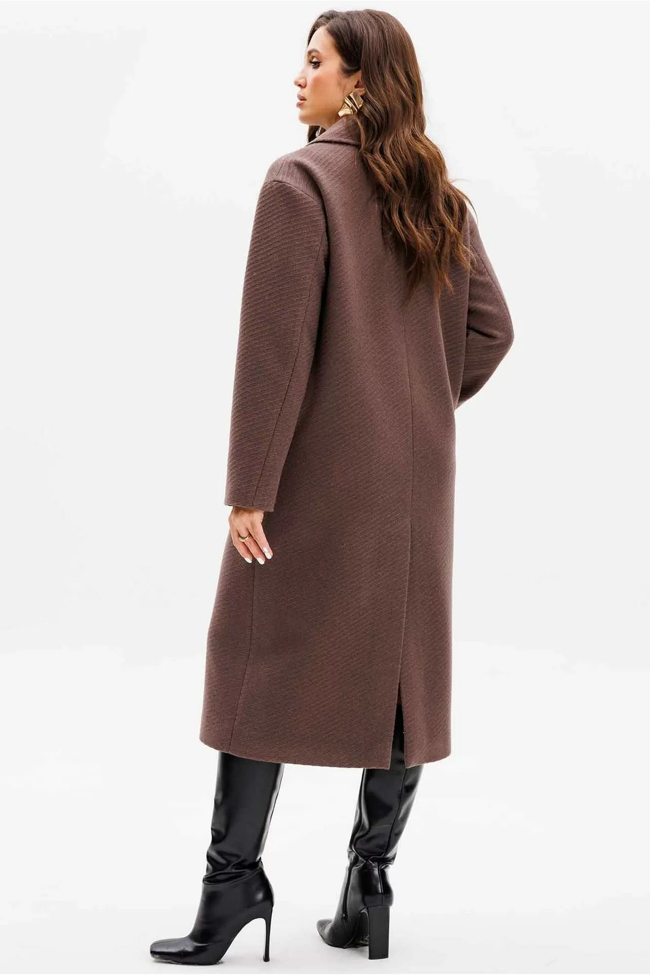 Пальто женское прямого силуэта, выполнено из пальтовой фактурной ткани. По переду нагрудные вытачки, застежка центральная двубортная на четыре прорезные петли и пуговицы, карманы прорезные с клапанами. Рукава двух шовные втачные со спущенным плечом. Центральный шов спинки заканчивается шпицей.