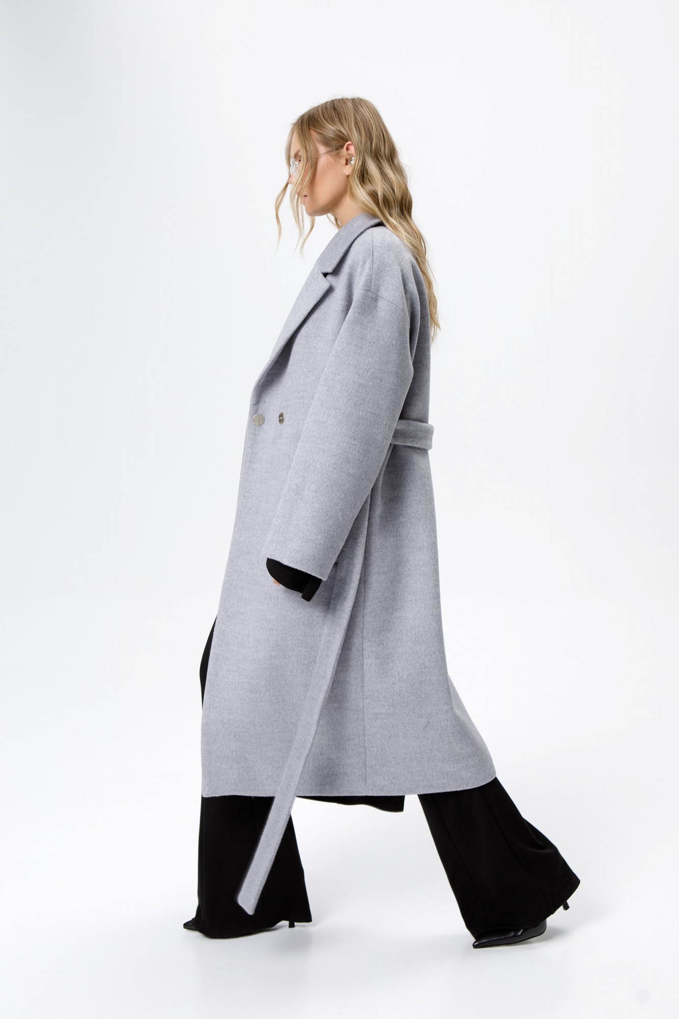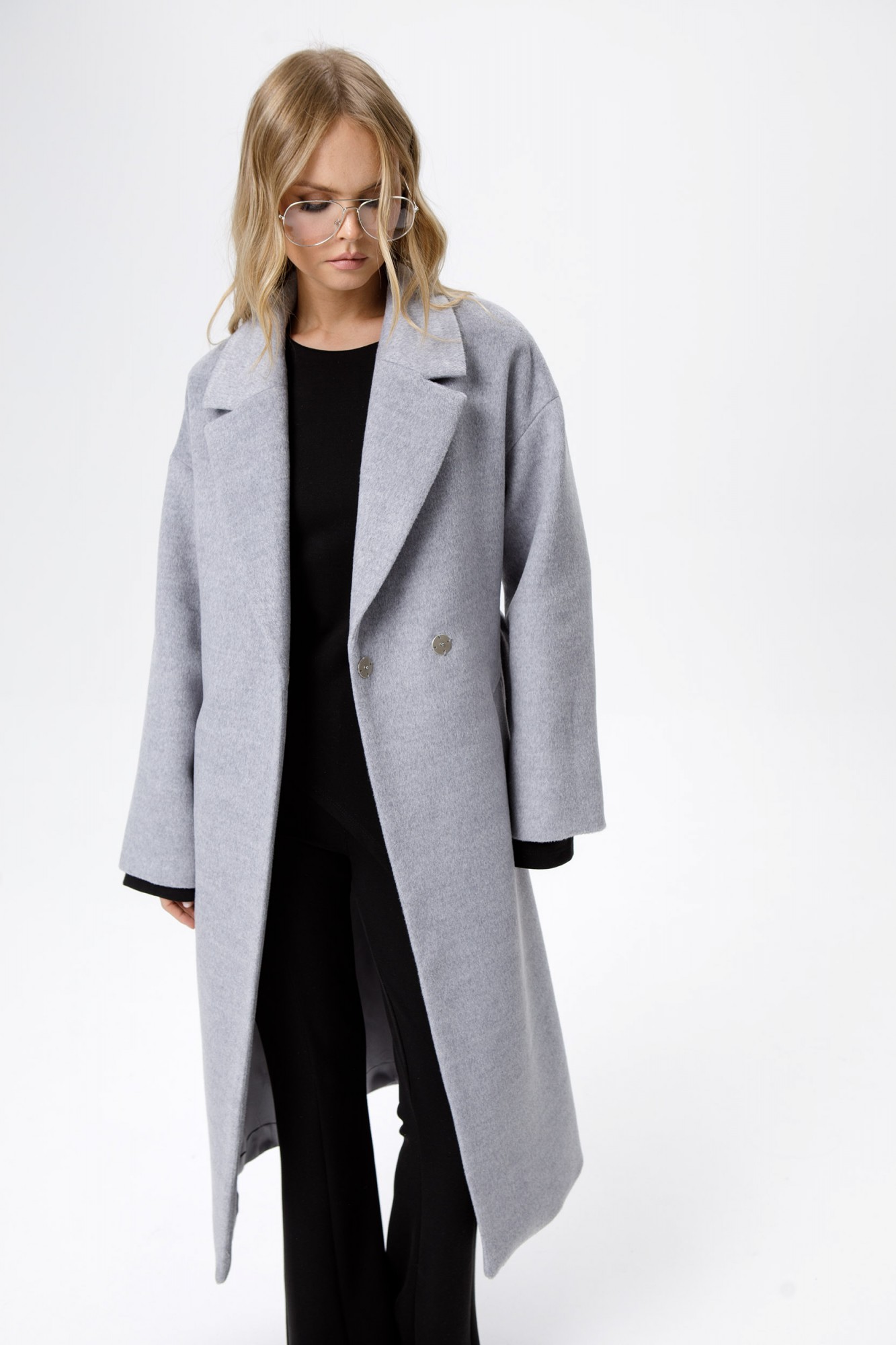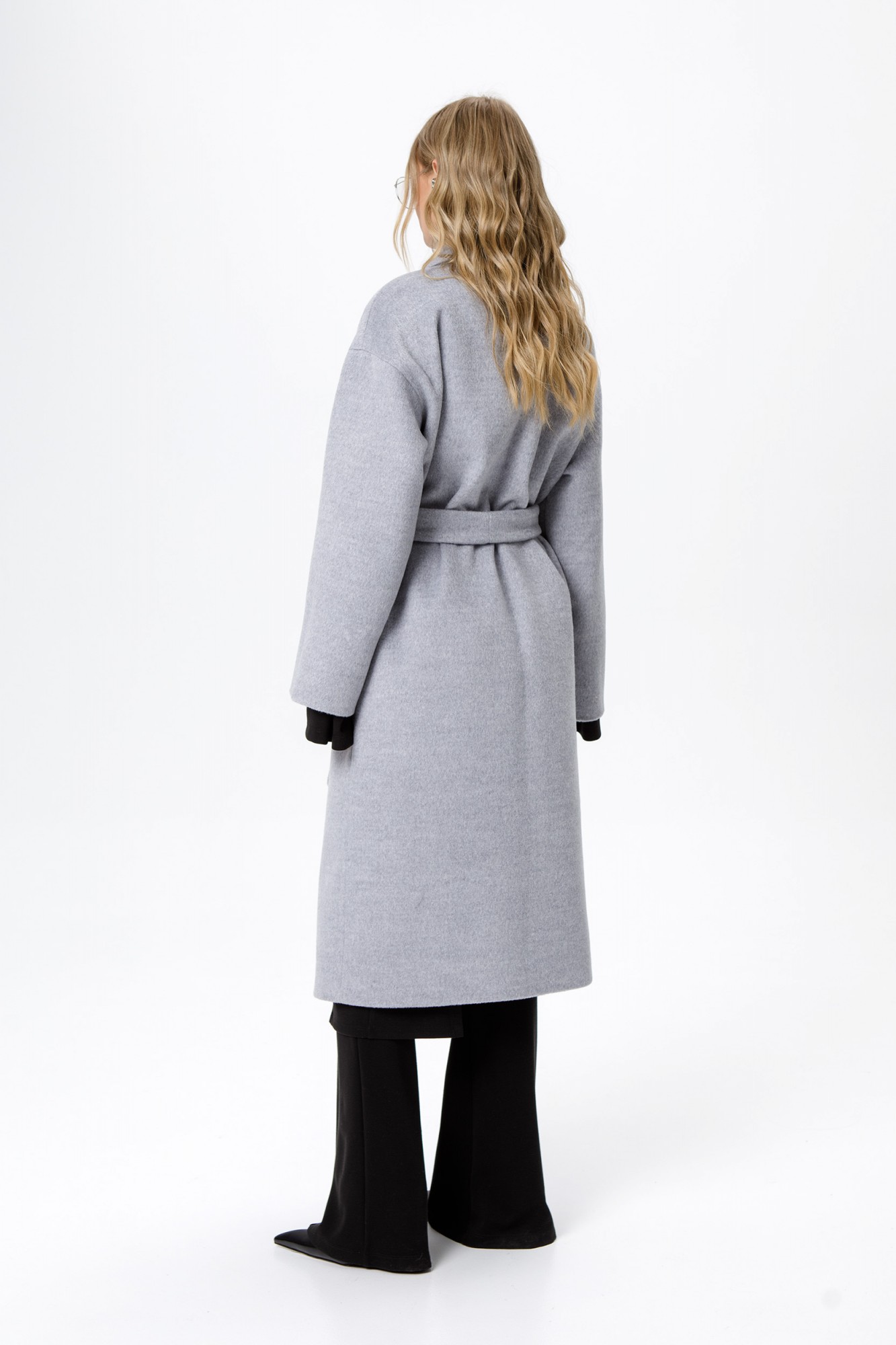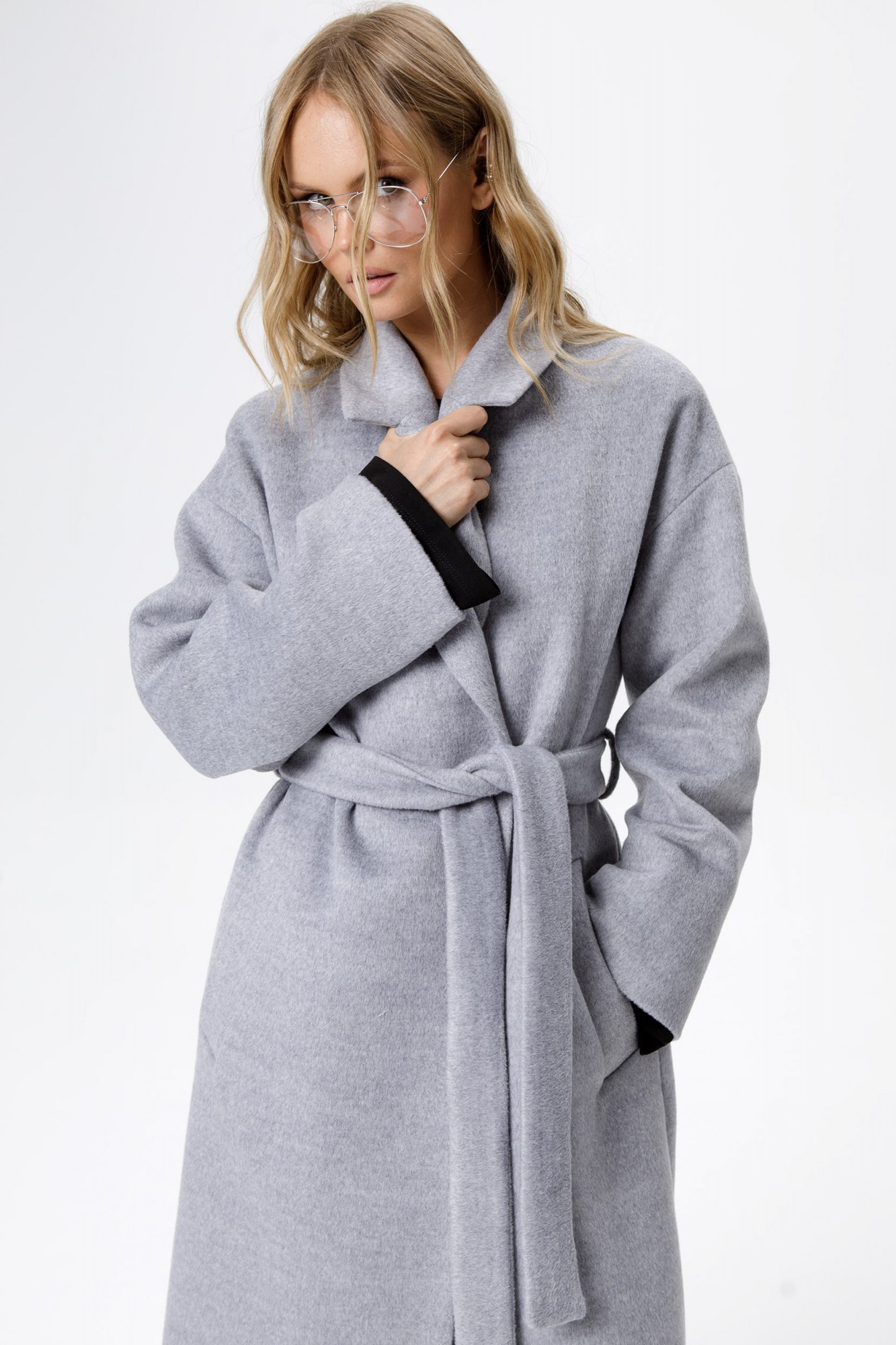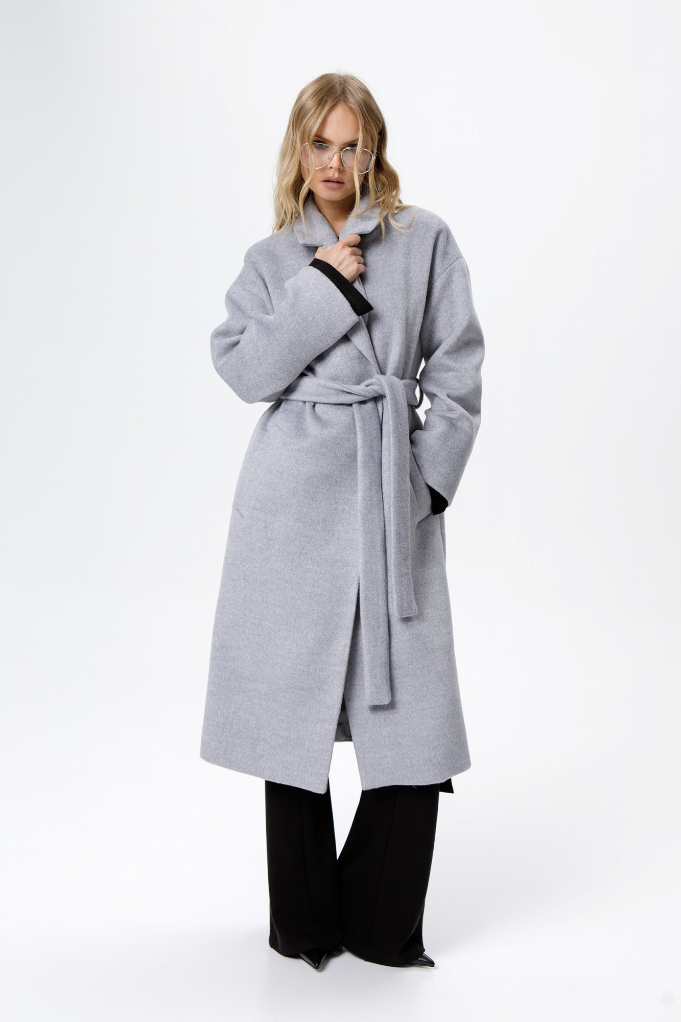 Свободное пальто-халат со съемным поясом. Детали: прямой силуэт, спущенная линия плеча, перед с прорезными карманами, пиджачный воротник, двубортная застежка на пришивные кнопки, рукава длинные, съемный пояс со шлевками, пальто на подкладке.
