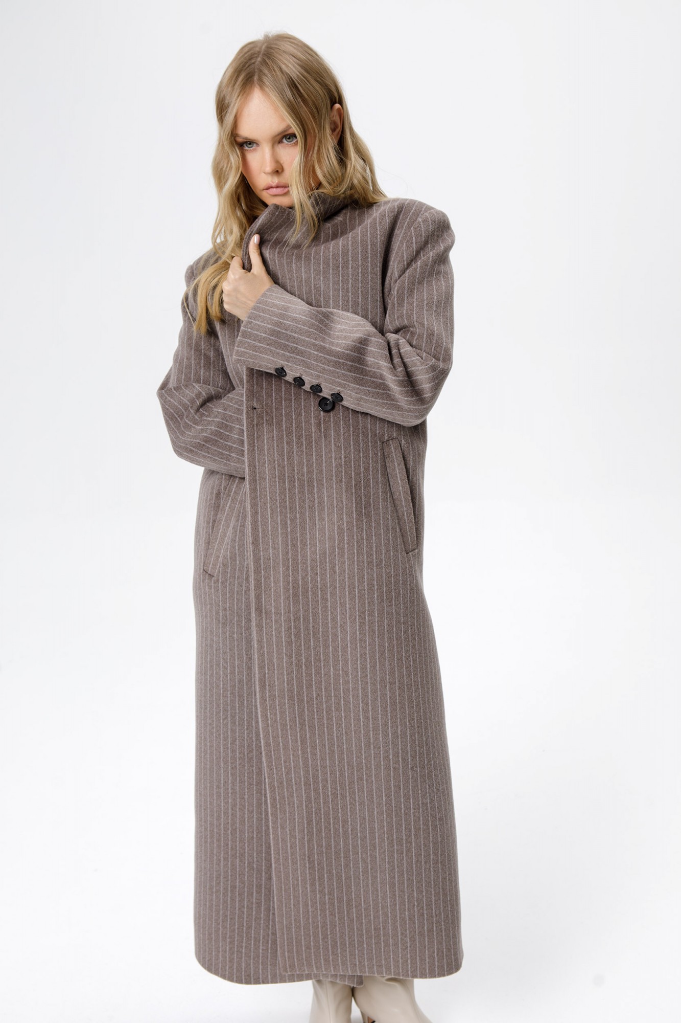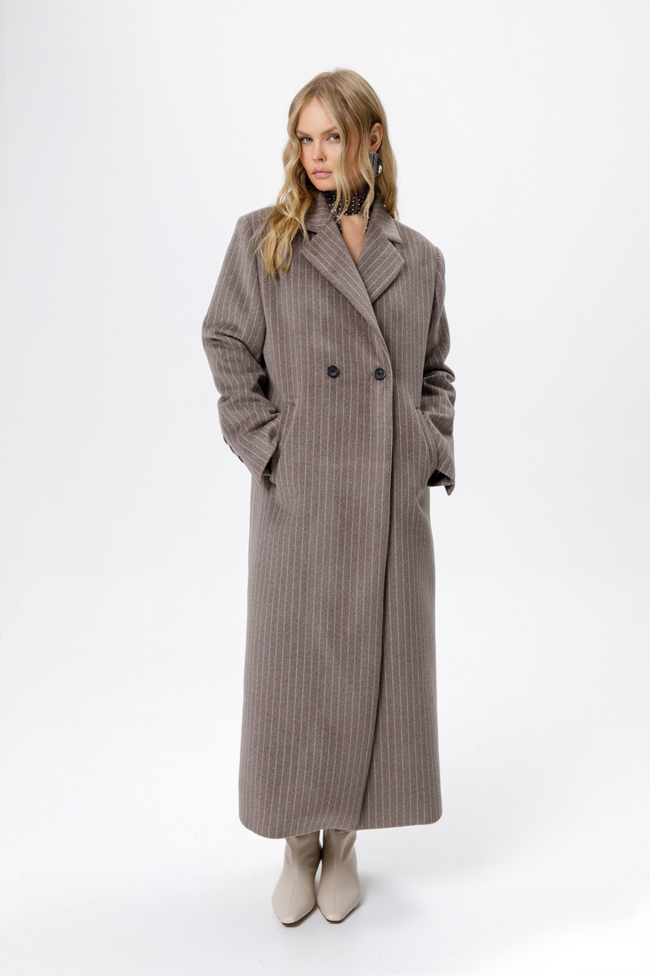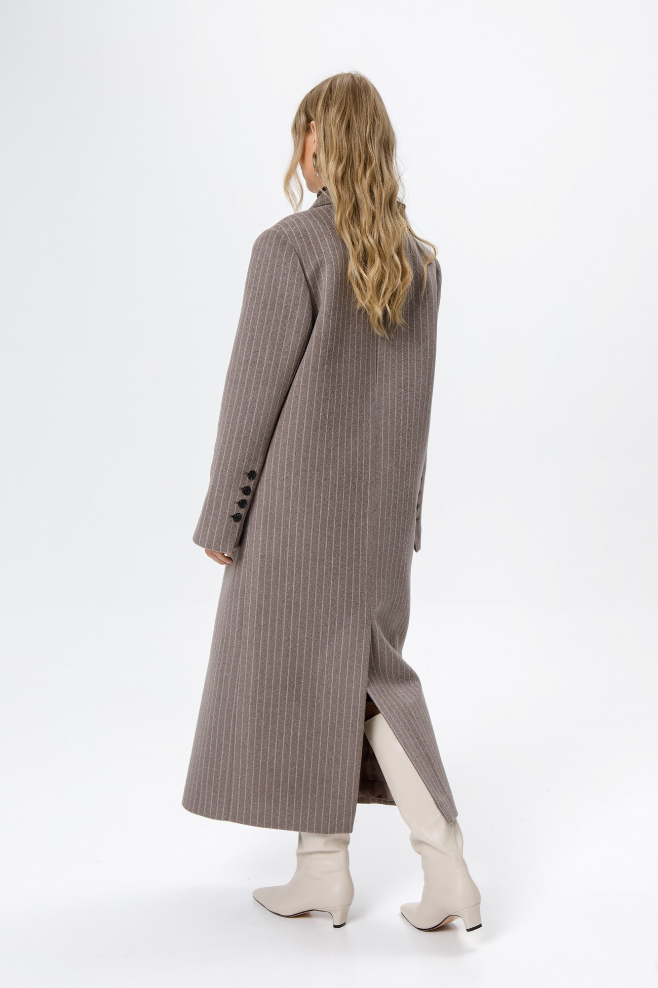Пальто свободного силуэта из ткани в полоску. Детали: прямой силуэт, свободный покрой, расширенная линия плеч, пиджачный воротник, двубортная застежка на петли и пуговицы, рукава втачные со шлицей, функциональные карманы, спинка со средним швом и высокой шлицей, пальто на подкладке.