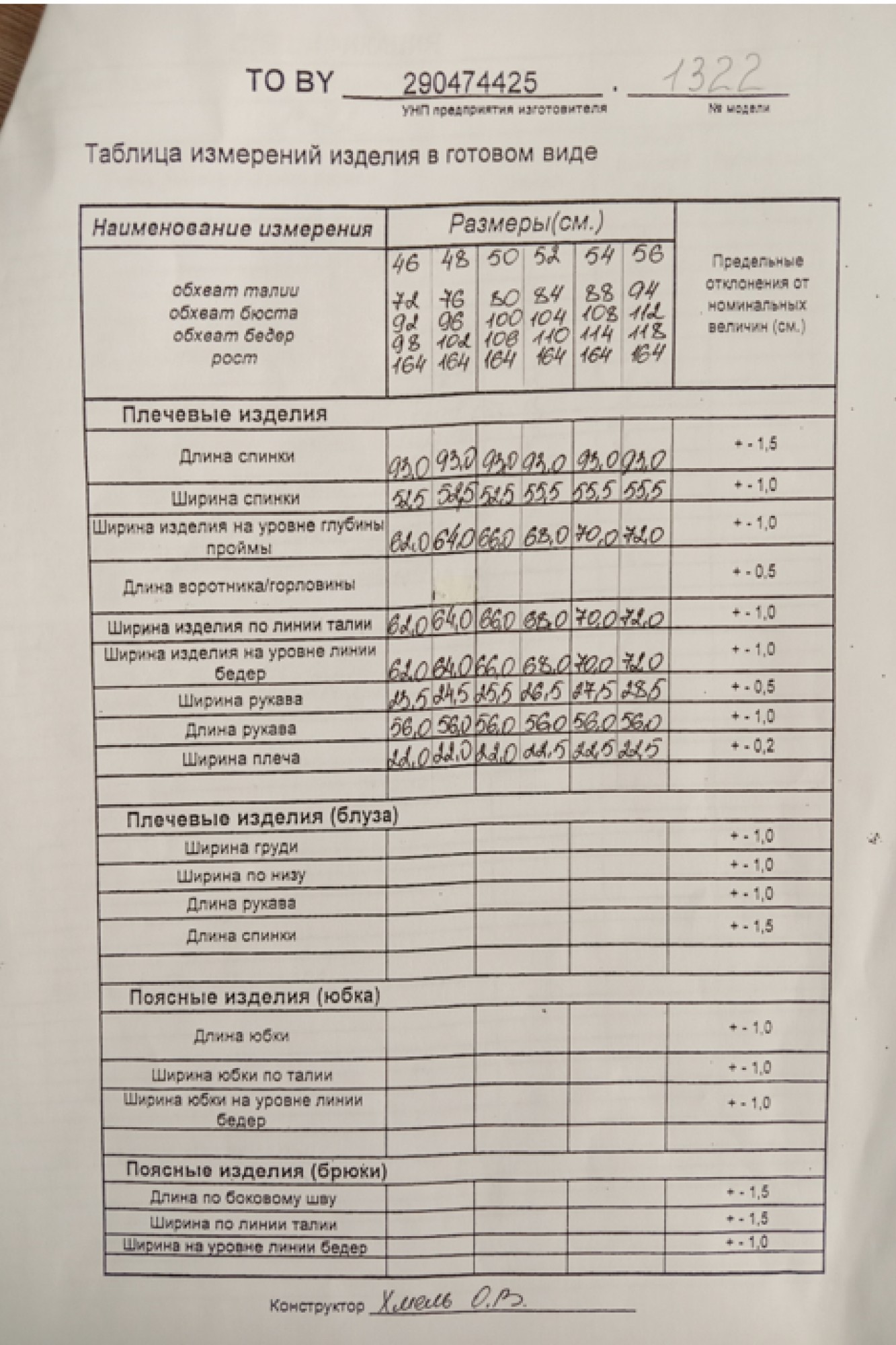 Таблица размеров
