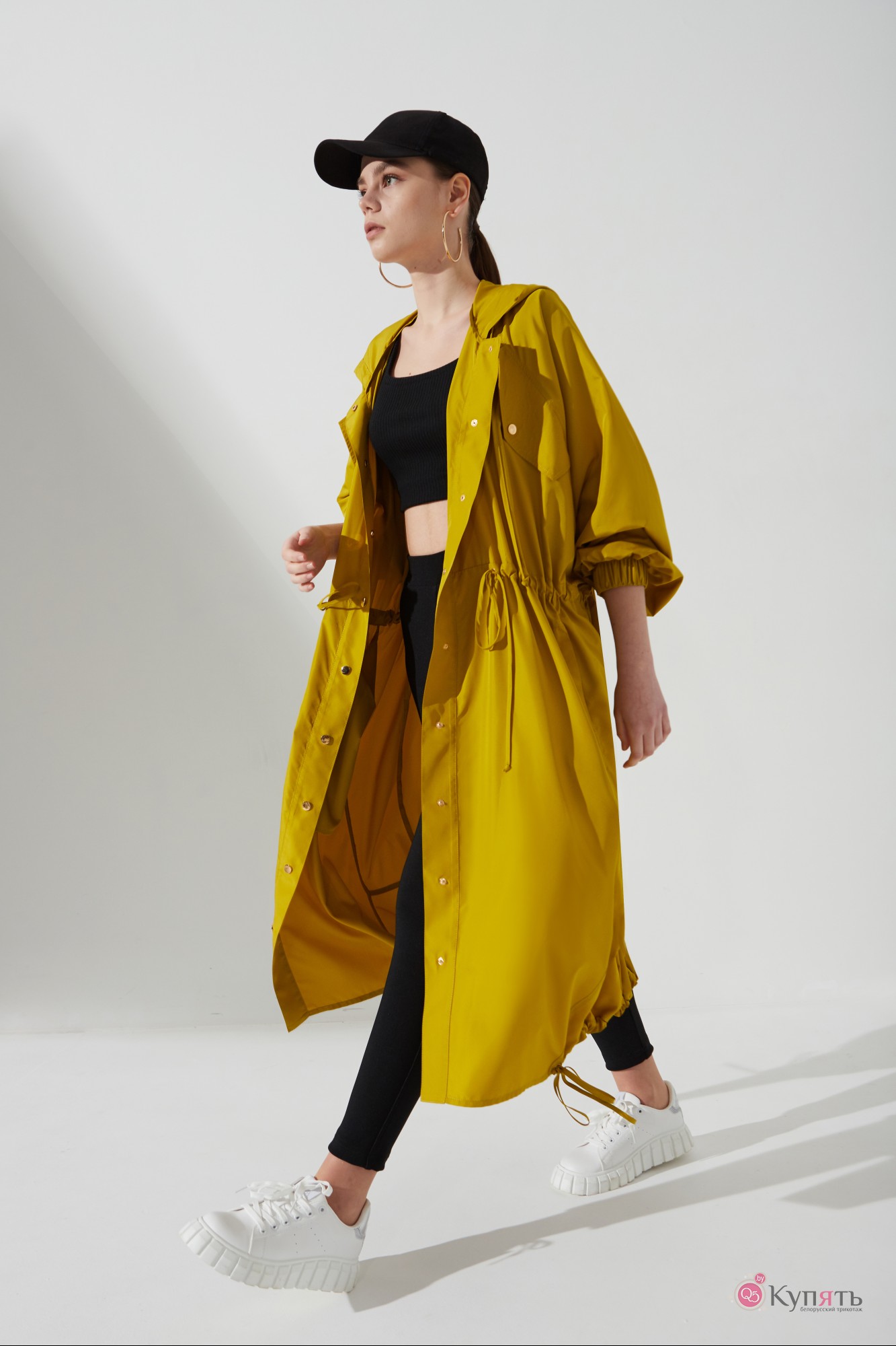 Кардиган из тонкой плащёвой ткани, свободного кроя «оверсайз» длиной выше щиколотки. На уровне талии подрез с кулисой. Рукава реглан, длиной до запястья с притачными манжетами с эластичной тесьмой. Кардиган с капюшоном, без воротника, без подкладки. Верхние части переда с фигурными клапанами, входящими в шов втачивания рукавов, угол клапана закреплён пробивной кнопкой к деталям переда. Верхняя часть спинки без особенностей. Нижние части переда с фигурными рельефами, с функциональными карманами, с листочкой в швах притачивания боковых деталей переда. Нижняя часть спинки с горизонтальным подрезом, переходящим в рельеф переда. Капюшон из трёх деталей с застроченной кулисой по переднему краю, и втянутым шнуром. Застёжка центральная, от горловины до низа, на пробивные кнопки на притачной планке. По швам стачивания рельефов и подрезов, по деталям клапанов и планок прострочена отделочная строчка. В кулису по талии втянут шнур. Линия низа профильная, с незначительным прогибом по спинке, от швов рельефов переда низ обтачивается кулисой и втягивается шнур.