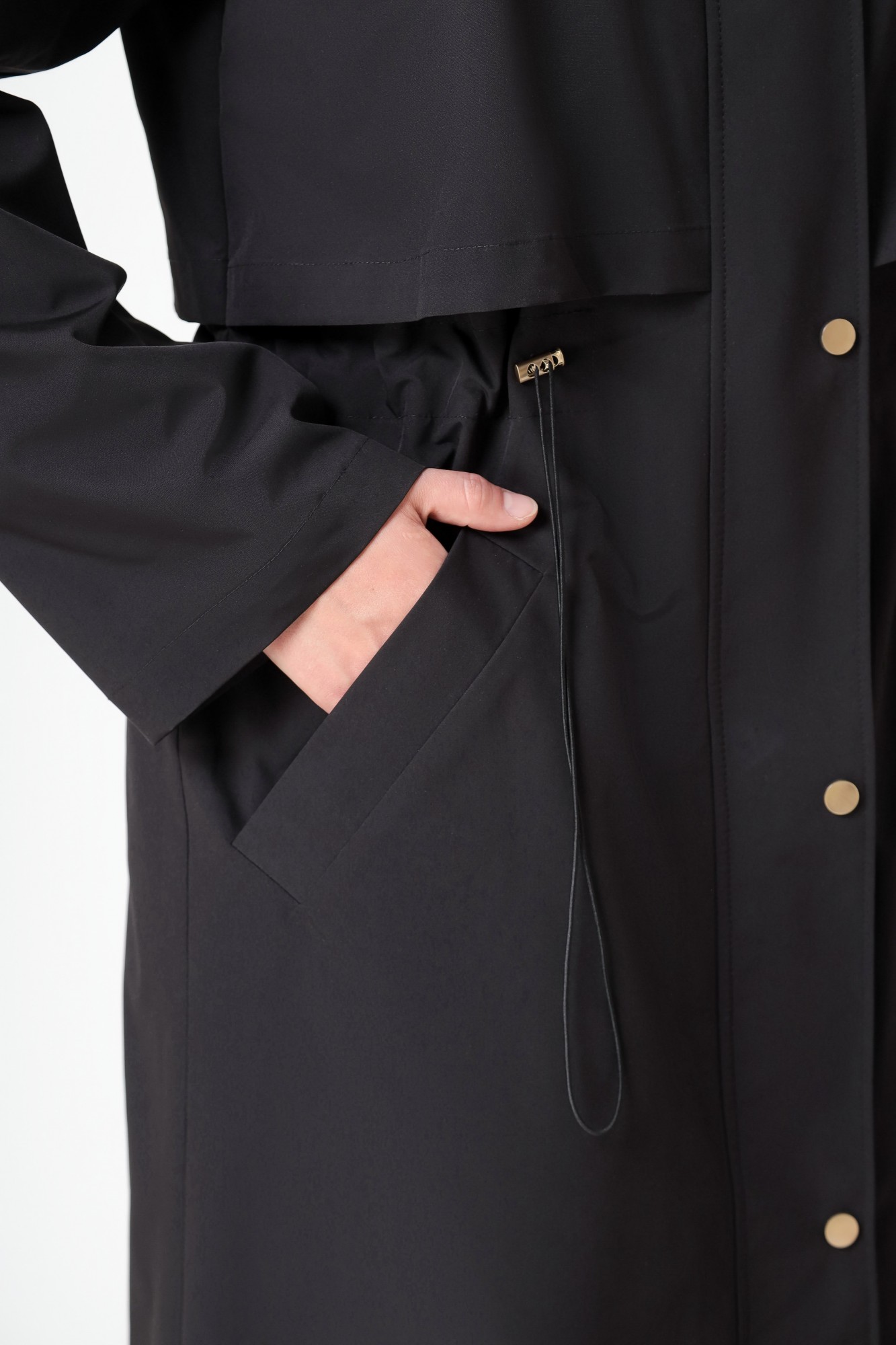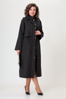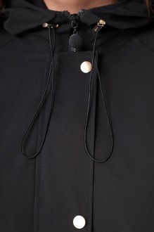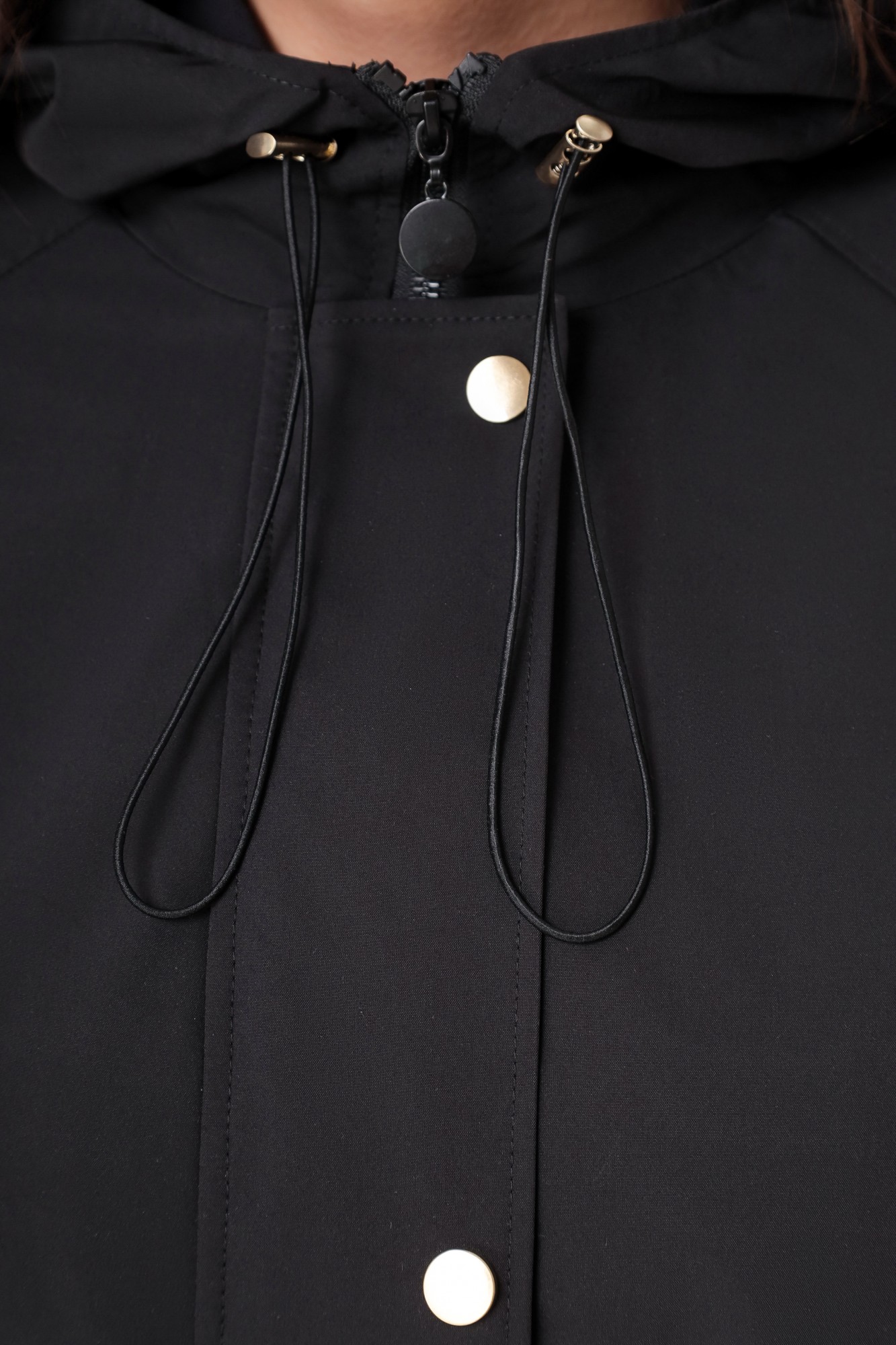 Плащ женский прямого силуэта, выполнен из качественной голландской плащевой ткани. Рукав длинный, "реглан". Плащ со стойкой и капюшоном. Изделие с центральной застёжкой на тесьму-молнию. Молния закрыта планкой, которая застёгивается на пробивные декоративные кнопки. По переду и спинке плаща - отлетная кокетка. По спинке кокетки заложена встречная складка, которая застёгивается патой на пробивную кнопку. В нижней части переда обработаны прорезные карманы с листочками. Капюшон и талия регулируется двойными резинками и фиксаторами. В нижней центральной части спинки обработана шлица.