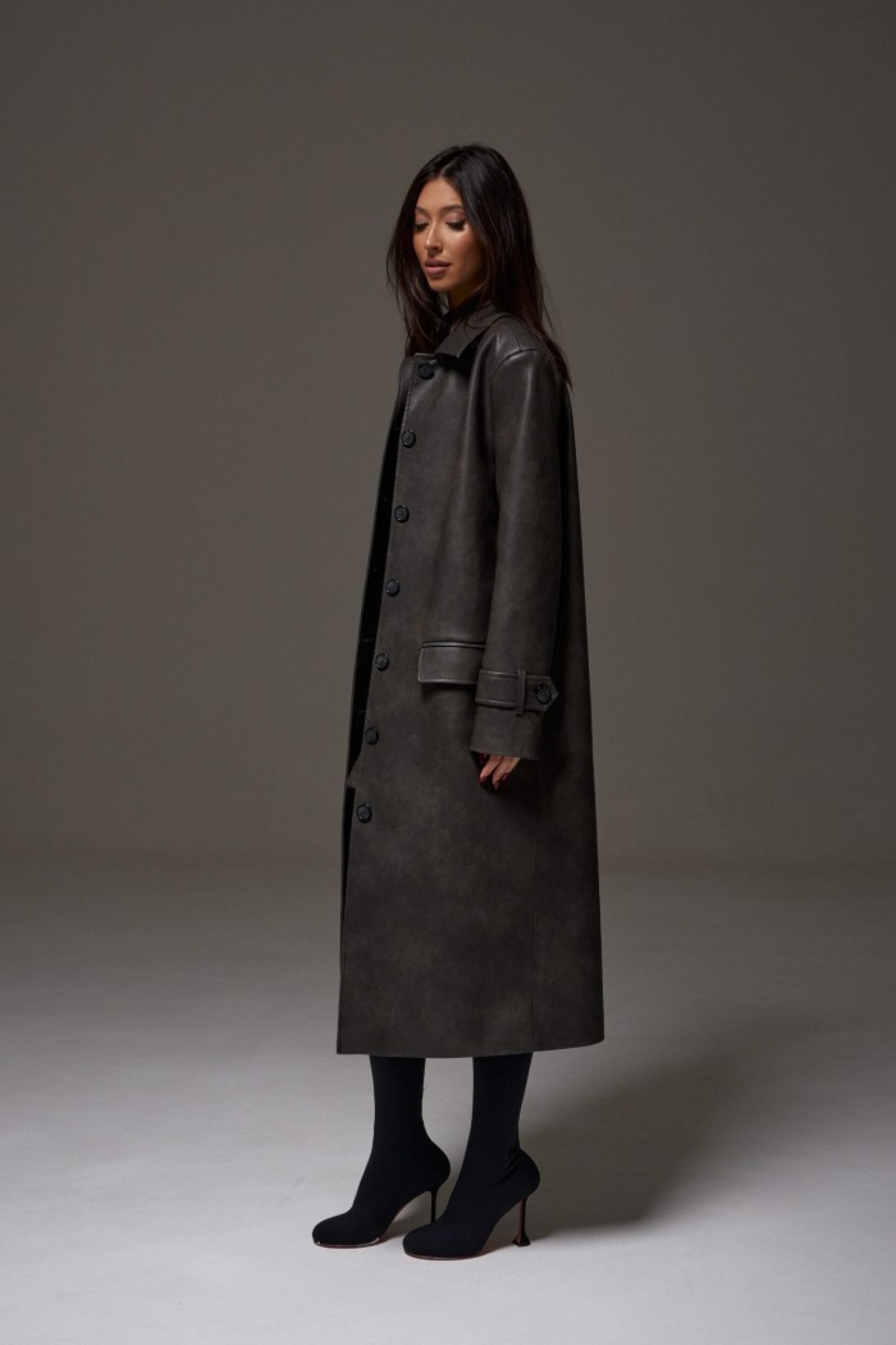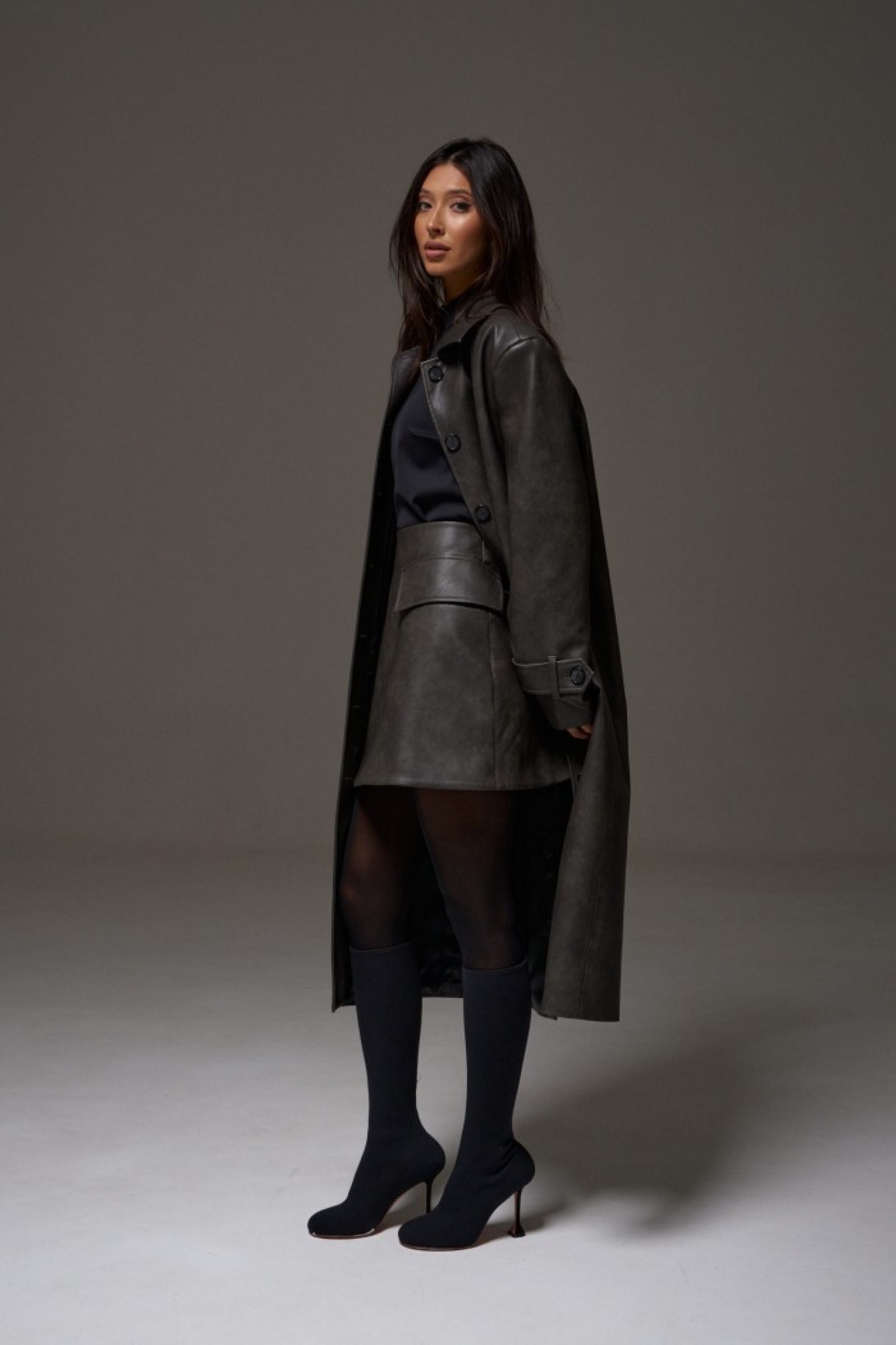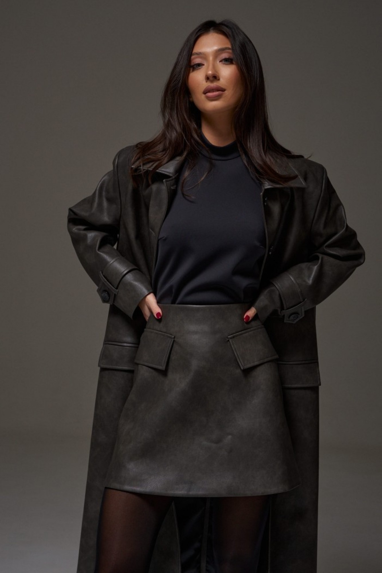 Удлиненный жакет прямого свободного кроя, выполнен из экокожи. Характеристики: отложной воротник, застежка центральная на петли - пуговицы. Брендированная подкладка, подплечники. Рукав втачной, по низу рукава пата с пуговицей. В комплекте идет пояс из основной ткани изделия. По переду карманы с клапаном. В среднем шве спинки шлица 44см.