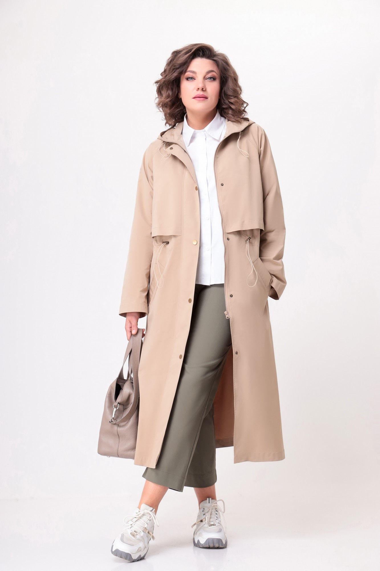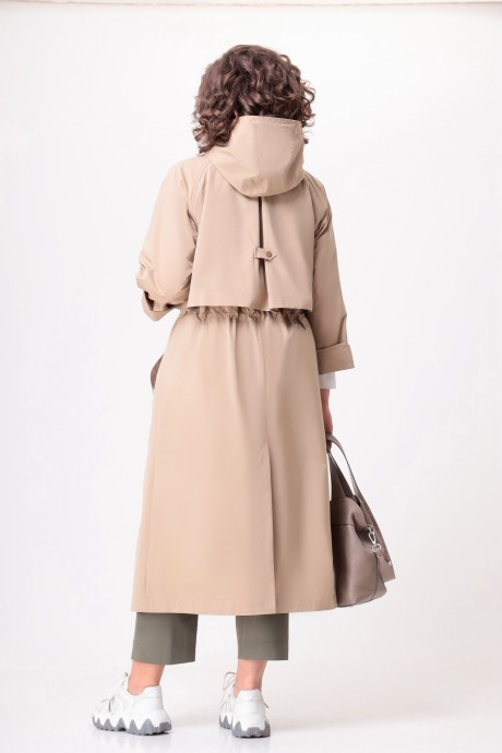 Плащ женский прямого силуэта, выполнен из качественной голландской плащевой ткани. Рукав длинный, реглан. Плащ со стойкой и капюшоном. Изделие с центральной застёжкой на тесьму-молнию. Молния закрыта планкой, которая застёгивается на пробивные декоративные кнопки. По переду и спинке плаща - отлетная кокетка. По спинке кокетки заложена встречная складка, которая застёгивается патой на пробивную кнопку. В нижней части переда обработаны прорезные карманы с листочками. Капюшон и талия регулируется двойными резинками и фиксаторами. В нижней центральной части спинки обработана шлица.