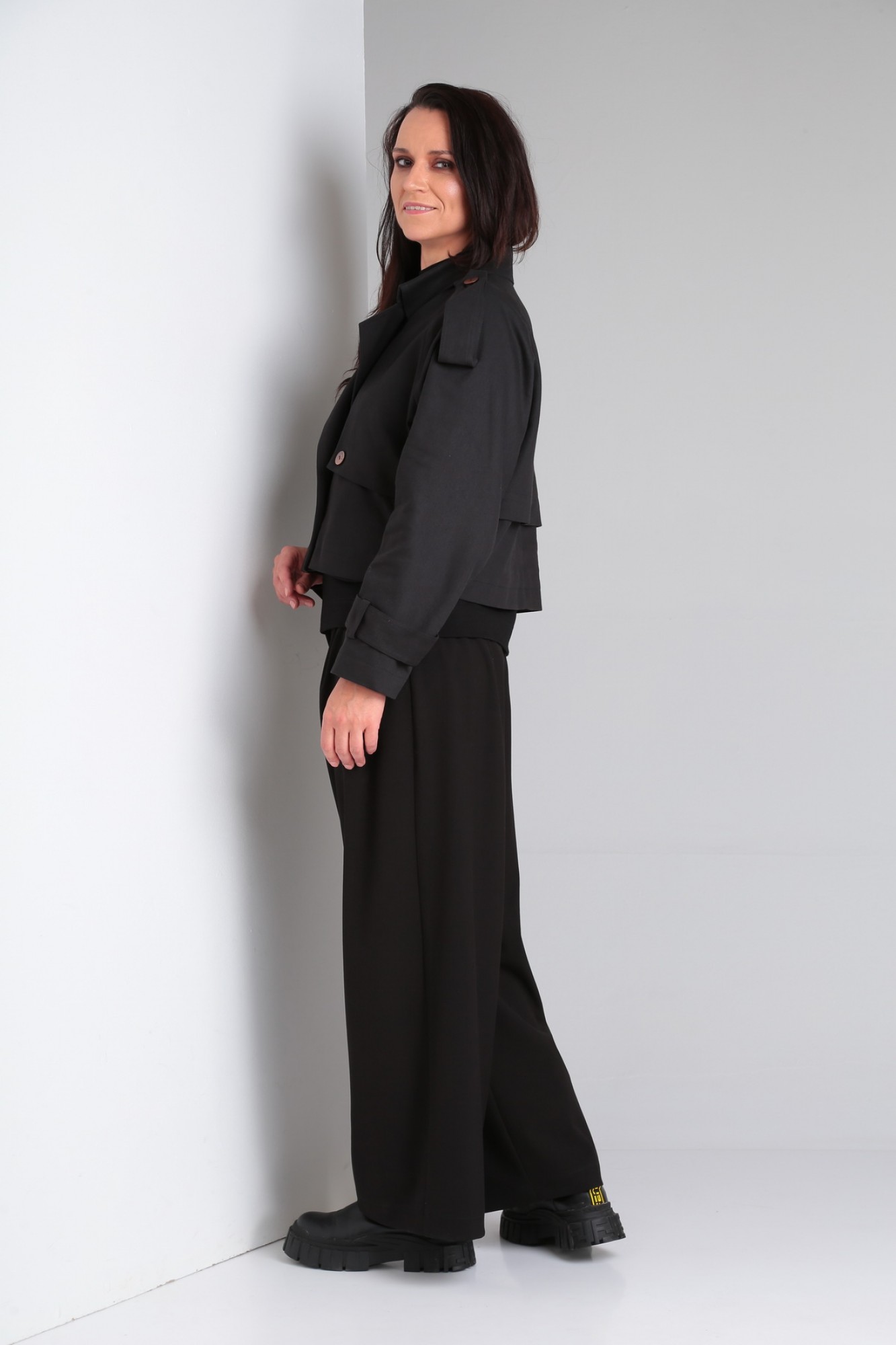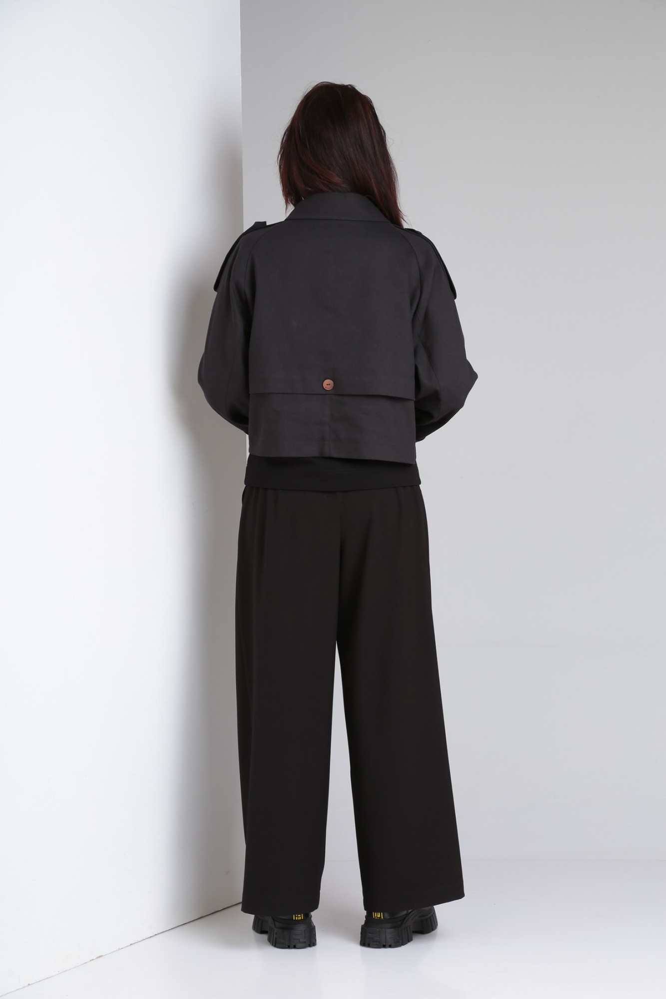 Трэнч двубортный, укороченный прямого силуэта, оверсайз, с рукавом реглан и центральной бортовой застежкой. По переду и спинке отлетные кокетки. Воротник стояче-отложной с отрезной стойкой. По низу рукава и плечевой швам декоративные паты.