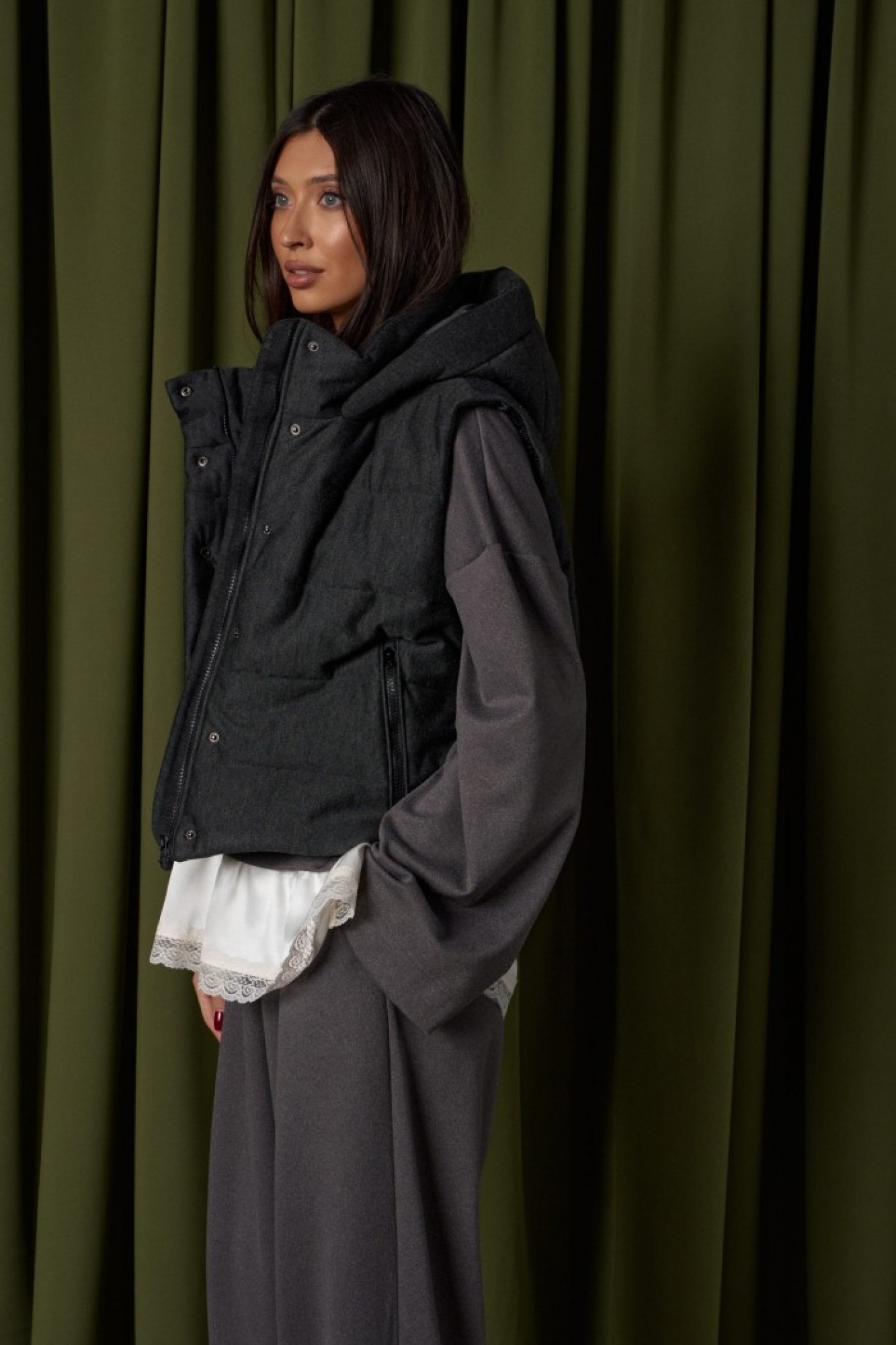 Жилет укороченный, выполнен из стеганной трикотажной ткани графитового цвета. Характеристика: жилет А-силуэта, воротник стойка, капюшон цельный с жилетом, центральная застежка на молнию, скрывается под планкой на кнопках, боковые карманы на молнии, по низу изделия резинка с фиксаторами, брендированный подклад, спинка цельнокроеная.