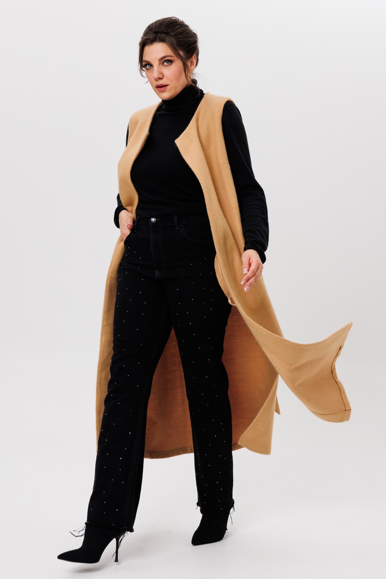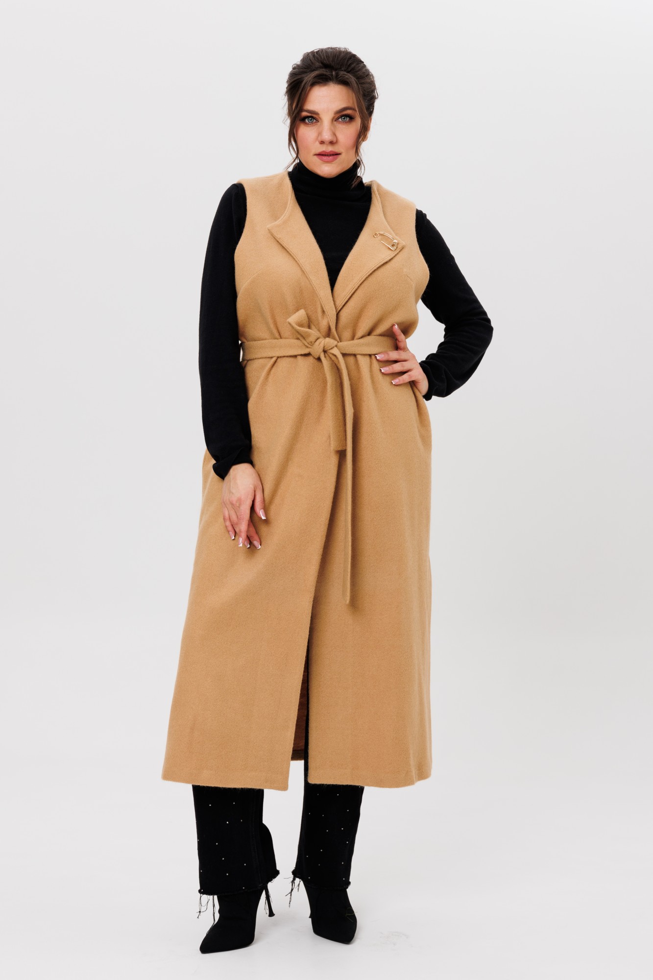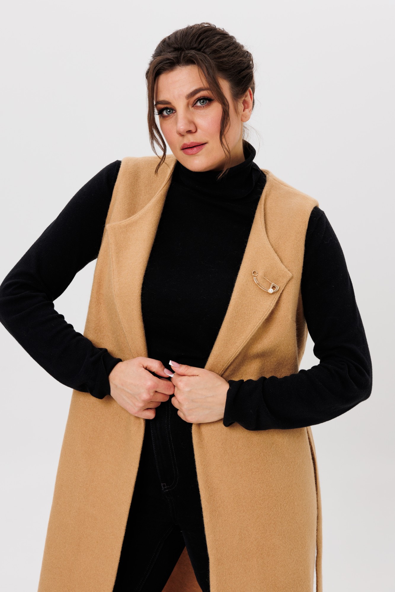 Длинный жилет «must have» в гардеробе этого сезона. Универсальное изделие подойдет к любому стилю одежды. Можно носить как поверх худи, так и классической рубашки, водолазки; как с кроссовками, так и на шпильке. Жилет выполнен из пальтовой ткани без подкладки, в боковых швах есть функциональные карманы, а низ дополняют разрезы. В комплект входит нарядная брошка и пояс.