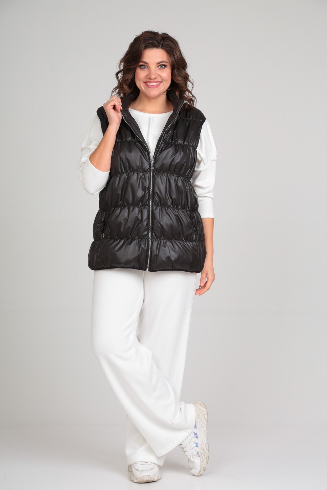 Жилетка женская, прямого силуэта с центральной застёжкой на молнию. По переду рельефные швы от проймы до низа, в рельефах обработаны карманы. Воротник-стойка.В качестве отделки используется отделочная строчка-венгеркой. Срезы проймы,низа - окантованы. Жилетка на подкладке.