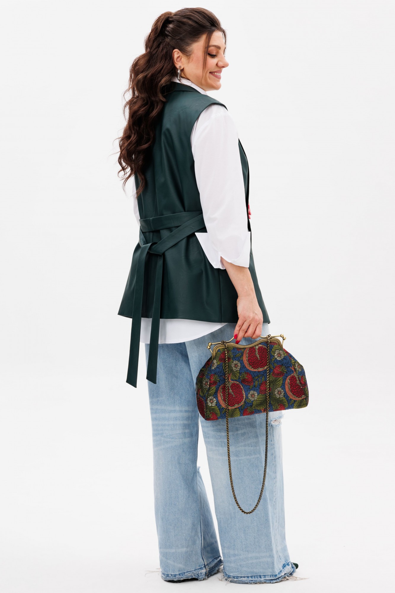 Изысканный жилет от Анелли из высококачественной эко-кожи. Этот полуприлегающий жилет с утончённой однобортной застёжкой на петли и пуговицы станет великолепным дополнением вашего гардероба. Прорезные карманы с аккуратным клапаном и изящный воротник с отложными лацканами придают ему утончённый и стильный вид. Входящий в комплект пояс эффектно подчеркивает талию, создавая идеальный силуэт и добавляя нотку женственности. Жилет прекрасно сочетается как с классическими брюками, так и с романтичными юбками, а также выглядит потрясающе на платьях. Он станет ярким акцентом в вашем образе, подчеркивая ваш безупречный вкус и уникальную индивидуальность. С этим шикарным жилетом у вас есть бесконечные возможности для стилизации — дайте волю своей фантазии и создавайте уникальные образы, которые будут восхищать окружающих каждый день! На модели в жилете цвета «яшмово зеленый» платье из шифона 1504 и белая рубашка 1203.1.