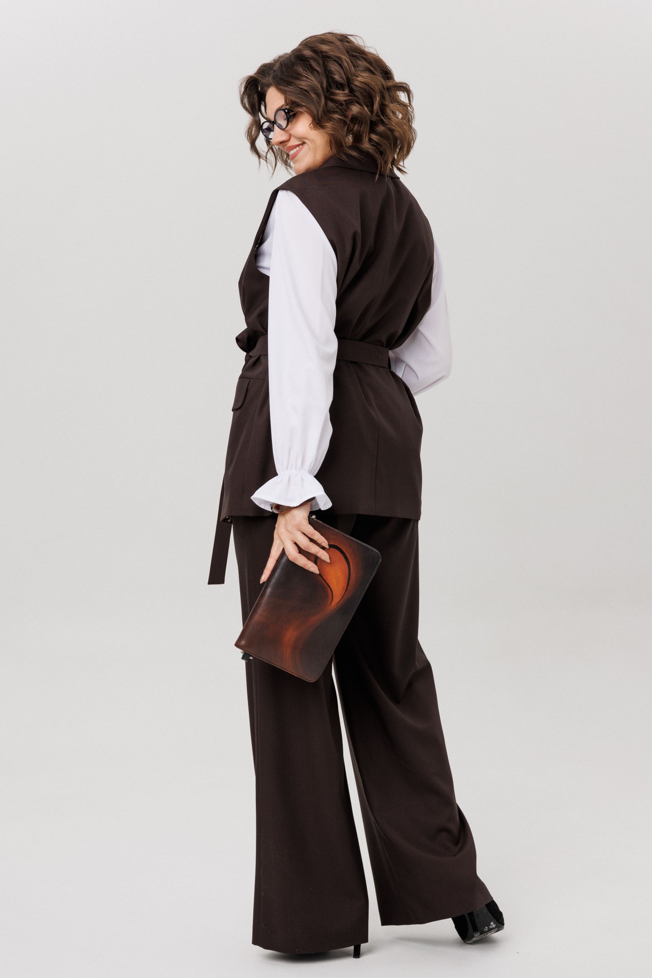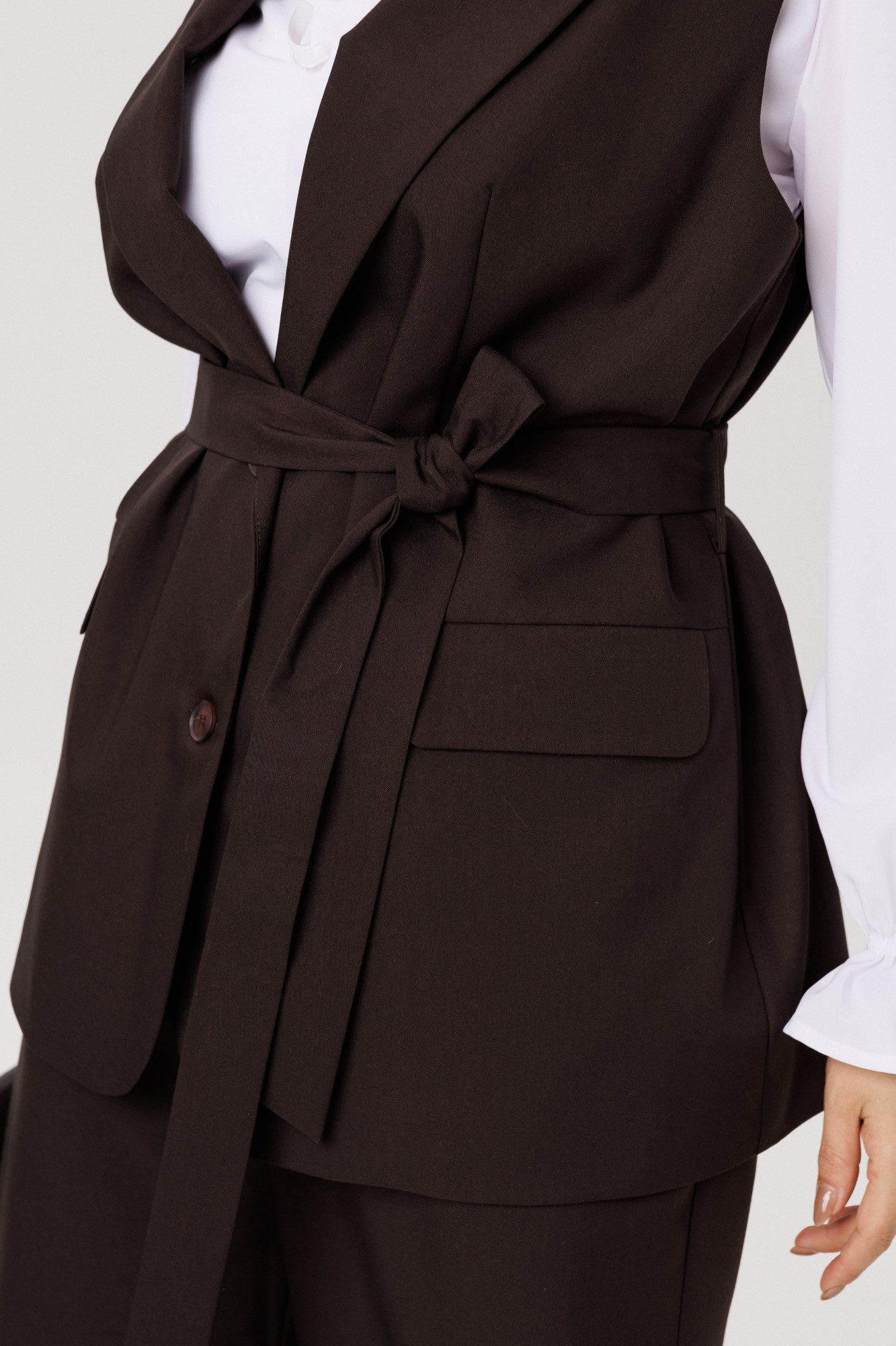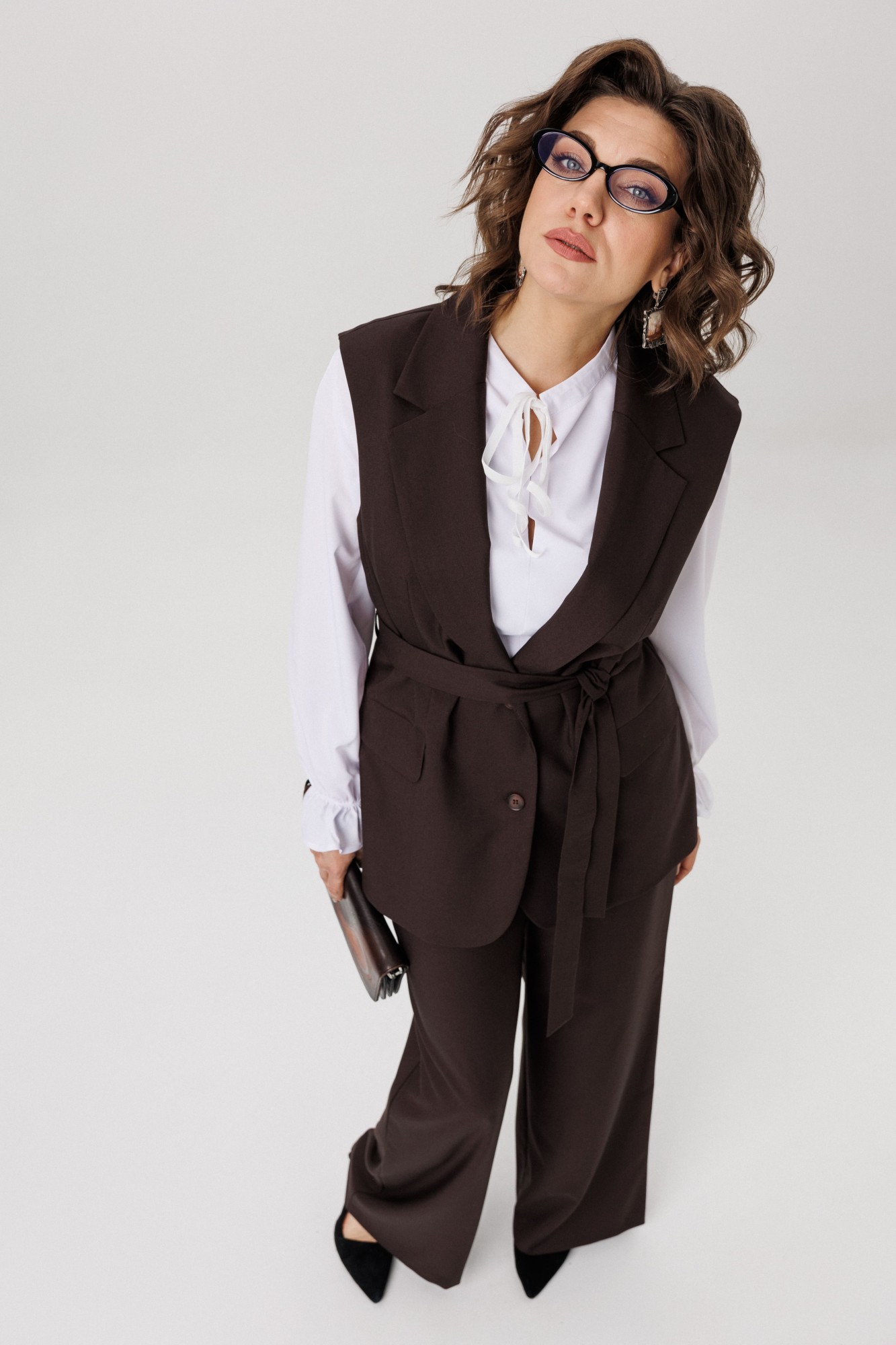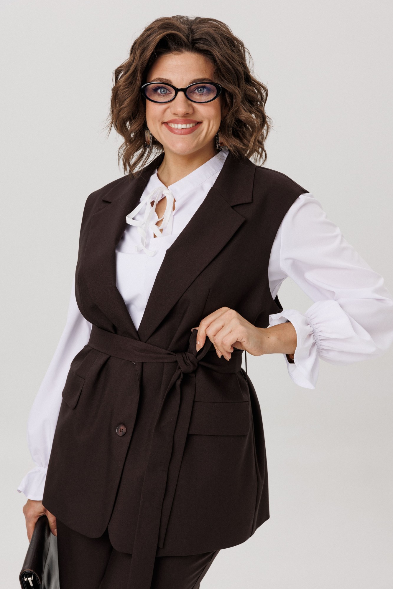 Изысканный жилет от Анелли на каждый день. Этот полуприлегающий жилет с утончённой однобортной застёжкой на петли и пуговицы станет великолепным дополнением вашего гардероба. Прорезные карманы с аккуратным клапаном и изящный воротник с отложными лацканами придают ему утончённый и стильный вид. Входящий в комплект пояс эффектно подчеркивает талию, создавая идеальный силуэт и добавляя нотку женственности. Жилет прекрасно сочетается как с классическими брюками, так и с романтичными юбками, а также выглядит потрясающе на платьях. Он станет ярким акцентом в вашем образе, подчеркивая ваш безупречный вкус и уникальную индивидуальность. С этим шикарным жилетом у вас есть бесконечные возможности для стилизации — дайте волю своей фантазии и создавайте уникальные образы, которые будут восхищать окружающих каждый день! На модели брюки 1702 и блуза 1281. Также, можно купить жилет и брюки в костюме 1501.