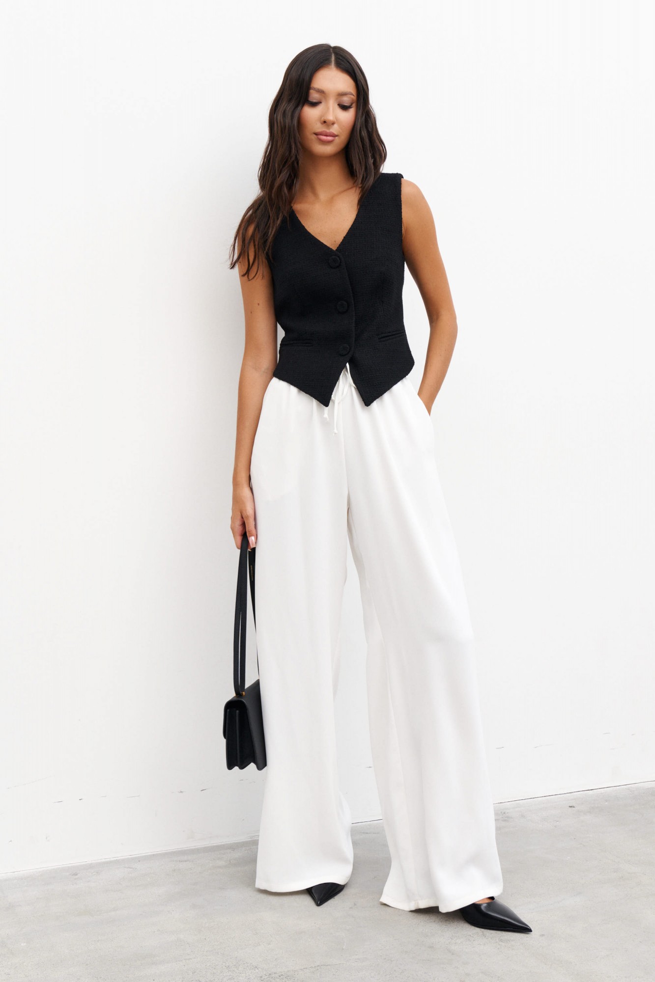 Жилет прямого кроя выполнен из фактурного полотна черного цвета. Характеристики: однобортный, прямой крой, подкладка, прорезные карманы обманки, застежка центральная на петли - пуговицы, низ изделия по переду с фигурным низом.