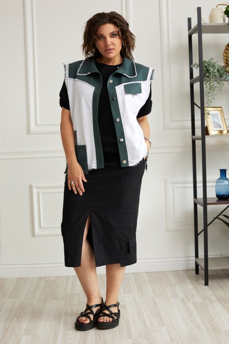 Жилет прямого кроя, в стиле Оверсайз. Выполнен из двух видов ткани, плотного трикотажа и джинса. Современная модель, притягивающая к себе интерес. Легко сочетается и подходит к разнообразным образам и стилям.