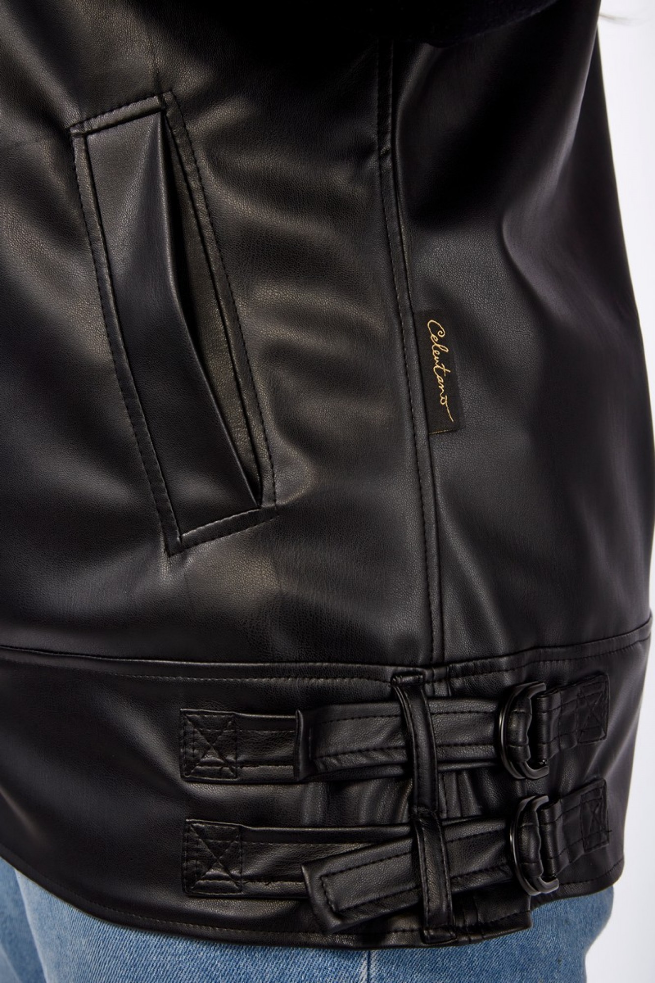 Модный жилет из экокожи от Celentano. Полочка и спинка жилета с кокеткой. Пройма жилета по спинке и полочке с притачной фигурной закрытой планкой. На полочке функциональные карманы в рамку. Спинка цельнокроеная. Воротник втачной отложной. По низу изделия идет широкая планка, на которой расположена центральная застежка на две кнопки. По планке обработаны паты на шлевках с полукольцами.