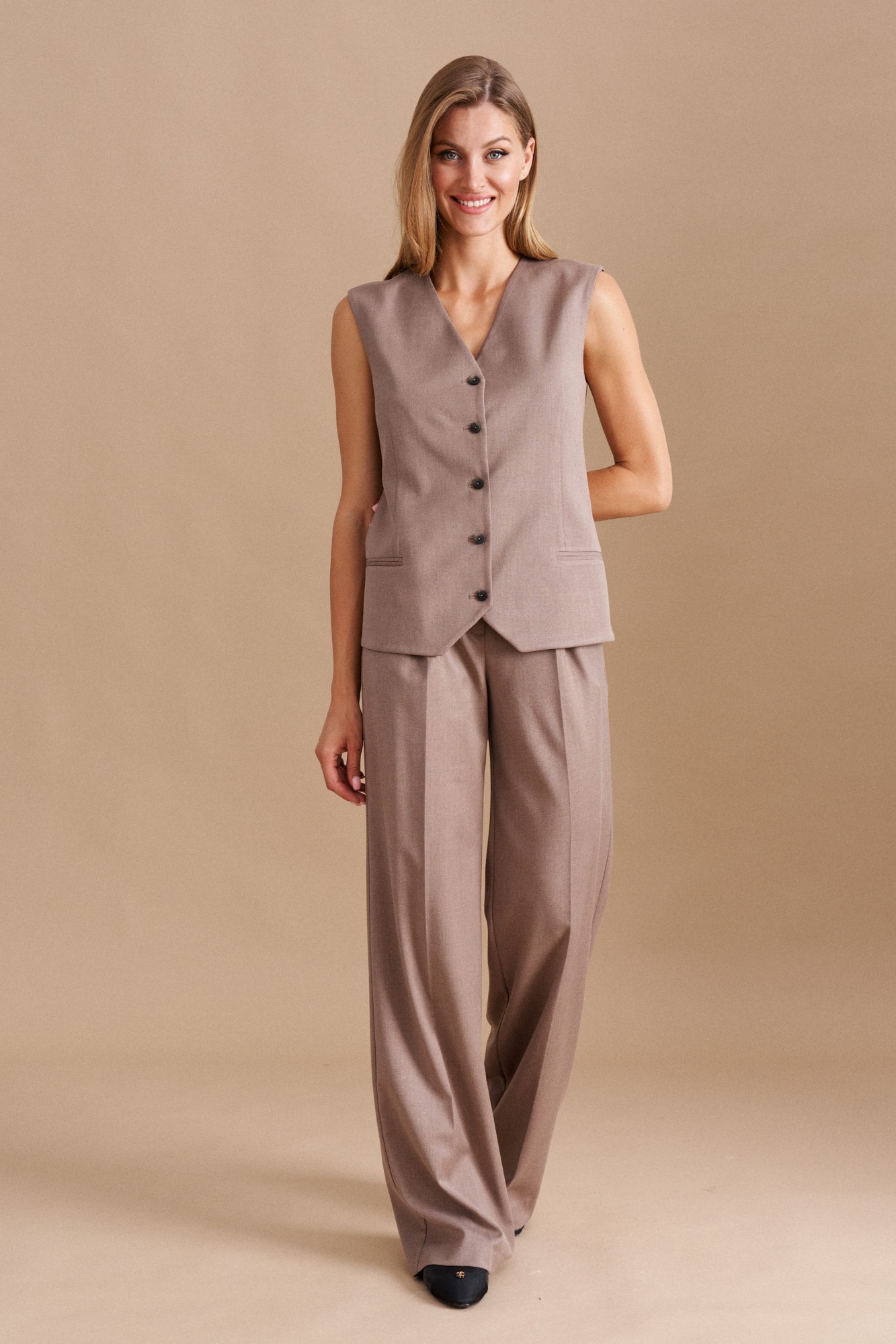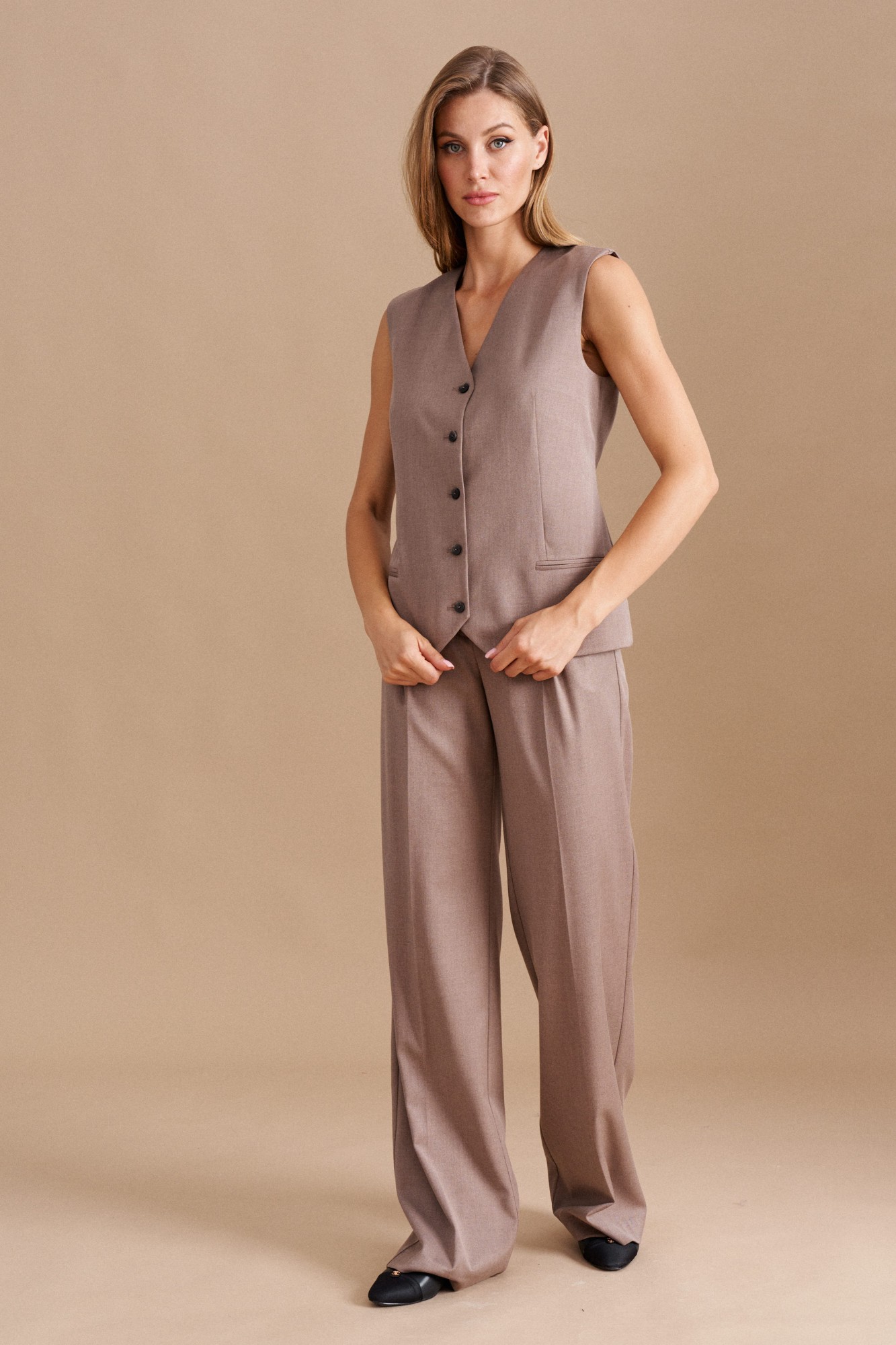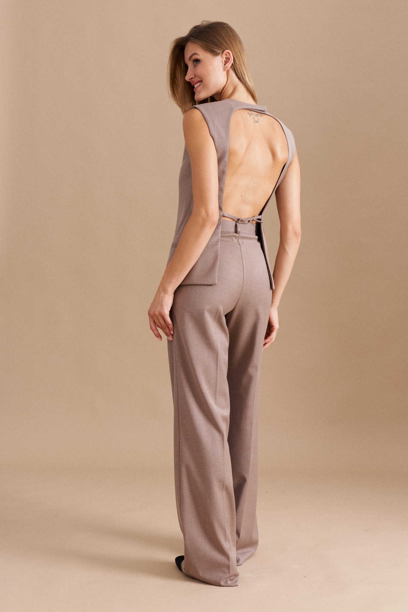 Жилет женский однобортный полуприлегающего силуэта из костюмной ткани, на подкладке. Застежка фронтальная на петли, пуговицы. Перед с имитацией прорезных карманов, талиевыми вытачками. Жилет с открытой спиной с двумя регулируемым ремешком. Длина изделия до линии бедер.