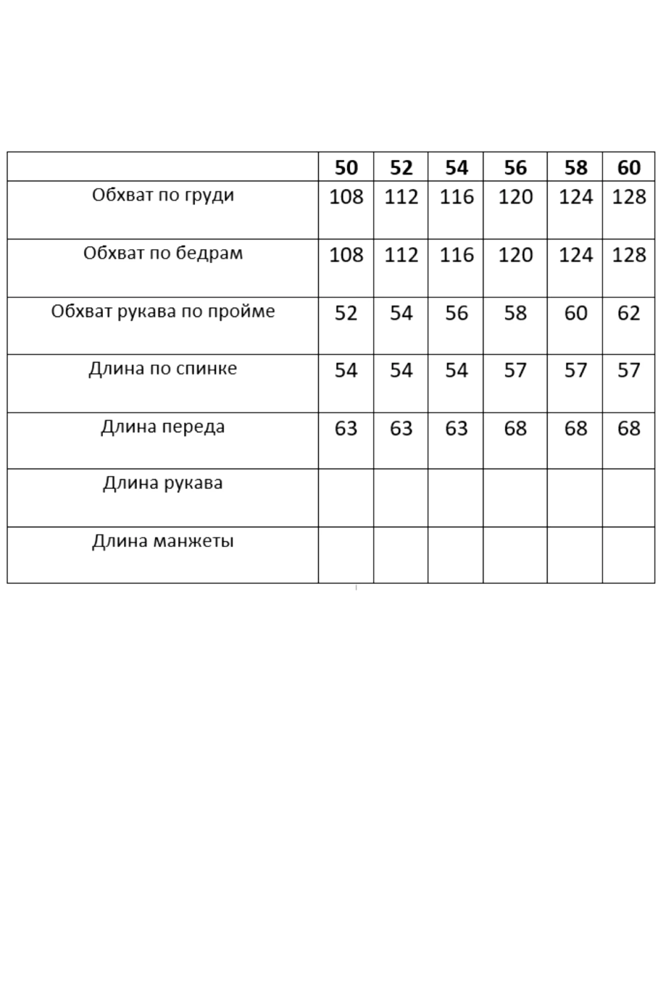 Таблица размеров