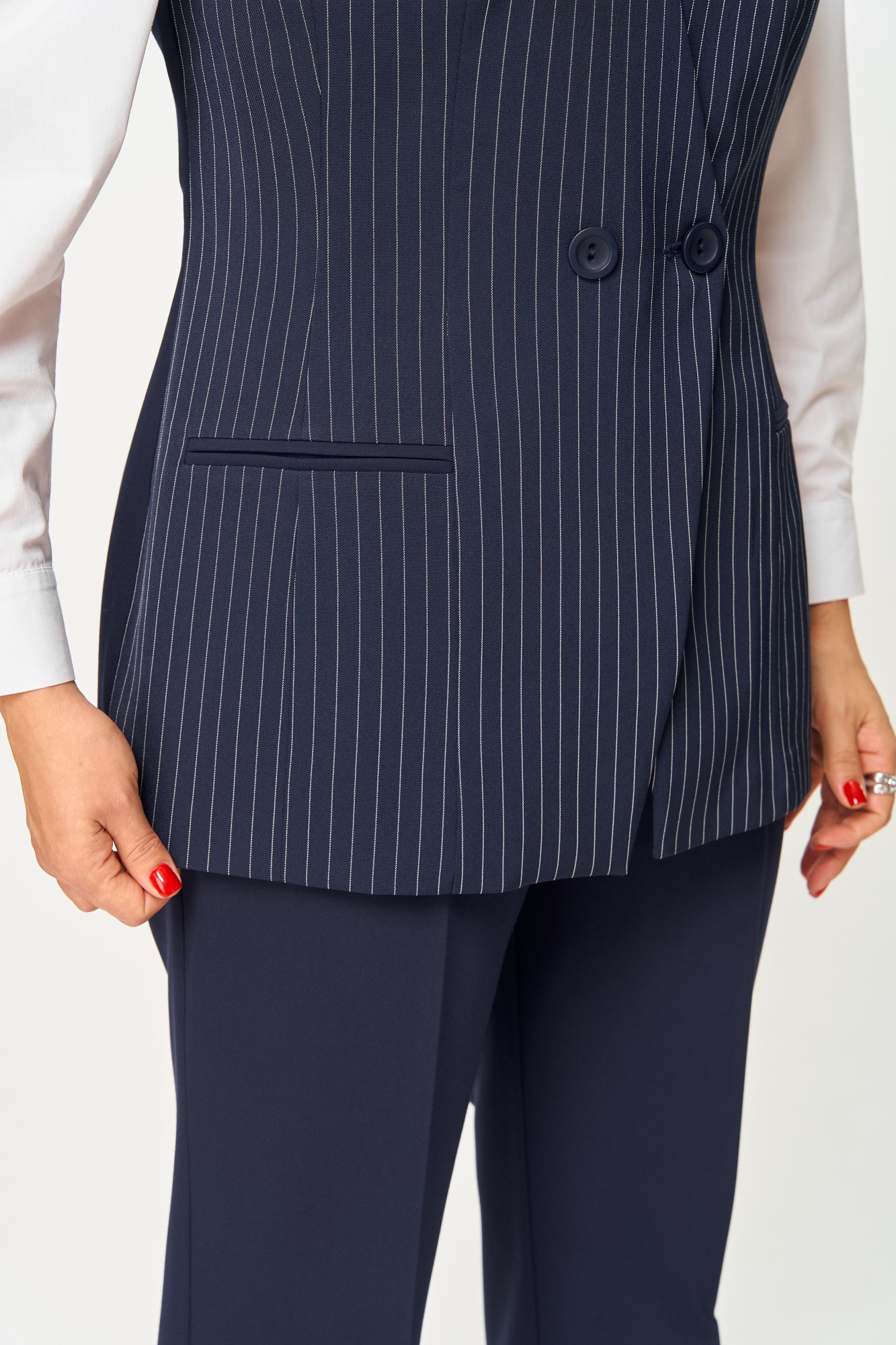 Жилет выполнен из однотонной ткани, в качестве отделки использована ткань в полоску. Жилет полуприлегающего силуэта, на подкладке. Полочка жилета с вертикальными рельефами и прорезными карманами в рамку. Застежка полочки двубортная на петли и пуговицы. Горловина V-образной формы. Полочка выполнена из отделочной ткани. Спинка со средним швом и вертикальными рельефами, выполнена из однотона.