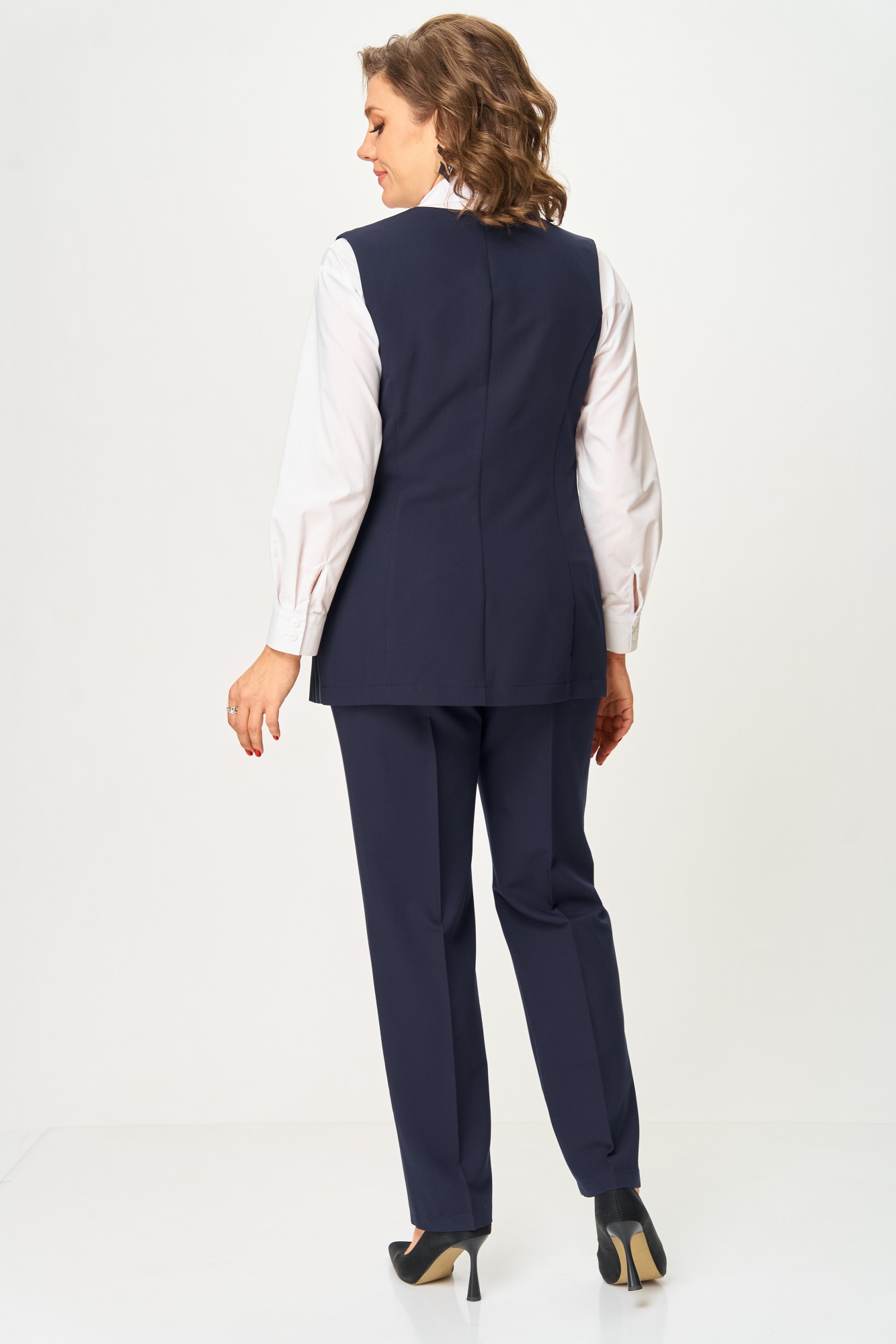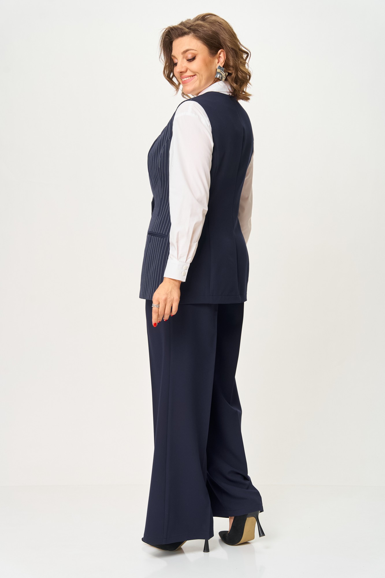 Жилет выполнен из однотонной ткани, в качестве отделки использована ткань в полоску. Жилет полуприлегающего силуэта, на подкладке. Полочка жилета с вертикальными рельефами и прорезными карманами в рамку. Застежка полочки двубортная на петли и пуговицы. Горловина V-образной формы. Полочка выполнена из отделочной ткани. Спинка со средним швом и вертикальными рельефами, выполнена из однотона.
