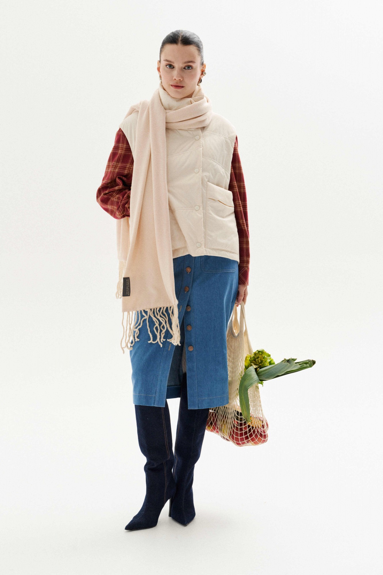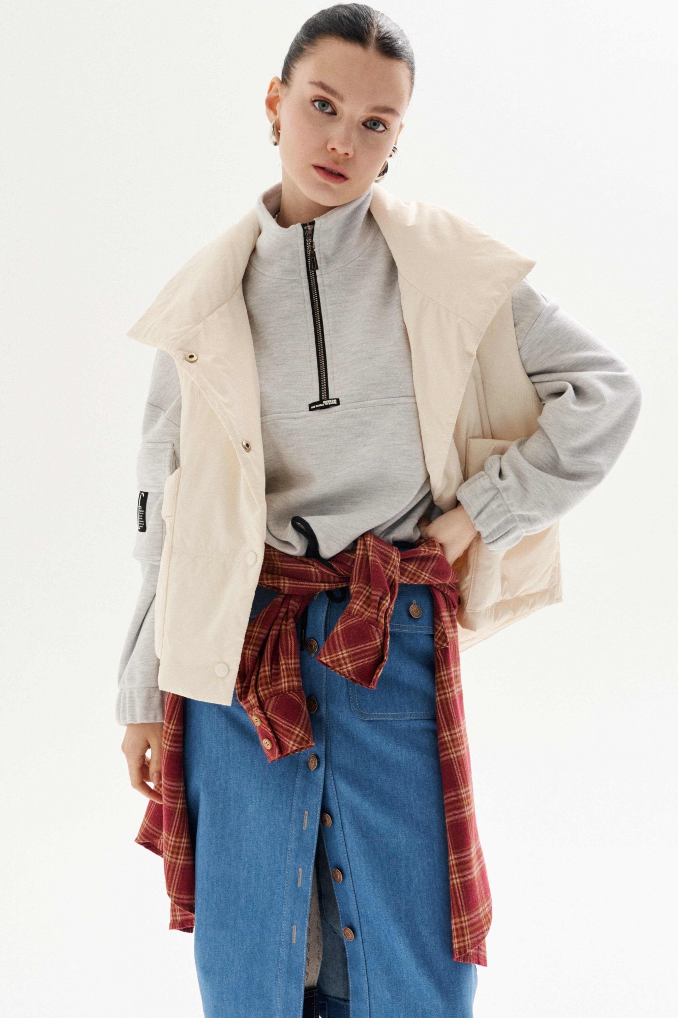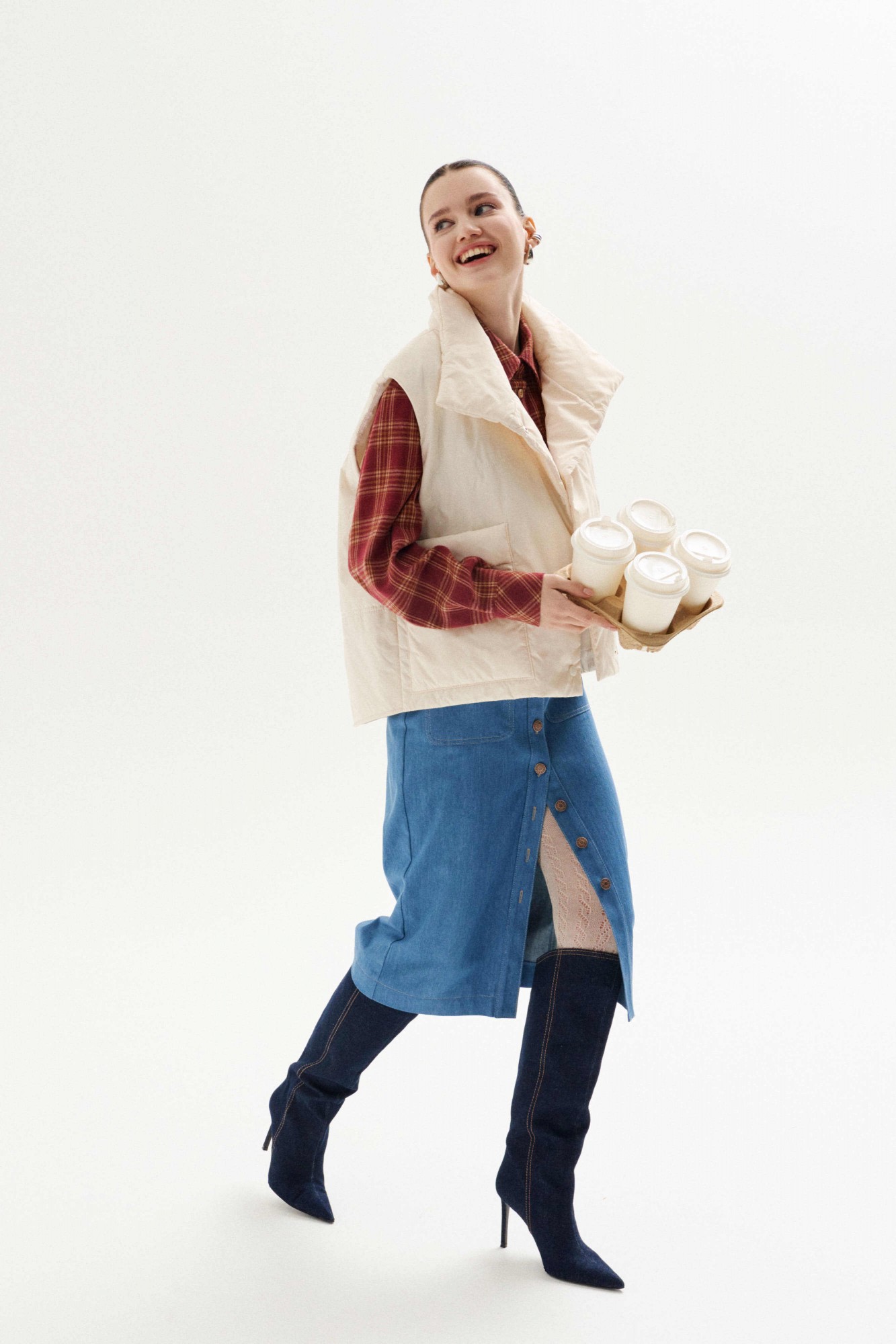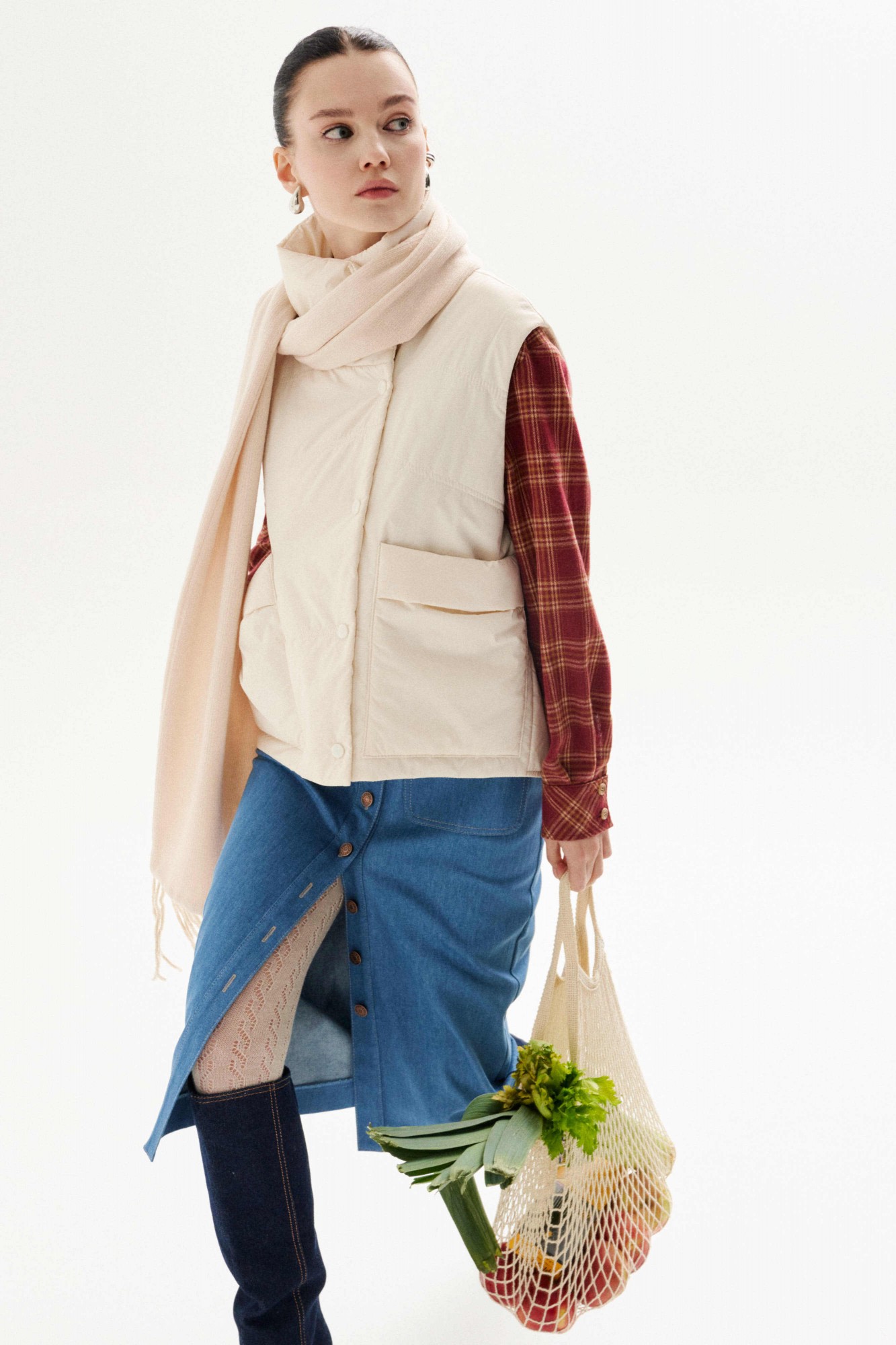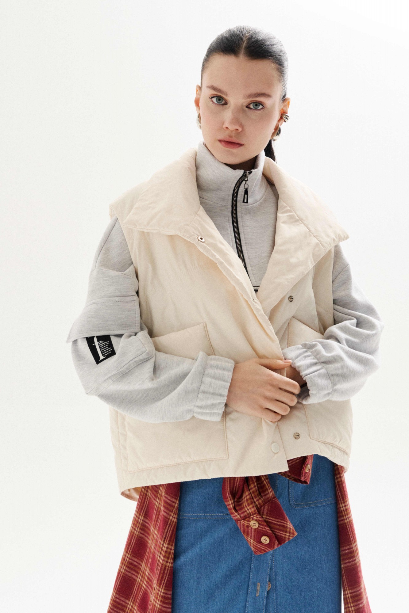 Жилет свободного кроя из плательной ткани на подкладке на синтепоне. По горловине воротник-стойка, по бокам накладные карманы. Застёжка на кнопки.