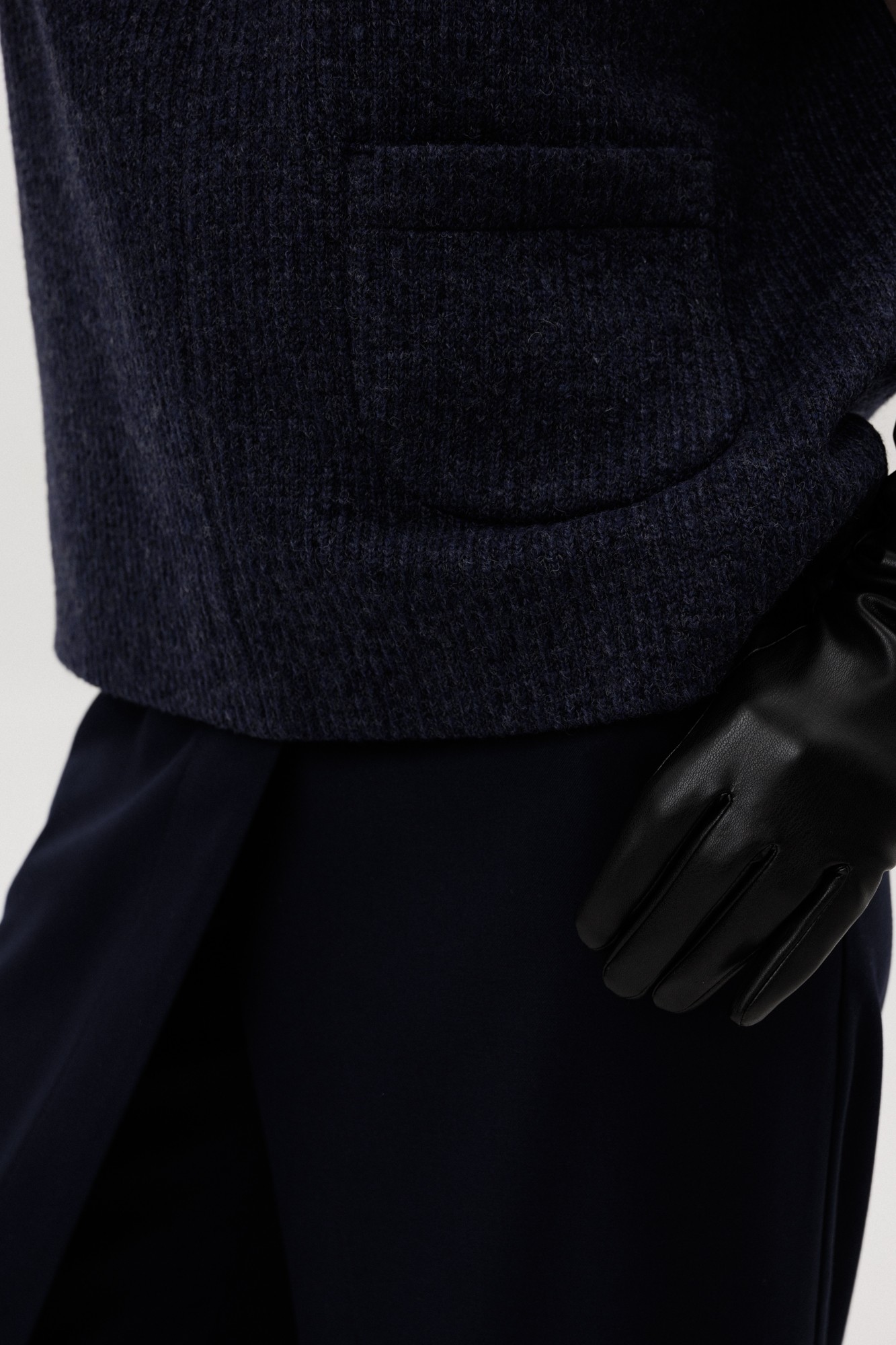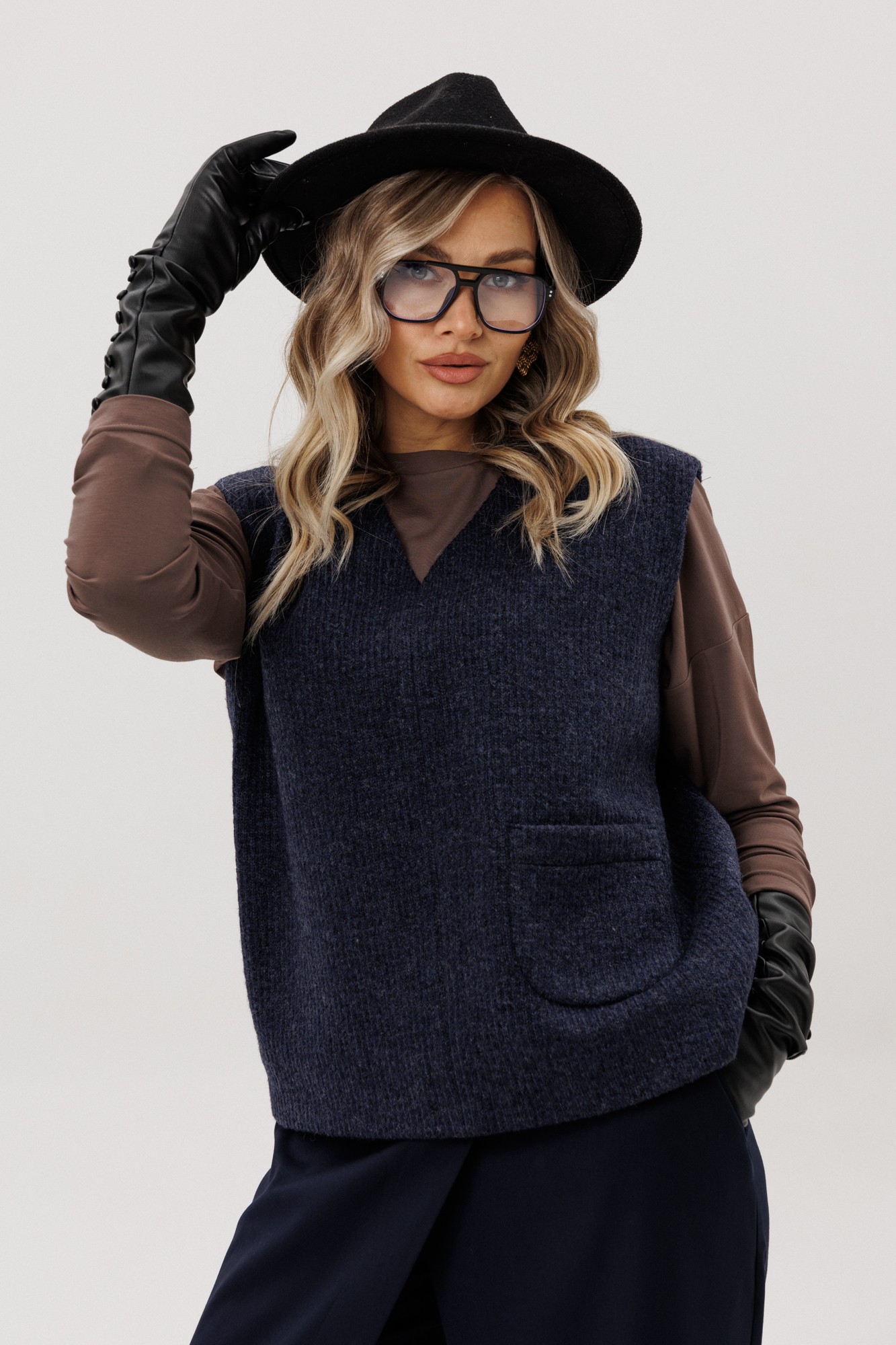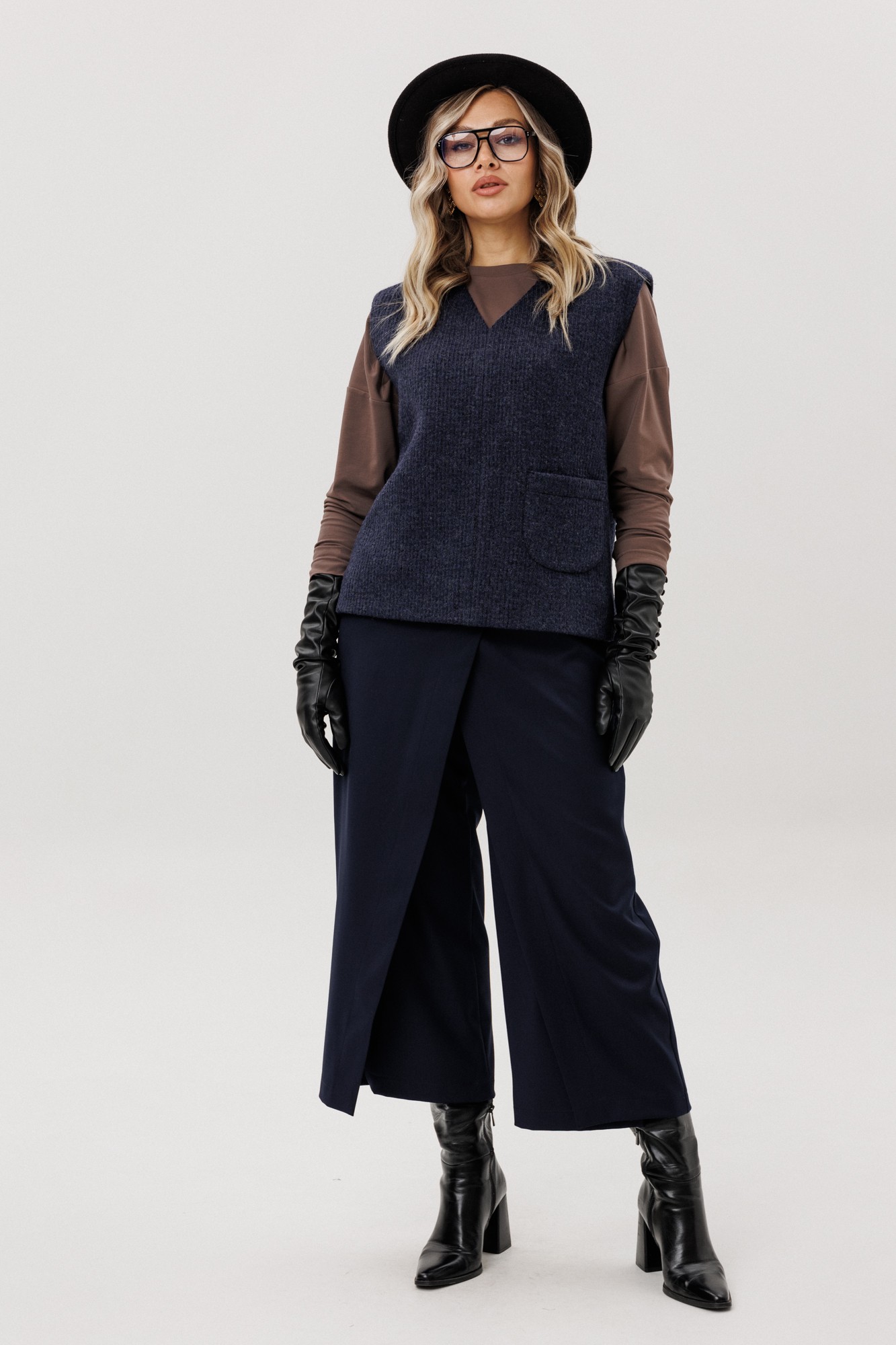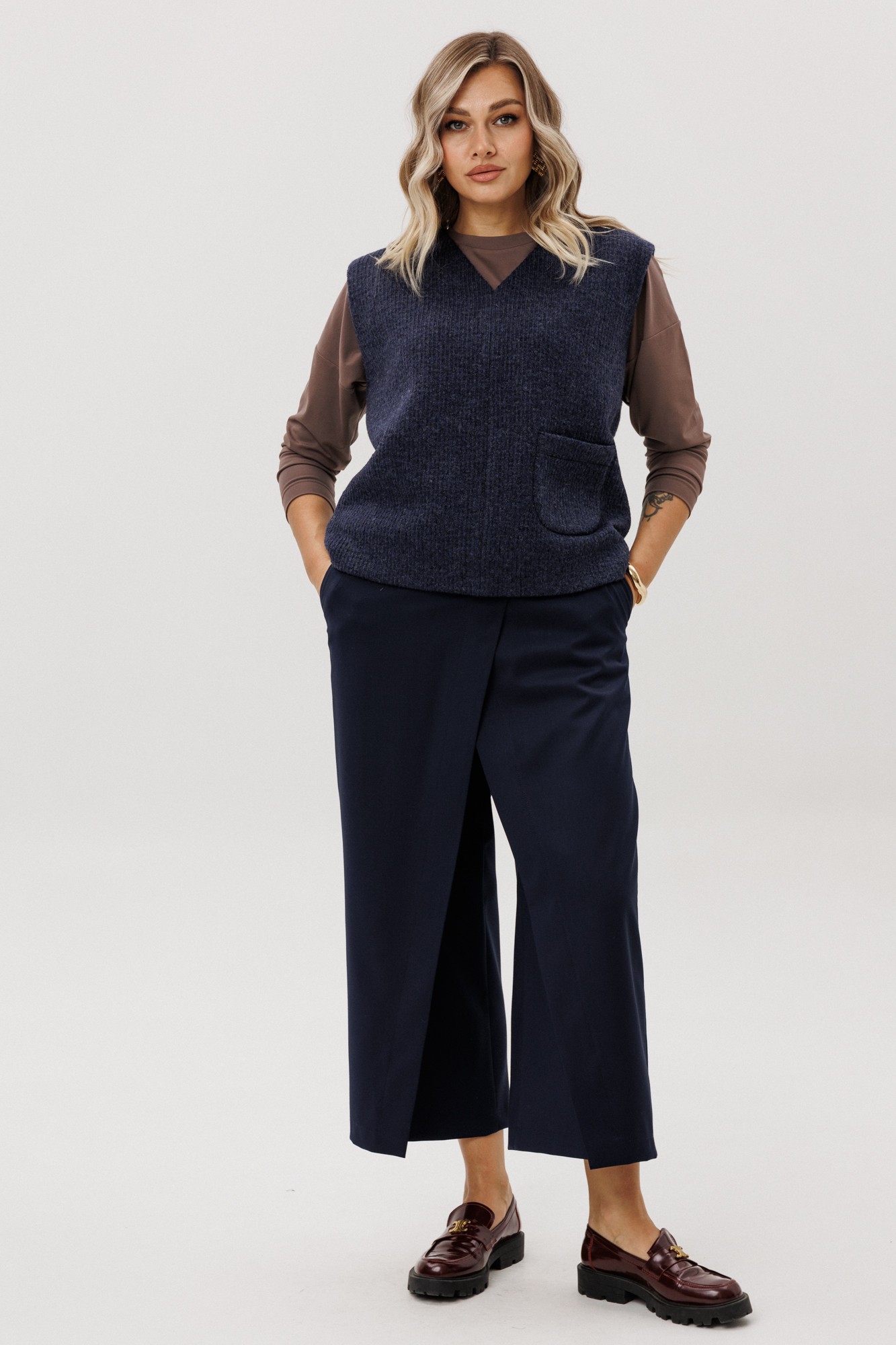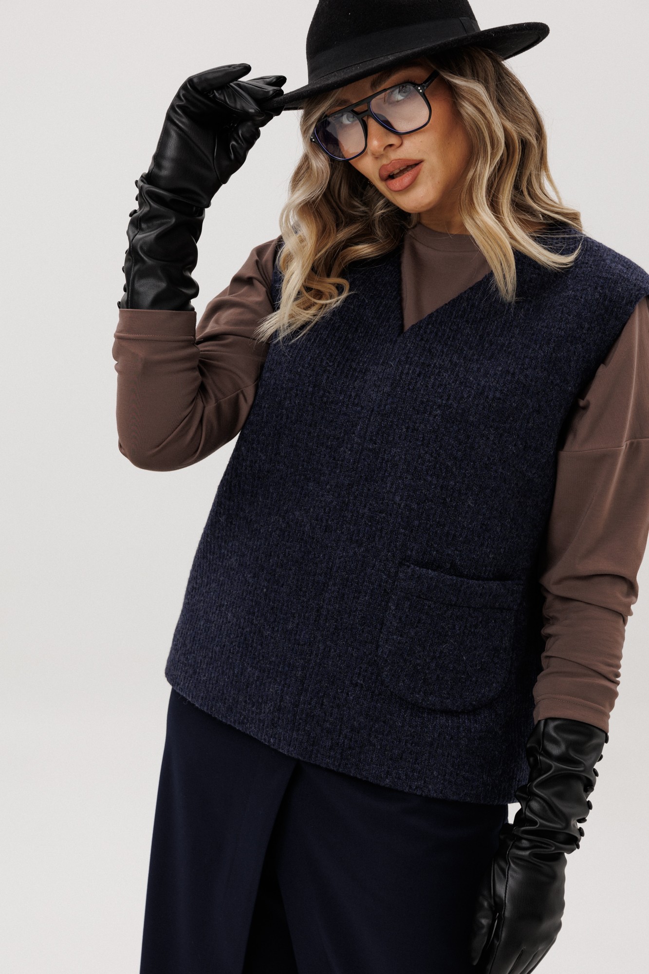 Жилет из полушерстяного вязанного полотна на трикотажной подкладке без застежки.